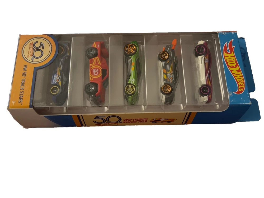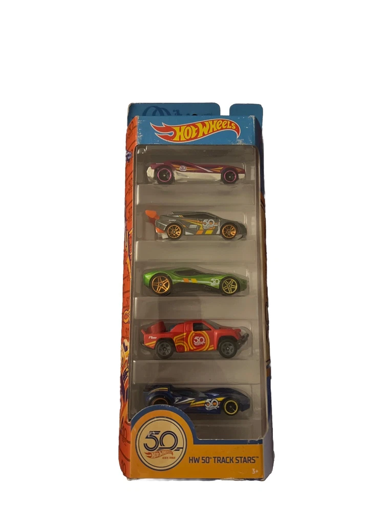 Hot Wheels HW 50th Track Stars 5 pack Gift set includes a collection of multi-colored cars from the Hot Wheels Track Stars series, perfect for children aged 3 and up. This set features vehicles from various brands and models, making it an exciting addition to any toy car collection. Made by Mattel in Indonesia, these diecast cars are sure to provide hours of fun for both boys and girls who enjoy playing with cars and trucks. Ideal for imaginative play and racing adventures, this Hot Wheels gift set is a great choice for young car enthusiasts.