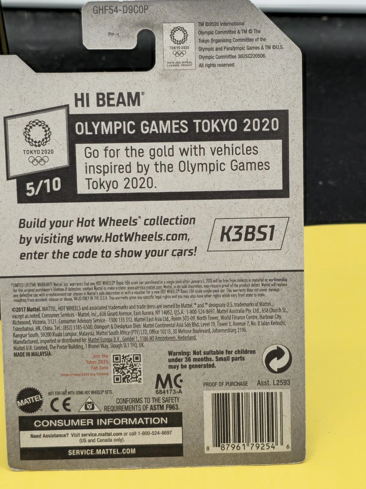 Scale: 1:64 Brand: Hot Wheels Year of Manufacture: 2020 Series: 2020 Tokyo Olympics Vehicle Make: Hi Beam UPC: Does Not Apply Vehicle Type: Car Recommended Age Range: 3+ Features: Limited Edition, Special Edition, Unopened Box Theme: Olympics Color: White Gender: Boys and Girls Model: Hi Beam gtin13: Does Not Apply Vehicle Year: 2020