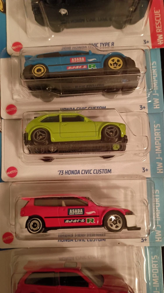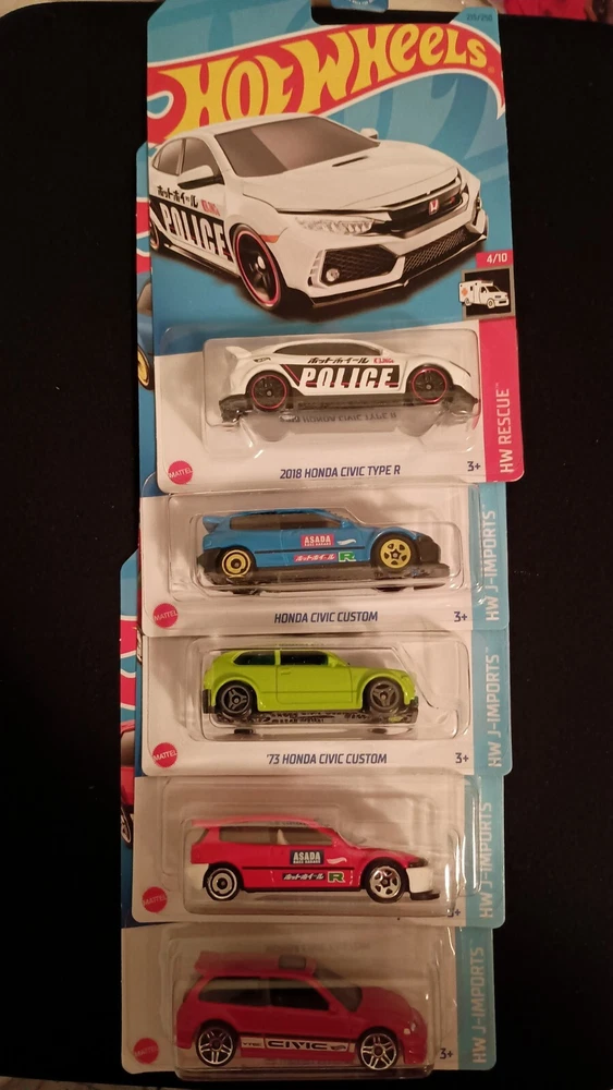 For all the Honda enthusiasts out there, this Hot Wheels 5 car lot is a must-have addition to your collection. The set includes a 1973 Honda Civic, a Type R, a VTEC, a 73 Custom, and an Asada Race Garage model. Each car is made of high-quality diecast material and is to scale (1:64). These Hot Wheels cars are perfect for collectors, kids, or anyone who loves racing games. Get your hands on this amazing set today!