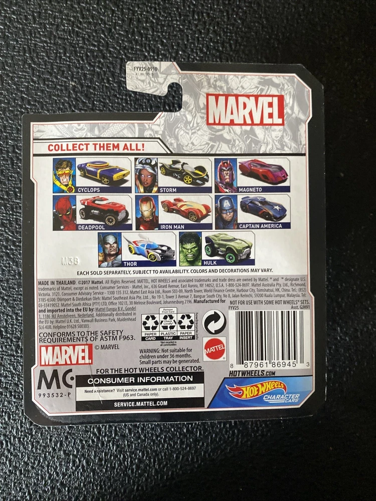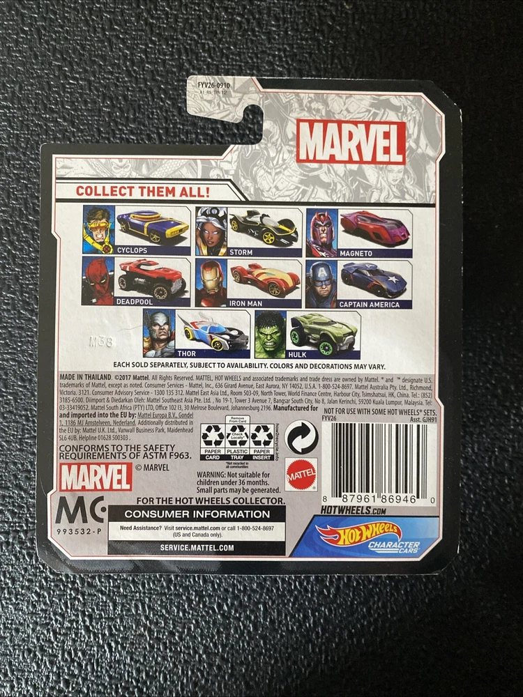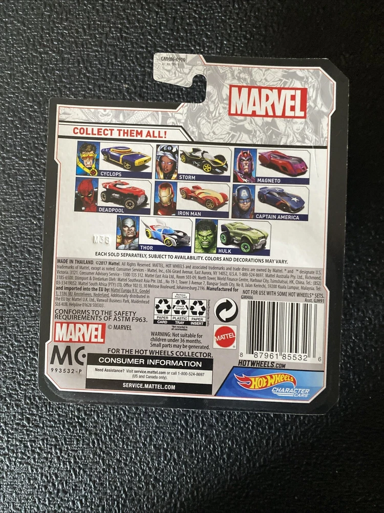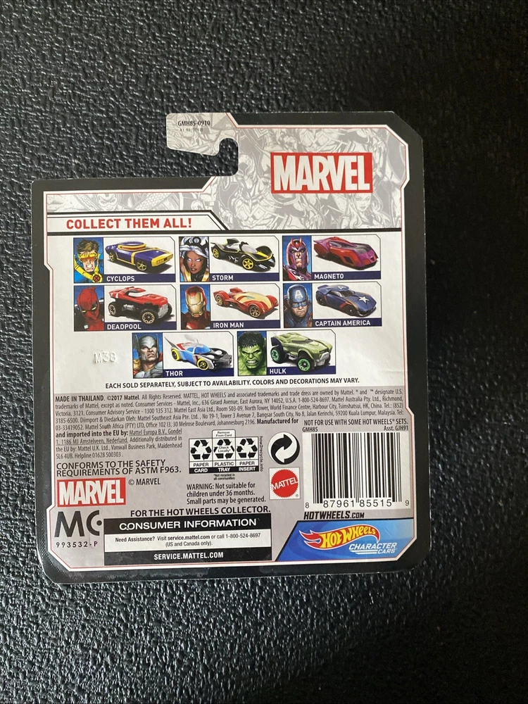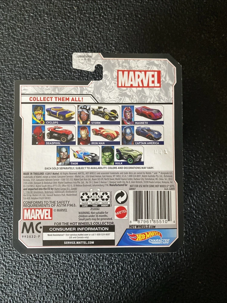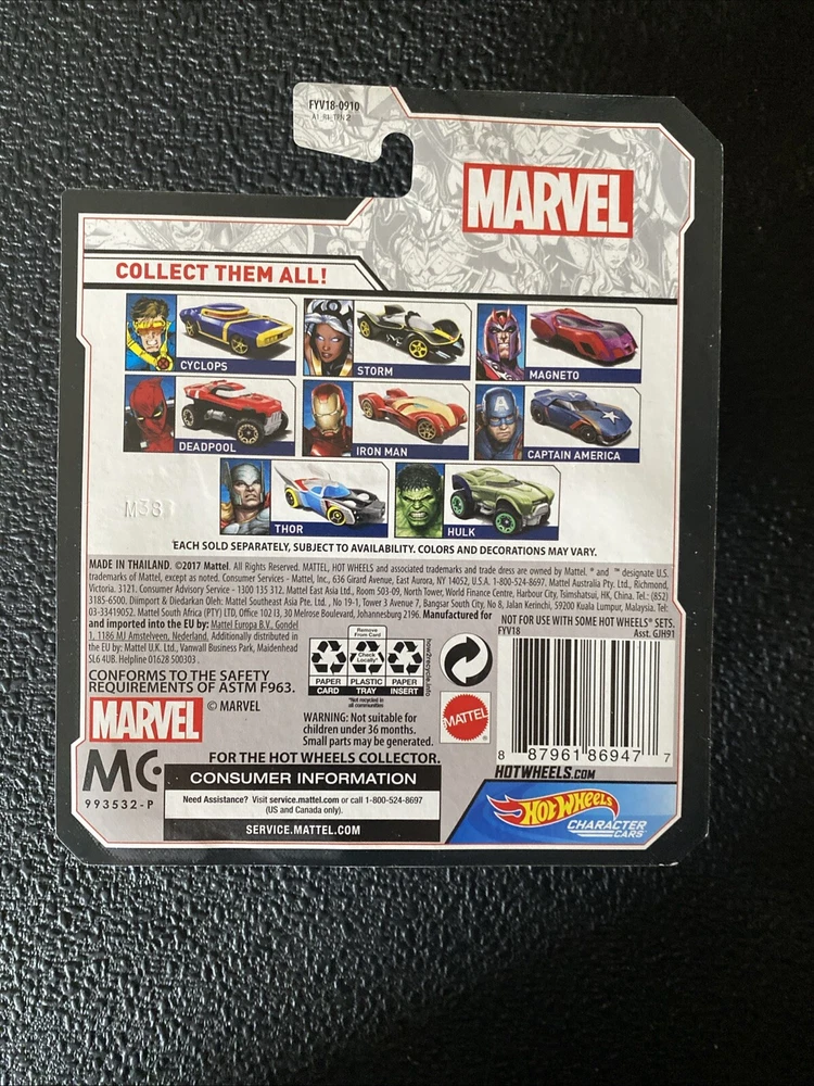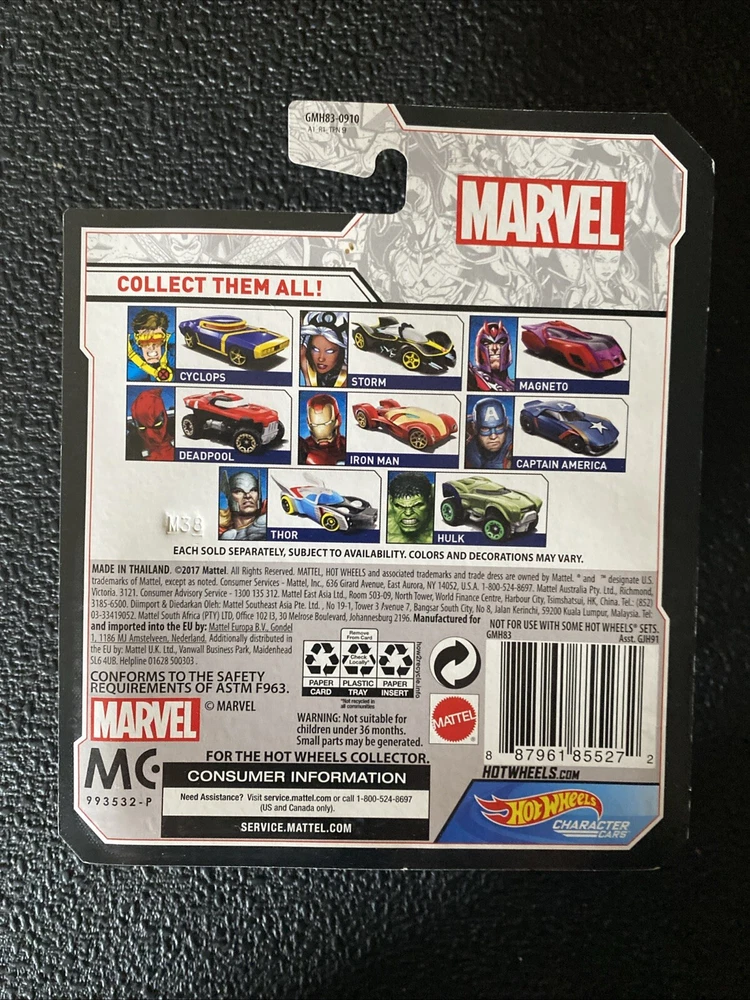 The Hot Wheels Marvel Character Cars set of 8, released in 2017, features diecast vehicles showcasing various Marvel characters. Each car in the set is designed in a colorful and detailed style, capturing the essence of the Marvel Universe. This set is part of the Hot Wheels Marvel series, with each car being in a 1:64 scale and packaged in an unopened box. Perfect for collectors and fans of both Hot Wheels and Marvel, this set offers a fun and collectible way to bring favorite comic book characters to life. Characters include Cyclops Storm Magneto Deadpool Iron Man Captain America Thor Hulk