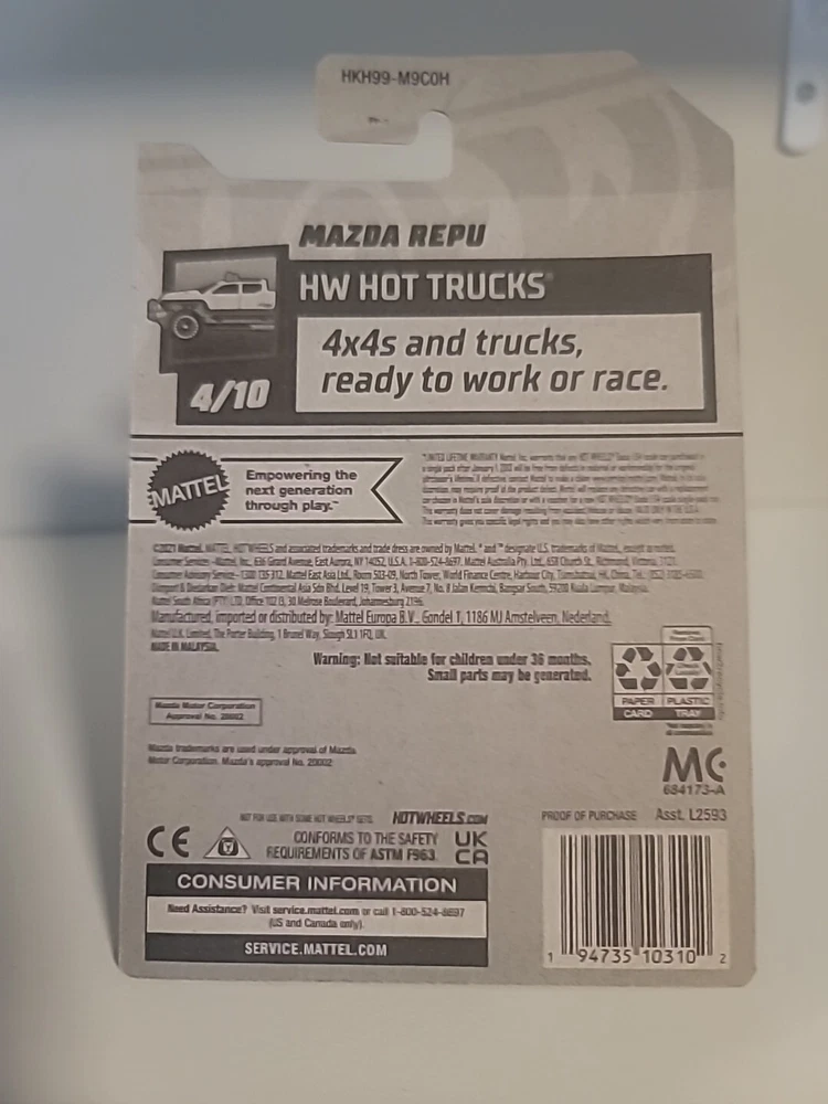 This Hot Wheels Mazda Repu Mini Truck is a must-have for any diecast vehicle collector. With its vibrant blue color and 1:64 scale. Featuring a 1974 Mazda Repu model, this Hot Wheels Hot Trucks series toy is an unopened box item, making it a great addition to your collection making it perfect for display on a shelf or diorama, customize and play with.