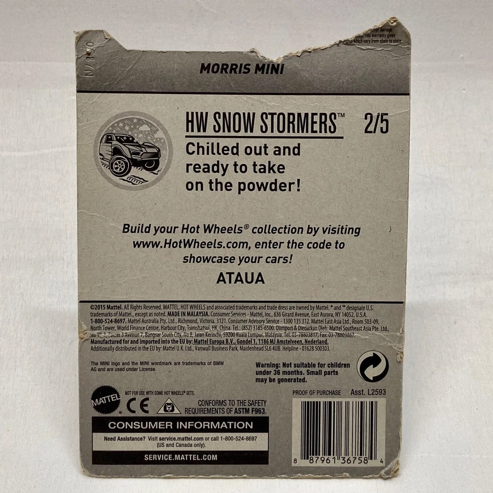 This Hot Wheels Mini Morris 231/365 HW Snow Stormers 2/5 die-cast 1:64 car is a perfect addition to any snow vehicle or mini morris collection. With a light blue color and a scale of 1:64, it is a great gift for boys and girls aged 3 and up. The car is made of high-quality materials and was manufactured in Malaysia in 2015. The Hot Wheels Mini Morris 231/365 HW Snow Stormers 2 / 5 die-cast 1:64 car is part of the HW Snow Stormers series and is perfect for collectors and kids alike. It is a great way to encourage creativity and imaginative play. Get this Hot Wheels car today and add it to your collection! Same Day Shipping Thank you for shopping TKO Specialties