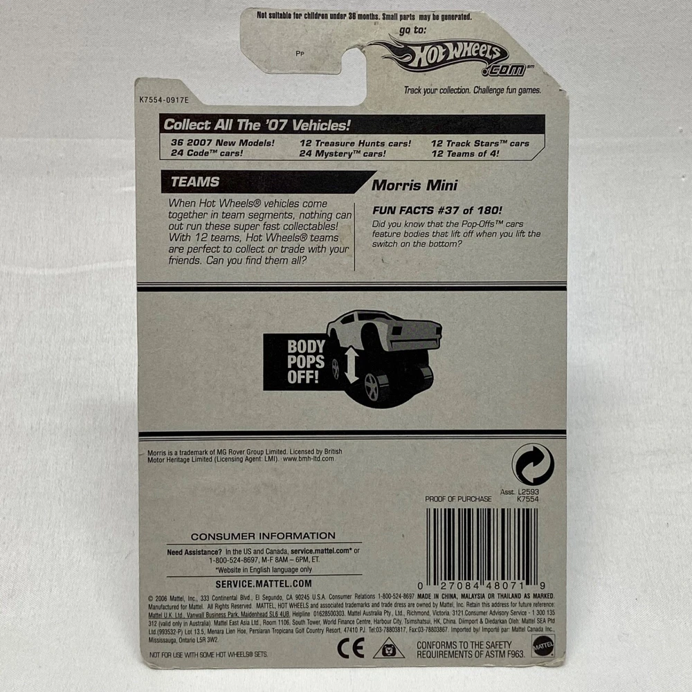 This Hot Wheels Mini Morris Pop-Offs die-cast model car is a must-have for any collector or fan of Hot Wheels. With a scale of 1:64, this limited edition car is a perfect addition to your collection. The car comes in an unopened box and is part of the HW Pop-Offs series. The Morris car is white in color and features the HW theme. This model car is not customized and was manufactured in 2006. Same Day Shipping and packaged with Care. Thank you for shopping TKO Specialties