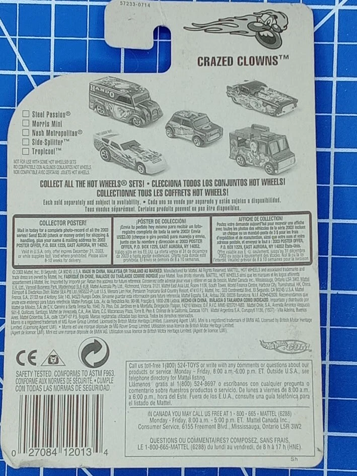 Hot Wheels Morris Mini #096 Red 2003 Crazed Clowns 2/5 With Yellow 5 Dot Rims SKU#104354 PLEASE READ BEFORE PURCHASING Condition: Please review all photos carefully for details on the item?s condition. Photos are part of the description, and any notable flaws will be highlighted. Combined Shipping: If purchasing multiple items, request a revised invoice before paying to ensure accurate combined shipping costs. eBay?s system may not calculate this correctly, leading to overcharges. Lighting Disclaimer: Photos are taken under bright lighting to highlight details, which may cause slight variations in color or hue depending on your lighting. If you need additional photos (e.g., in natural light) or more details, please ask before purchasing. As-Is Items: Items marked ?AS-IS? are untested and sold at a discount. These items may work but could also be better suited for parts. Refunds will cover only the item price, not shipping. What?s Included: Only the items shown in the photos and described in the listing are included in the purchase. Try it out: Before you try to operate your new purchase, we strongly recommend that you have the checked and serviced (lube, oil, batteries if required) We strive to describe items thoroughly and provide clear photos. If you have any questions or concerns not addressed in the listing, feel free to ask before purchasing. Thank you for shopping with us!