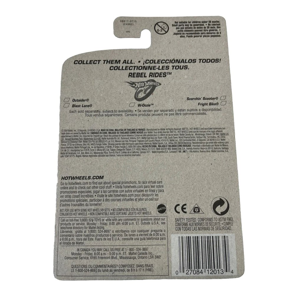 Series:Hot Wheels Rebel RidesVehicle Year:2004Material:DiecastCustomized:NoScale:1:64Gender:Boys & GirlsModel:Rebel RidesVehicle Make:Hot Wheelsgtin13:Does not applyCountry/Region of Manufacture:ThailandBrand:Hot WheelsColor:GreenAutographed:NoVehicle Type:MotorcycleRecommended Age Range:3+Character Family:Rebel RidesUPC:Does not applyTheme:Rebel RidesYear of Manufacture:2004Features:Unopened Box, Special EditionMPN:G6817-0715