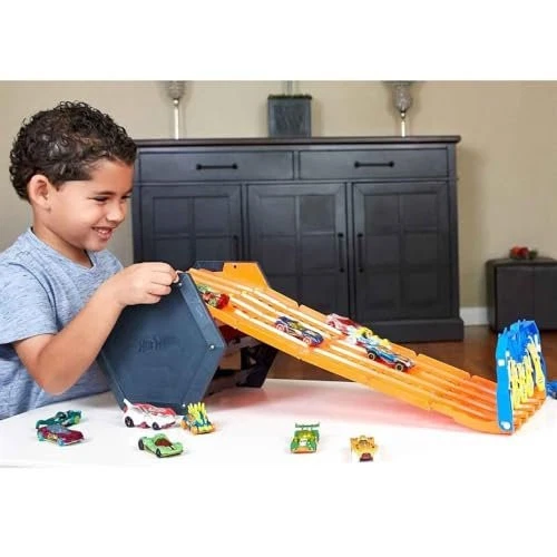 Hot Wheels Roll Out Raceway, Track Set The Hot Wheels Roll Out Raceway combines racing and storage in one cool and convenient package When collapsed, the Hot Wheels Roll Out Raceway serves as a bucket that can hold up to 80 die-cast vehicles and 5 track pieces It includes a carrying-handle for easy portability When unrolled, the Hot Wheels Roll Out Raceway is a 5-lane raceway, with a fair start mechanism and a finish line that shows the winner -- up to 5 cars can race at one time The tracks can connect to other sets (sold separately) for extended racing and enhanced challenges With a car included for action right out of the box, the Hot Wheels Roll Out Raceway set is an awesome gift for kids 4 years and older