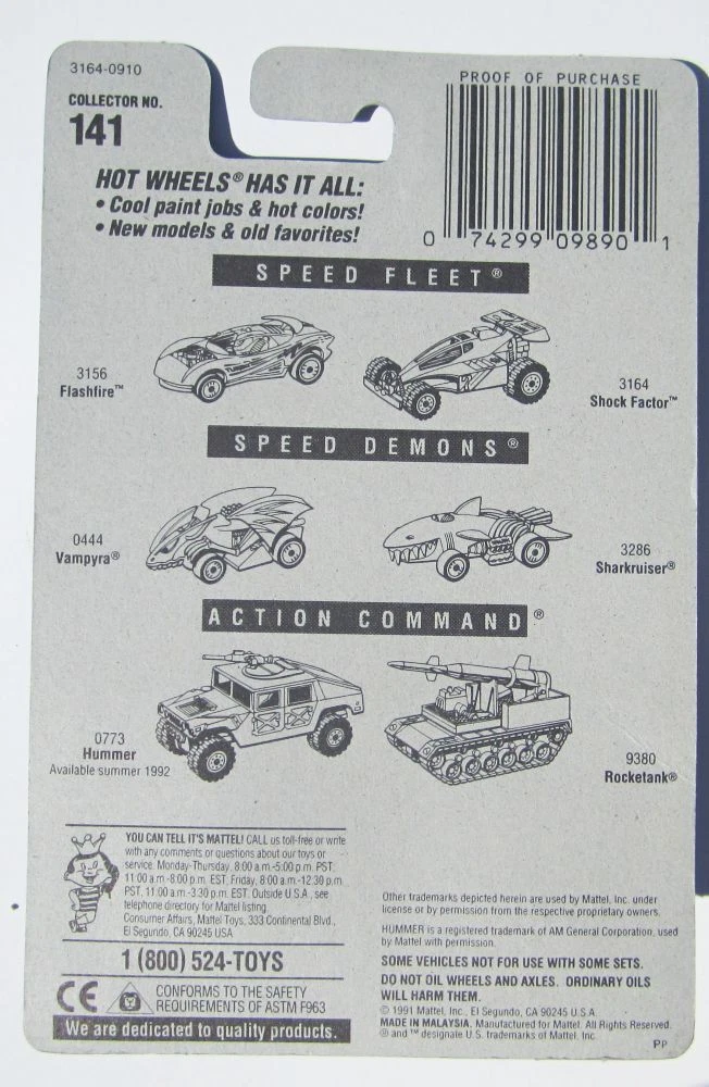 1992 Hot Wheels SShock Factor in black and pink, Collector #141, mint on card. Picture shows the actual item you are buying. Windshield: N/A Interior color: pink Country stamp: Malaysia Base color: unpainted metal Card condition: Very good overall, a few tiny spots of sticker damage, sticker residue, minor edgewear, minor corner wear. Flat. Blister is fine. Ships FAST in a sturdy unmarked cardboard box! No worries! If you are buying multiple cars, we offer combined shipping for actual ship cost, based on total weight only. Simply "Agree to Buy" the items, then choose "Request Invoice from Seller." We will send invoice with ACTUAL total ship cost. RETURNS: Accepted ONLY if item is still in its originally shipped condition. We do not accept items that have been opened or altered by the buyer. CLICK OR TAP HERE TO SEE ALL THE HOT WHEELS LISTINGS IN OUR EBAY STORE! Tons of items, nearly all of them SEALED and NEVER OPENED! CLICK OR TAP HERE to visit our eBay Store and save on shipping with ONE INTERNET STOP! With over 1500 different items to choose from, we have something for every kid on your list (even the big ones)! Buy with confidence from us -- we have over 20 years experience selling on eBay and other venues!