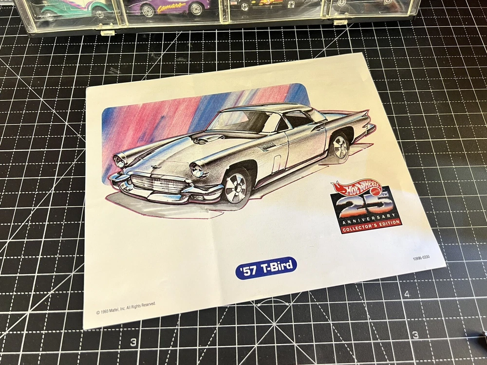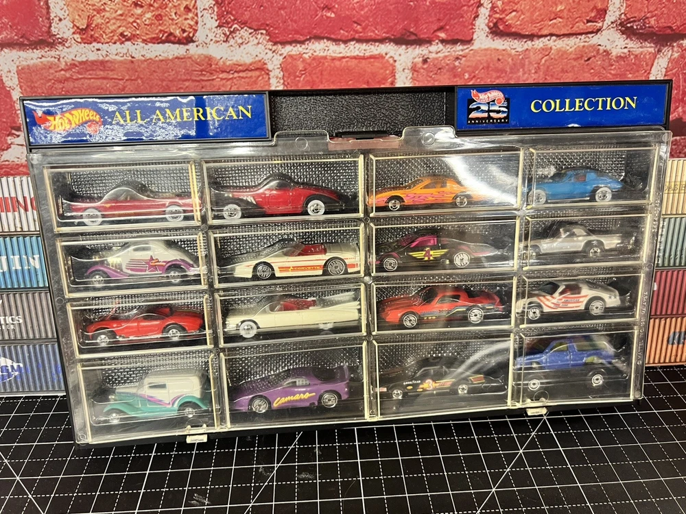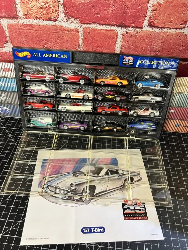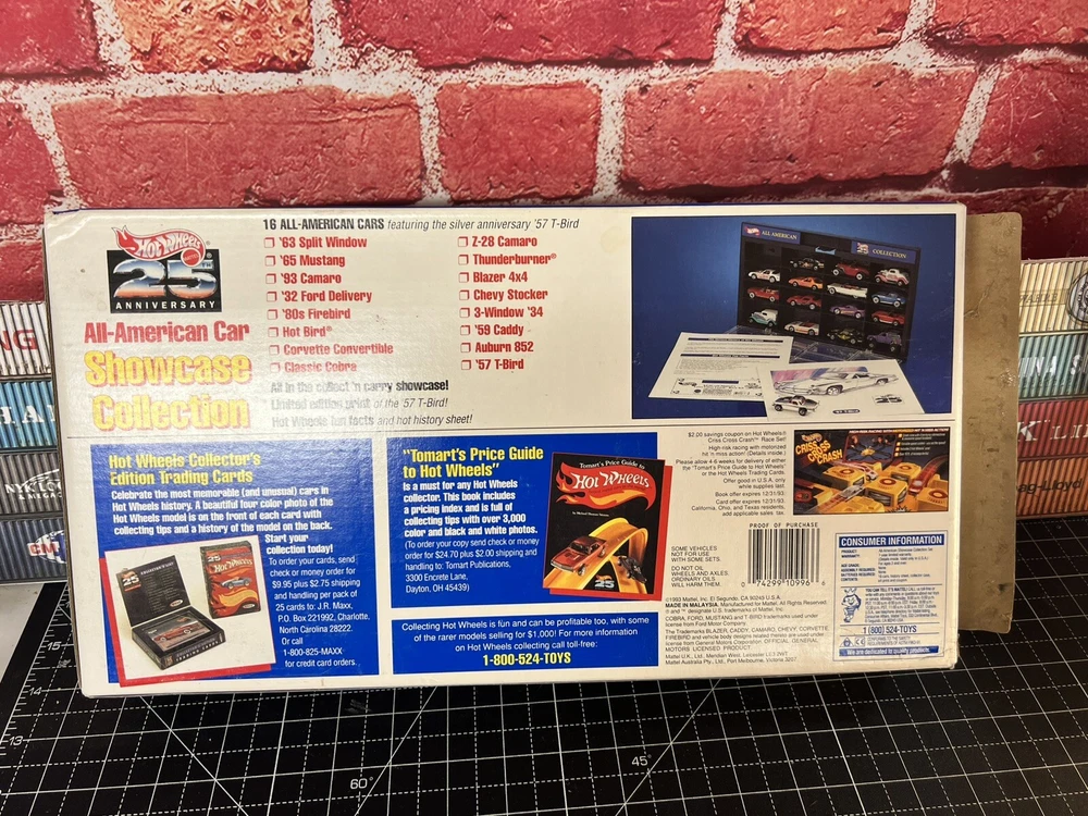 The Hot Wheels Vintage 25th Anniversary Showcase Collection Display Case Complete is a collectible display case featuring vintage Hot Wheels cars. It is part of the Hot Wheels brand and is designed to showcase a special collection of cars in celebration of the 25th anniversary. This set is brand new and was only opened to verify everything was inside. Plastic holder for cars is still in place holding cars in their place so they don’t roll around or suffer any damage. Case cover is still clear with only a slight warp which is common for these sets. Its in pristine condition, was never mounted and the cars were never removed. Poster is still intact and of course included. Has original crease from being folded in the box. Please ask as many questions as you need to 🫡 This is a no reserve auction.