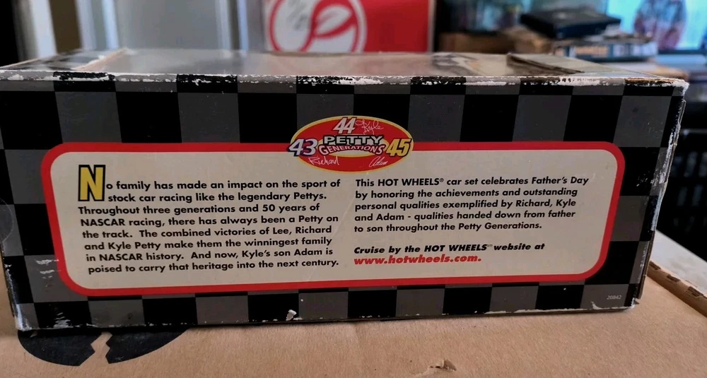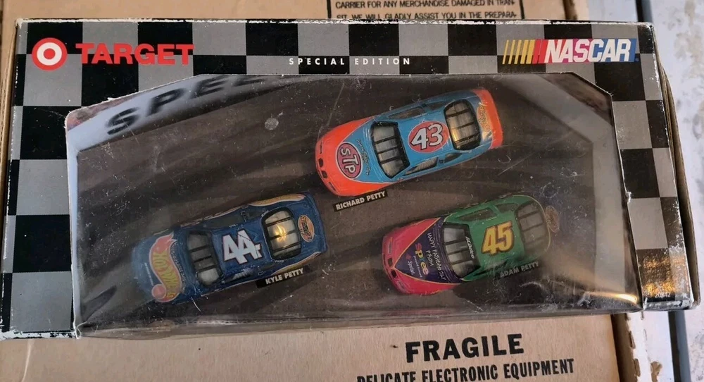 Hot Wheels Pro Racing set 3 Nascar set featuring Petty racing #43; Richard Petty #44 Kyle Petty #45 Adam Petty Pontiac Grand Prix Nascar cars Special Edition 1998. Target Box has some minor damage, unopened.