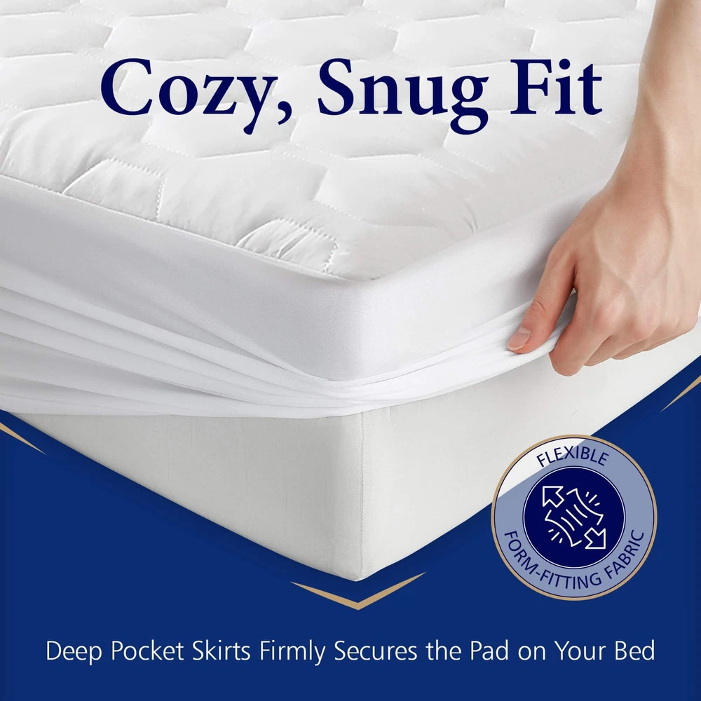Upgrade your sleep experience with our luxurious mattress pad. Crafted with premium materials, this pad adds an extra layer of plush comfort to your mattress, ensuring you wake up refreshed and rejuvenated every morning. The quilted top surface provides a cozy, cushioned feel, while the hypoallergenic fill prevents allergies and ensures a healthy sleeping environment. Designed to fit snugly on your mattress, this pad stays in place throughout the night, eliminating bunching or shifting. Whether you have a firm or soft mattress, this pad will enhance the overall comfort level, cradling your body in cloud-like softness. Easy to care for, simply machine wash and tumble dry for long-lasting freshness. Treat yourself to the restful slumber you deserve with our exceptional mattress pad. MATTRESS PROTECTOR: Mattress Pad will not only restore your mattress’ look to a beautiful appearance, but it will protect your current mattress from any further damage. By acting as a protective barrier, mattress pad helps shield your mattress from spills, stains, and general wear and tear, effectively prolonging its lifespan. SOFT & SMOOTH POLY-COTTON MATERIAL: mattress pad combines of the best materials for bedding; cotton and polyester. The Mattress pad has the softness and smoothness that polyester offers and the comfort and coolness is delivered by the high quality cotton we material. HYPOALLERGENIC: Made from high quality cotton and polyester has been designed from hypoallergenic materials to ensure a comfortable and easy sleep. DURABLE AND LONG LASTING: Mattress Cover is made from high quality material ensuring it will not fade or fall apart even after years of use. QUICK AND EASY TO FIT ON BED: Simply slip our mattress pad over your mattress, secure it with the elasticized skirt, and enjoy instant comfort and protection.
