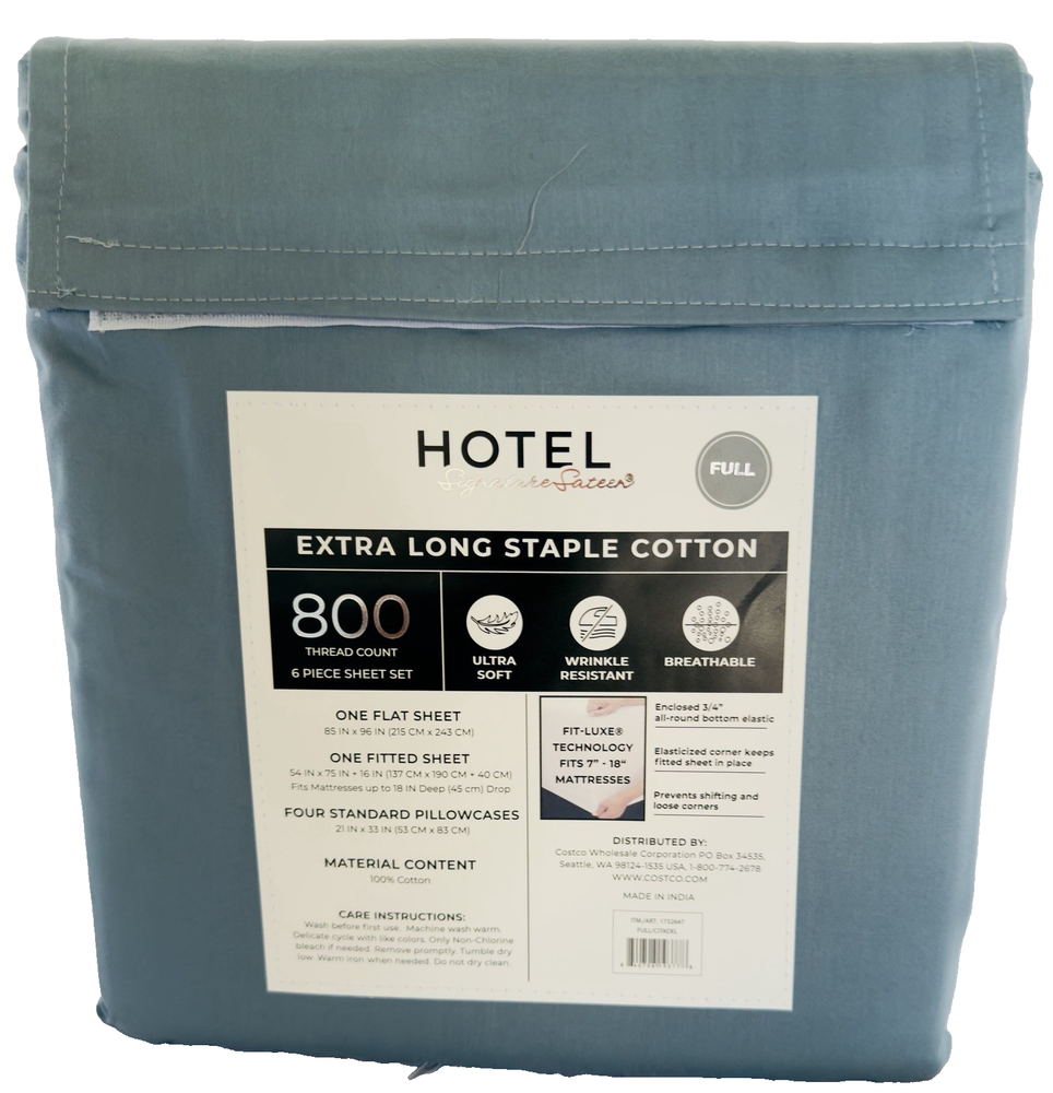 Hotel Signature - 800TC Sheet Set 6pc Full Blue Cotton Ultra Soft Bedding. -NEW WITHOUT TAGS - CUSTOMER RETURN FROM WHOLESALE CLUB - EXCELLENT CONDITION FREE SHIPPING Introducing the Hotel Signature 800TC Sheet Set in a luxurious blue color. This 6-piece set is made of ultra soft 100% cotton, perfect for a comfortable and relaxing sleep experience. The modern and stylish design features a solid color pattern in a rectangular shape, ideal for adult use in the bedroom. Easy to care for with instructions to machine wash and tumble dry, this bedding set exudes luxury and sophistication for a high-end hotel feel in your own home.