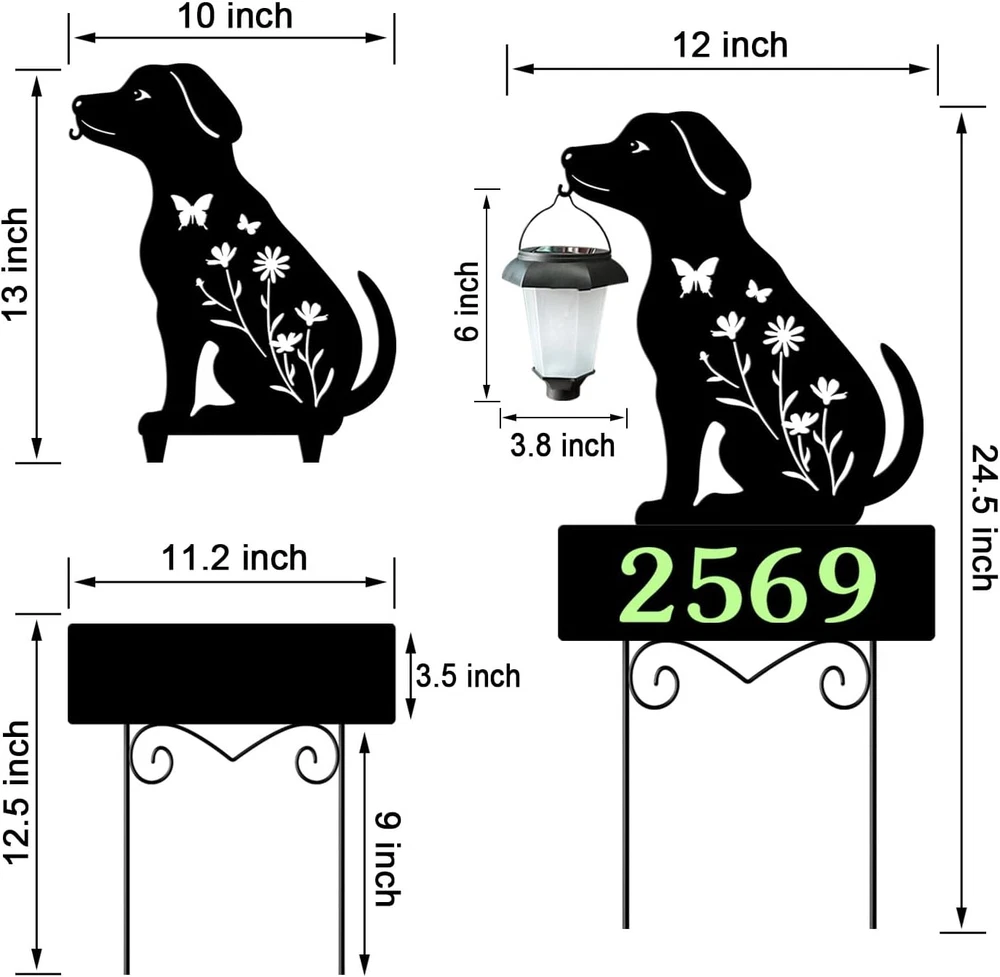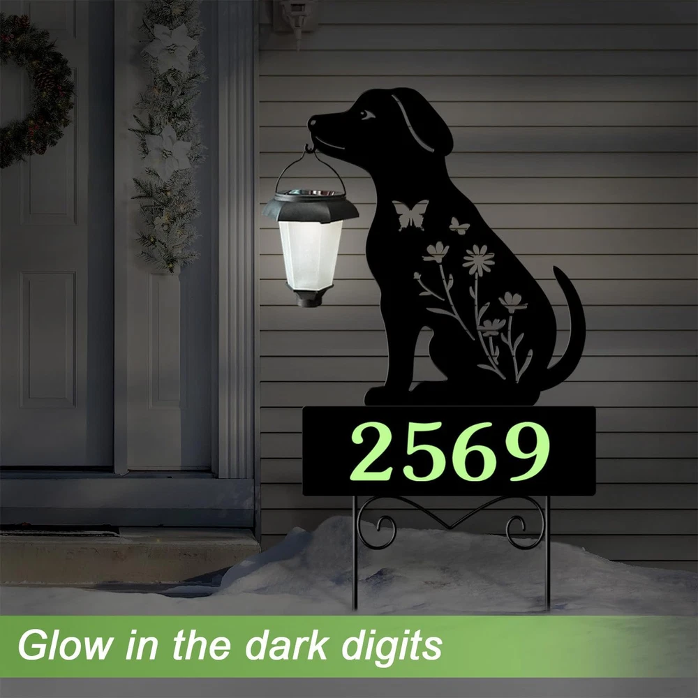 Modern house numbers Add a touch of elegance to your home with the black plaque and glow in the dark numbers, creating a modern and sophisticated house number display for outside. House address signs Ideal as a gift for garden enthusiasts, these solar stake lights not only serve as functional house numbers but also as decorative garden art, adding charm and character to any outdoor setting. Outside decorations for yard The waterproof design ensures that these yard signs can withstand various weather conditions, making them perfect for outdoor use all year round. Garden decor for outside Enhance your outdoor decor with these stylish metal black dog silhouette garden stakes featuring a solar lantern with glow in the dark house numbers for a unique and eye-catching look. Solar house numbers at night with the built-in solar-powered lights that automatically turn on when it gets dark, providing a warm and inviting ambiance to your outdoor space. Product Description Solar house numbers for outside Modern house numbers Lighted address signs for houses Black house numbers