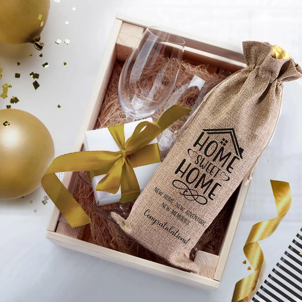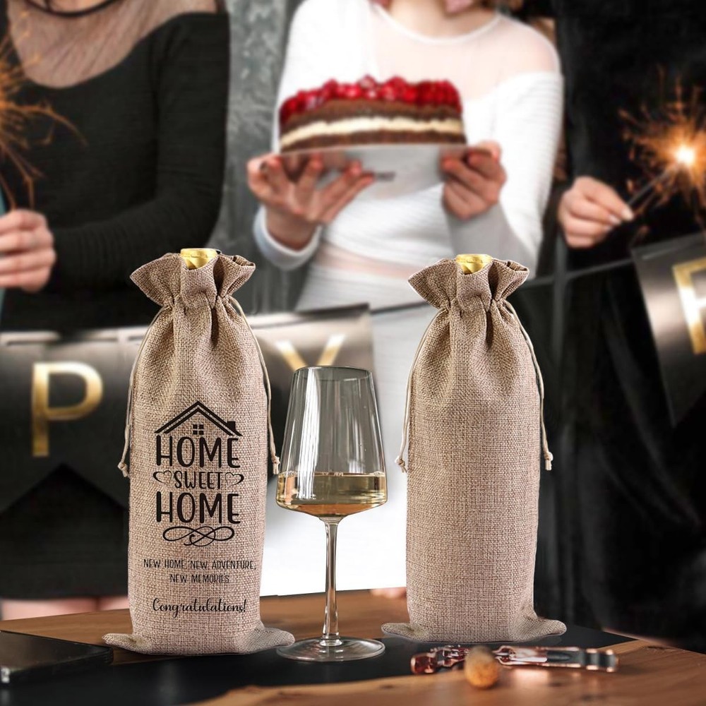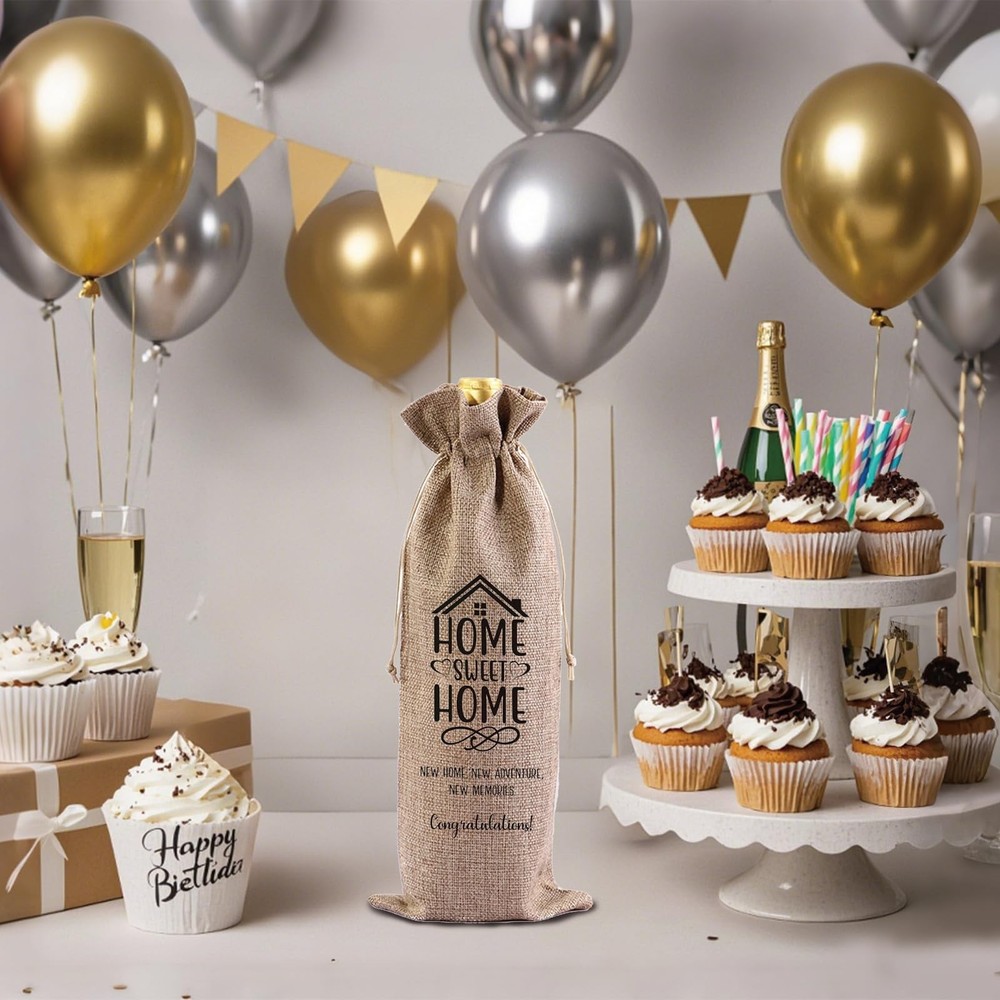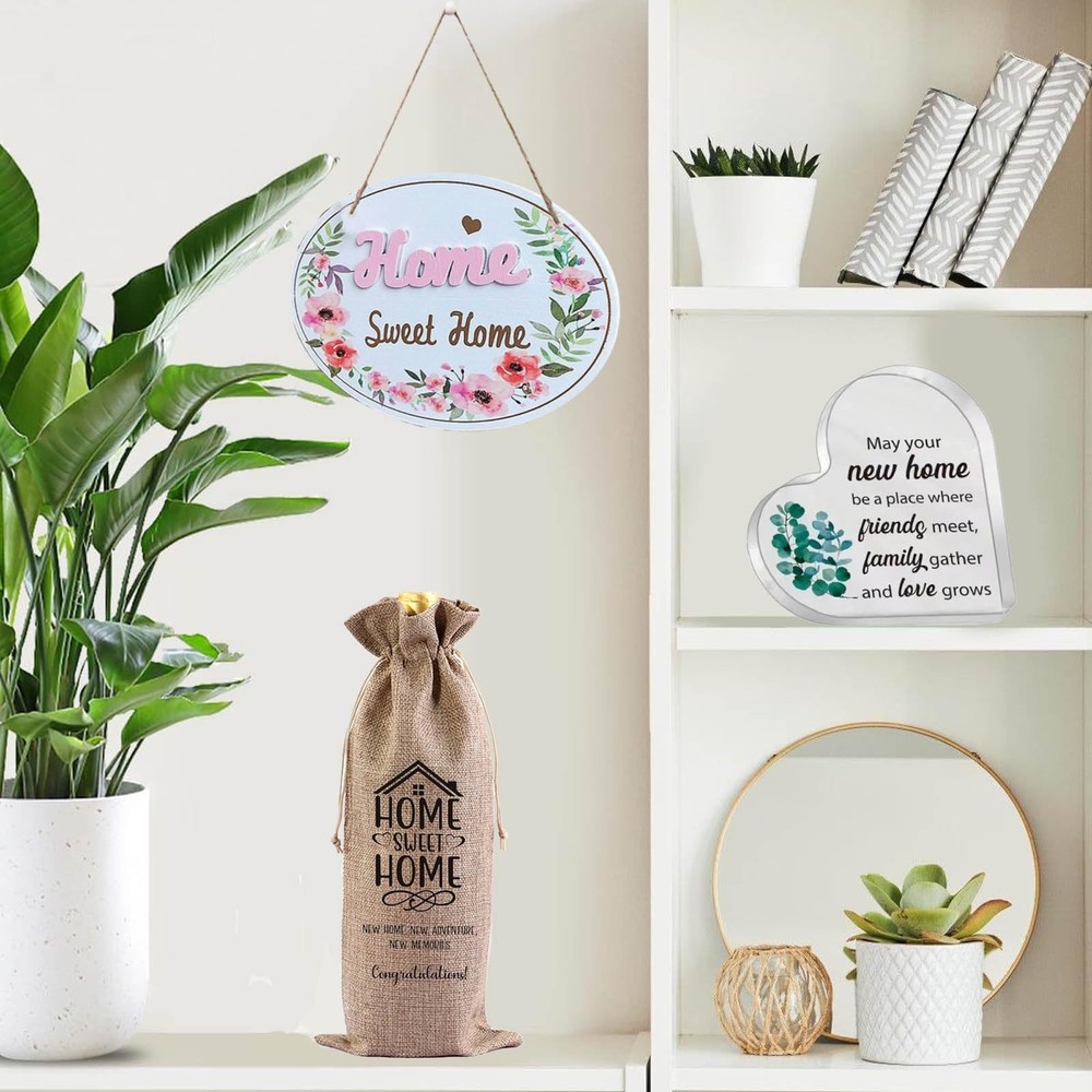 Make a new house feel like home with this thoughtfully curated 4-piece housewarming gift set. Perfect for celebrating friends or family moving into their new space, this collection includes a charming wooden 'Sweet Home' decorative sign that adds warmth to any room. The set also features a heartfelt keepsake memento to mark this special milestone, a stylish wine bag for that perfect bottle, and a practical yet decorative keychain - ideal for those new house keys! Each piece has been selected to combine both functionality and sentiment, making this the perfect way to welcome loved ones to their new address. This comprehensive gift set takes the guesswork out of housewarming present shopping, offering multiple ways to show you care about their new beginning. π‘ Housewarming Gifts for New Home β Thoughtful and Practical π Celebrate a loved βs new beginning with this carefully curated housewarming gift set, designed to bring joy and comfort to their new space. This thoughtful collection includes a charming wood door decor, a heartwarming keepsake, a stylish keychain, and a reusable wine bag β perfect for welcoming the new homeowner to a place full of fresh starts and new memories. π‘ Charming Home Door Decoration β Warm Welcome π Add a personal touch to any home with this beautifully designed door sign. The style makes it perfect for both indoor and outdoor spaces. Featuring reserved holes and a rope, itβs easy to hang on walls, doors, or handles. Ideal for seasonal decorations, it can be displayed year-round and for various holidays such as Christmas, Halloween, and Thanksgiving, making it a versatile gift for any occasion. π‘ Sweet Home Keepsake β A Heartfelt Gesture π Commemorate the excitement of moving into a new home with this lovely heart-shaped keepsake. With the words βNew Home Sweet Homeβ printed on it, this ornament serves as a beautiful reminder of new beginnings. Sized at 3.93 x 3.93 x 0.39 inches, it can be displayed on countertops, shelves, or even used as a decorative paperweight in the office, making it a meaningful and lasting gift for any new homeowner. π‘ Keychain Gift for Family & Friends β Perfect for Housewarmings π This stainless steel keychain is the perfect addition to any housewarming gift. Engraved with a heartfelt message, itβs a charming token for newlyweds, new homeowners, or anyone celebrating their move. Compact at 30 x 30mm, itβs a durable keepsake that will remind them of their fresh start in their new home π‘ New Home Wine Bag Gift β Celebrate in Style π Bring sophistication and eco-consciousness together with this reusable wine bag. Crafted from sustainable materials, itβs designed to hold wine or champagne bottles with an elegant top drawstring closure. Measuring 13.8 x 5.9 inches, itβs perfect for gifting wine at a housewarming party or simply celebrating a new chapter in life while reducing waste.