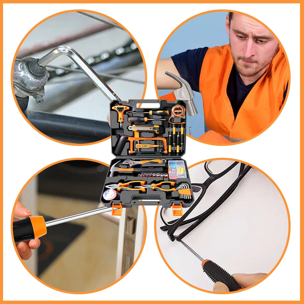 【HIGH QUALITY TOOL SET 】The home tool kit with case is forged from high-quality steel and finished in high-polish chrome for durable strength and anti-corrosion. 【COMPLETE H OUSEHOLD TOOL SET】 This basic tool kit for home contains most of household tools for doing DIY projects,home repair and daily use,includes hacksaw,adjustable wrench,claw hammer,pliers,ratchet wrench,drive sockets,screwdrivers,utility knife,tape measure,voltage tester pen,insulation tape,allen wrench,hardware kits and screwdrivers bits connectors. 【PORTABLE TOOL SET FOR HOME】 Starter tool kit for household is organized in a folding sturdy handy blow molded storage case,easy to carry and storage without taking up much space. 【HOME TOOL KIT FOR ALL PURPOSE】 You can use this tool box sets for men to do jobs such as putting up pictures,assembling furniture,hanging tv and do home repairs around the house.The diy tool kit is also a warming gift for men on Father's Day or women,college students,handyman,homeowner,construction workers or staters on Birthday and Anniversary. 【YOUR STARTER BASIC TOOLKIT】 One home maintenance tool kit helps you to resolve all repair jobs.All set of tools are made of soft grip handle,lightweight and comfortable to hold,all the household tools for home in the tool box set with tools meet or exceed the ANSI. 【 INCLUDED COMPONENTS 】 1 x Ratchet Wrench,2 x Screwdrivers,4 x Precision Screwdriver Set,1 x Utility Knife,1 x Tape Measure 3m (10ft),1 x Voltage Tester Pen,1 x Hack Saw,8 x Hex Key Wrenches,9 x Drive Sockets,1 x Adjustable Wrench,1 x Claw Hammer,1 x Long Nose Pliers,1 x Slip Joint Pliers,1 x Insulation Tape,1 x Hardware Accessories Kit,30 x Screwdrivers Bits Connectors,3 x Saw Blades,10 x Utility Knife Blades,1 x Carrying Case Why Choose OUR Home Tool Kit with Case? Handsaw 2-in-1 hacksaw with 3 replaced blades,suitable for cutting wood and plastic pipe. Ratchet Wrench Includes 1 ratchet handle and 30 piece screwdriver bits,meet most of your needs for DIY Projects and home maintenance. Claw Hammer Our claw hammer is forged from high-grade steel and finished in high-polish chrome,perfect for carpentry,household repair, construction work and general maintenance. Pliers Set Our pliers set includes needle nose pliers and slip joint pliers, made of high-grade steel,perfect for home improvements and DIY projects. Adjustable Wrench Our adjustable wrench is made of High quality forged carbon steel,heat-treated for durability. Screwdriver Set Includes magnetic screwdrivers to attract screws,helping reduce dropped and lost fasteners. Precision Screwdrivers Comes with 6pcs precision screwdrivers for computer, watches, glasses repairs. Hex Key Allen Wrench Includes 8 diffrent size hex key set,made of chrome-vanadium steel for rugged strength,perfect for quickly tightening or loosening fasteners.
