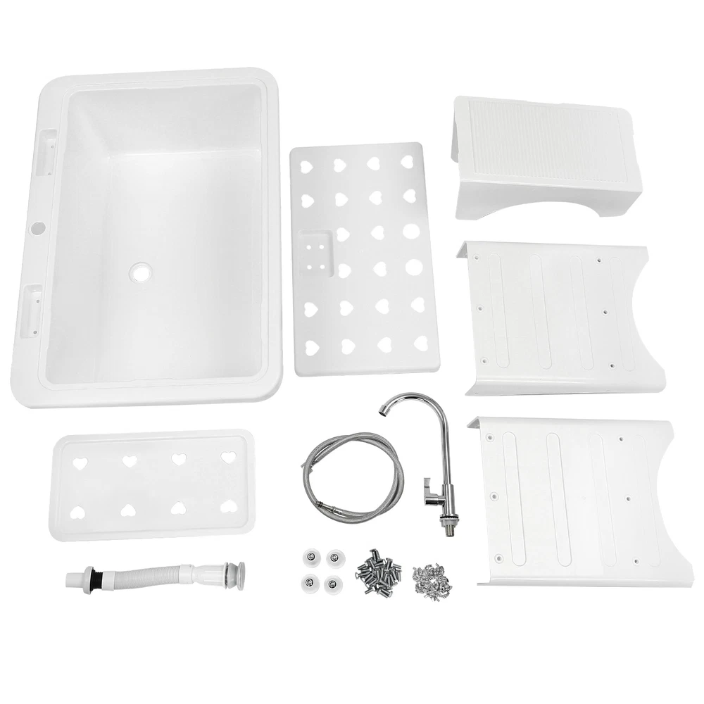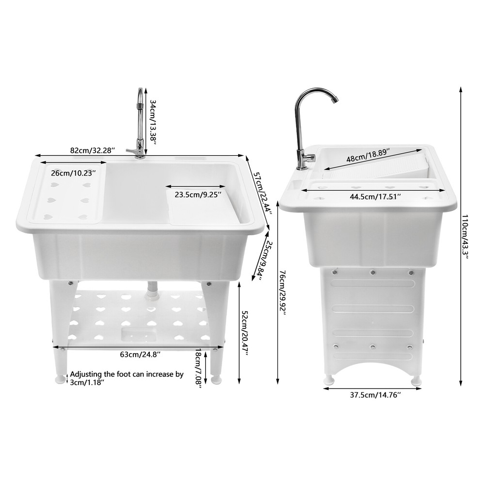 Household Large Size Wash Tub Utility Sink Freestanding Laundry Tub with Faucet Description Made of High-quality Pp, This Laundry Sink Is Sturdy and Durable, with Strong Load-bearing Capacity and Stability. the Versatile White Color Appearance and Smooth Lines Can Fit Well with Various Home Decor Styles. the Non-drilling and Hand-screwing Design Makes Installation Easier, and Its Large Sink Size Provides You with Enough Cleaning Space. with This Product, You Can Do Laundry While Standing, Avoiding the Strain of Bending over for Long Periods. Key Features Selected Material: the Premium Pp with the Injection Molding Process Makes This Product Environmentally Friendly, Rustproof, and Acid and Alkali-resistant , Ensuring a Long Service Life. Ergonomic Design: the 29.92" Overall Height(Not Including the Faucet) Reduces the Frequency of Bending and the Burden on Your Waist. the Water-stopping Edge Around the Sink Prevents Water from Splashing Onto the Floor and Keeps the Floor Dry to Avoid Slipping. High Stability: Thickened Material(Thickness: 2.8mm), Four Supporting Lage, Stable Rectangular Structure, Strong Screw Fixation, and Reinforcing Rib Make Its Weight Capacity up to 220.46 Lbs, and the 1.18in Adjustable Feet on the Bottom of the Sink Can Adapt Well to Uneven Ground, Making the Product More Stable and Safer to Use. Large Size: the Large Sink Size (32.28*22.44*9.84 in) Allows You to Clean Large Amounts of Clothes and Wash Pet Cats and Dogs Inside. Its Large Capacity (29.06gal) Makes It a Convenient Water Storage Sink When Plugging the Drain Stopper. Effortless Installation: Its Simple Structure, Standard Threaded Connector, Convenient Wing Nuts, and Complete Installation Accessories Allow You to Easily Complete the Installation in a Short Time Without Additional Tools. Washing Assistant: a 360° Rotatable High Faucet (Height: 13.39 in) with a Comfortable Handle Allows You to Easily Adjust the Water Flow, and Achieve Dead-end Cleaning . in Addition, a Removable Washboard and a Drain Board Can Adapt to Your Different Needs, and the Surface of the Washboard Is Designed with an Inverted Triangle to Better Remove Stains. the Bottom of the Sink Is Designed with a Concave Center to Drain Water Quickly. Hollow-out Design: the Lower Shelf and the Drain Board Are Multiple Hollows, Helping Quickly Filter the Residual Water on the Washing Items, so It Is Not Easy to Breed Bacteria . Easy to Clean: Due to the Smooth Surface, Simple Structure, and Open Design, You Can Easily Wipe off the Dirt on It with a Soft Cloth. Ideal Gift: This Product Is Stylish and High-quality and Can Be Used As an Ideal Housewarming, Birthday, and Holiday Gift for Parents, Friends, and Loved Ones. Good Customer Service: We Stand Behind All Our Guests and Look Forward to Assisting You with Your Purchase. It Is Our Pleasure to Answer Your Confusion and Questions. the End of the Story Between Us Is Not "We Sell and You Buy". Details Soap Grooves: Three Soap Grooves with Holes Can Help Place the Soap and Dry It, Providing Convenience for Washing Clothes. Stretchable Drain Pipe: It Can Be Bent into the Desired Shape According to the Installation Needs, Which Is Convenient for Drainage. Raised Bottom: It Facilitates Cleaning but Also Increases the Storage Space. Smooth Edges: the Rounded and Smooth Edges Not Only Add to the Aesthetics of the Product but Also Improve the Safety of Use. Application It Is Suitable for Cleaning Clothes, Pets, Pots and Pans, Fruits, Vegetables, Meat, Etc. in Laundry Rooms, Bathrooms, Utility Rooms, Garages, Basements, Kitchens, Balconies, Patios, Gardens, and so on. It Not Only Can Be Used As a Laundry Sink but Also Can Be Used As a Storage Rack, Pet Bathtub, Baby Bathtub, and so on. Specification Material: Pp Color: White Process: Injection Molding Assembly Required: Yes Faucet Opening: Single Hole Installation Method: Freestanding Style: modern Shape: rectangular Faucet Adjustable Angle: 360° Maximum Bearing Capacity: 100kg/ 220.46 Lbs Laundry Sink Capacity: 110l/ 29.06 Gal Water Inlet Hose Length: 1m/ 3.28ft Drain Pipe Length: 0.8m/ 2.62ft Faucet Height: 34cm/ 13.39 in Drain Board Size(L*W): 44.5*26cm/ 17.52*10.24 in Laundry Board Size(L*W): 48*23.5 Cm/ 18.9*9.25 in Sink Size: 82*57*25 Cm/ 32.28*22.44*9.84 in Bottom Shelf Size(L*W): 63*37.5 Cm/ 24.8*14.76 in Bottom Shelf Height from the Ground: 18 Cm/ 7.09 in Bottom Leg Height: 52 Cm/ 20.47 in Adjustable Foot Height: 3cm/ 1.18in Product Height (Including Faucet): 110 Cm/ 43.31 in Product Height (Not Including Faucet): 76 Cm/ 29.92 in Thickness: 2.8mm/ 0.11in Gross Weight: 11kg/ 24.25 Lbs Package Size: 83*57.5*31.5 Cm/ 32.68*22.64*12.4 in Package Included 1* Laundry Sink 1* Faucet 1* Drain Board 1* Laundry Board 1* Drain Stopper 1* Water Inlet Hose 1* Drain Pipe All Accessories for Installation Notes Please Allow the Slight Color Difference Caused by the Shooting Light and the 1-3 Cm Error Due to Manual Measurement, and Make Sure You Do Not Mind Before Ordering. Payment Delivery details Terms of sales About us Contact us Payment We accept ebay payment 。 Fees such as import duties, taxes are not included in the item price or shipping costs. These charges are the buyer's responsibility. Delivery details Shipping: 2-9 working days to: USA Terms of sales We maintain high standards of excellence and strive for hundred percent customer satisfaction. Feedback is very important to us. We hope that you contact us immediately before you give neutral or negative feedback, so that we can address your concerns. It is impossible to address issues if we do not know about them! About us Your satis faction is our ultimate goal. We work hard to earn your trust and future business. Our certified technicians have tested each item before shipping. The unit comes with 1 year limited warranty on all manufacturing defects. a) If you receive a defective item, you may return it or ask for a discount. Please contact us within 14 days after you receive the package. b) What