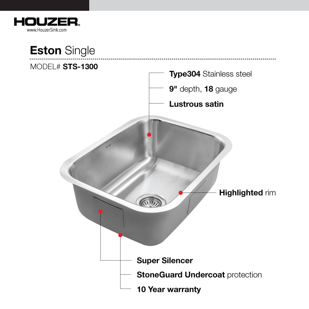 Powered by Frooition Top Products Kitchen Bathroom Lighting Fans Hardware Decor & Organization Houzer STS-1300 Eston 23-1/4" Undermount Single Basin Stainless Steel Kitchen Sink Overview Item Description Houzer Eston series undermount single bowl kitchen sink boasts a simple yet timeless design that effortlessly complements any kitchen aesthetic. Its deep drawn straight wall with a moderate radius ensures swift and easy cleaning, making it an ideal choice for busy kitchens. Crafted from heavy-duty 18-gauge stainless steel, this sink features a flawless lustrous finish with a highlighted rim, adding a touch of elegance to your kitchen space. The advanced StoneGuard undercoating, paired with the super silencer pad, effectively reduces the clattering sound of dishwashing, providing a quieter kitchen experience. Meets ASME 100.19.3-2000, UPC standards. This sink offers both quality and peace of mind, making it a timeless and reliable choice for your kitchen. Houzer STS-1300 Features: Covered under Houzer's 10 year limited warranty Constructed from 18 gauge stainless steel Undermount installation - sink will install under the countertop Single basin design for maximum work space Sound absorbent construction to prevent dish clatter and under cabinet condensation Center drain location provides optimal draining capability Coordinates with products from the Eston line All mounting hardware required for assembly is included Optional accessories - basket strainer (190-9180), bottom grid (BG-3600) and cutting board (CB-2500) Houzer STS-1300 Specifications: Sink Length: 23-1/4" (left to right) Sink Width: 17-1/2" (front to back) Sink Height: 9" (top to bottom) Basin Dimensions: 21-1/4" L x 15-1/2" W x 9" D Minimum Cabinet Size: 30" Drain Connection: 3-1/2" Why Choose BuildInc? OUR PROMISE TO YOU About Us At Build, we promise to provide the best selection we can, most competitive pricing, and unmatched customer service. Our store has quality home improvement products from trusted manufacturers like Moen, American Standard, Delta, Kraus, Kichler, Progress Lighting, Schlage, Kwikset, Baldwin, Broan, NuTone, Air King, and Rev-A-Shelf. With over 200,000 home improvement products for you to choose from, we have just what you need to get your project done. Fast & Free Shipping We promise to make it our priority to get you your items as fast as we can. We ship from 440 warehouses around the country, ensuring that your product will get to you as soon as possible. We know you're eager to get your hands on your new purchase, we would be too. As a bonus, most items ship for free. Returns We are happy to accept returns of unused or defective items for a refund within 30 days from the date of delivery. For returns outside 30 days, please contact our Customer Service team to go over our options. For full details, please view the Shipping and Payments tab above. To initiate a return simply go to the eBay Returns Portal and submit a return request. We ask that all items be returned with all original components via a traceable method. Once your return is received and processed, we will quickly get your refund or replacement issued. If for any reason you are unsatisfied with your purchase or for product or warranty questions, please contact Customer Service team for assistance. More Items! View more great items Z-Lite 415-16 Acadia 4 Light 16"W Globe Chandelier - Silver $213.47 Kingston Brass BAK3967 Restoration Double Robe Hook - Brass $90.94 Crystorama Lighting Group WIN-616-CL-MWP Winham 6 Light 24"W - Gold $958.40 Pioneer Faucets 7MO030 Mod 24" Towel Bar - Black $51.96 About Us | Shipping | Returns | Contact Us | FAQ | Collections | Special Offers! Powered by Frooition Frooition Frooition | No-js Template | eBay design, eBay store design, eBay shop design, eBay template design, eBay listing design (ver:froo_no_js) This listing is currently undergoing maintenance, we apologize for any inconvenience caused.