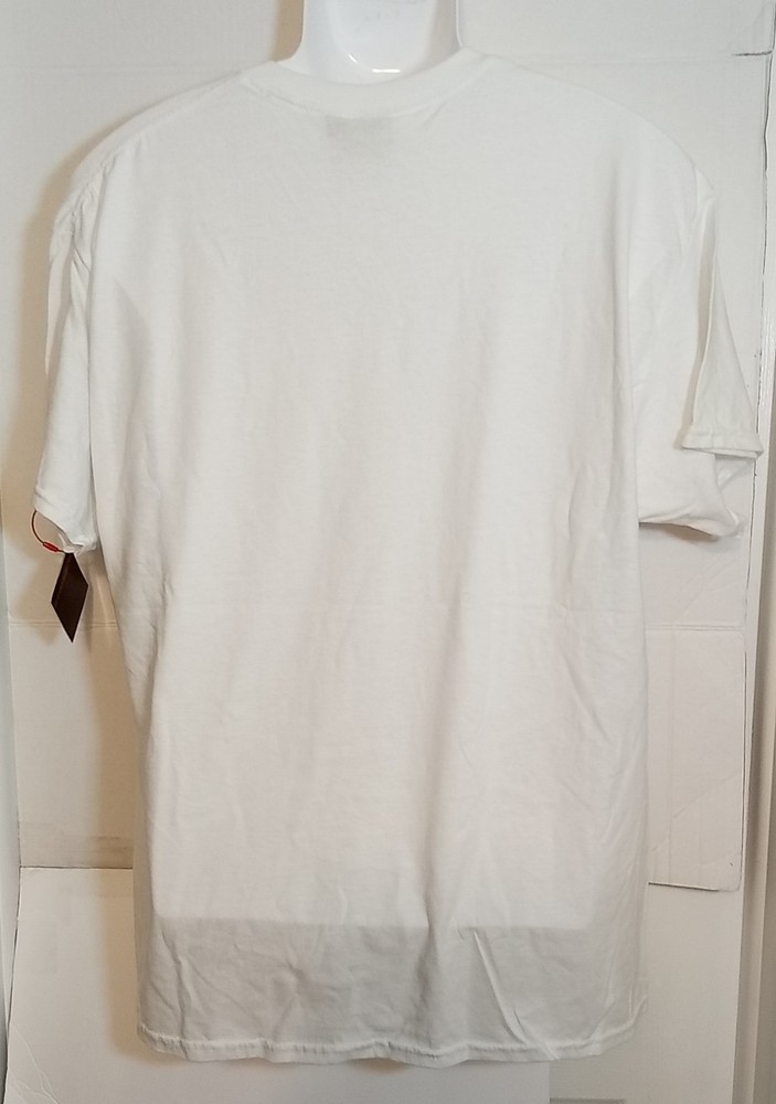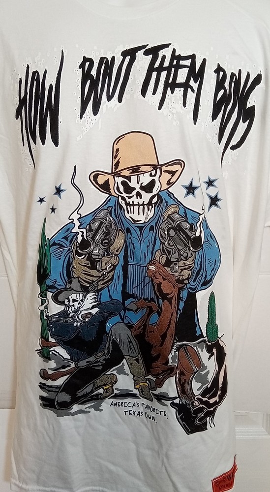 NWT. The product is a men's XL white T-shirt with a graphic print featuring the phrase "How About Them Boys" along with skeletons dressed as cowboys. Made of cotton with a Crew Neck and short sleeves, this regular fit shirt measures 24 inches pit to pit and 31 inches in length. Ideal for the seasons of summer, fall, and spring, this machine washable shirt is a unique addition to any man's wardrobe, perfect for casual wear or as a conversation starter. G7 BOX - 2905