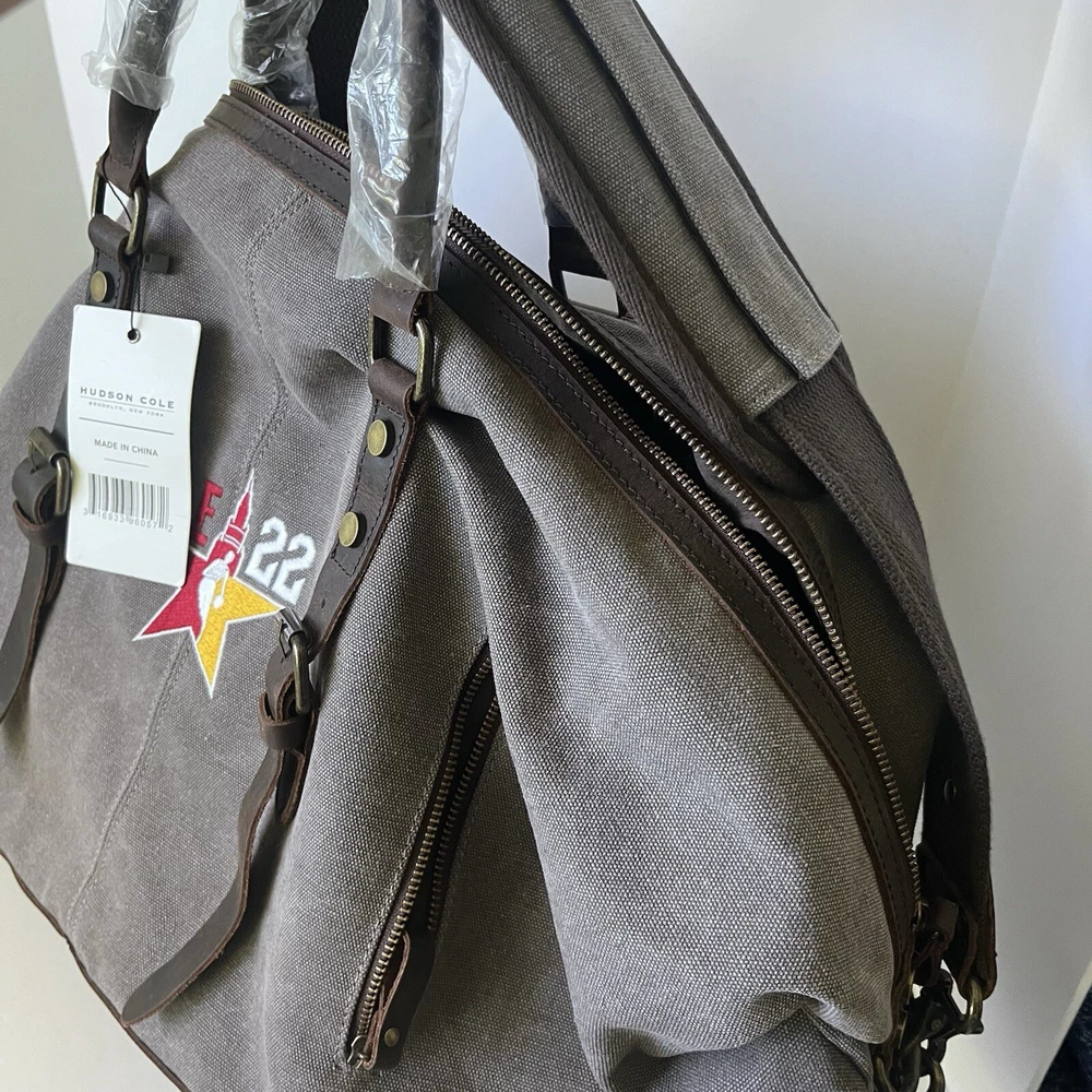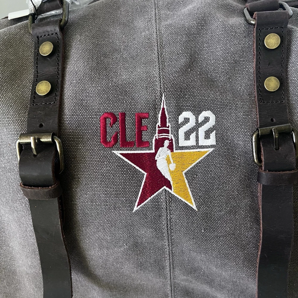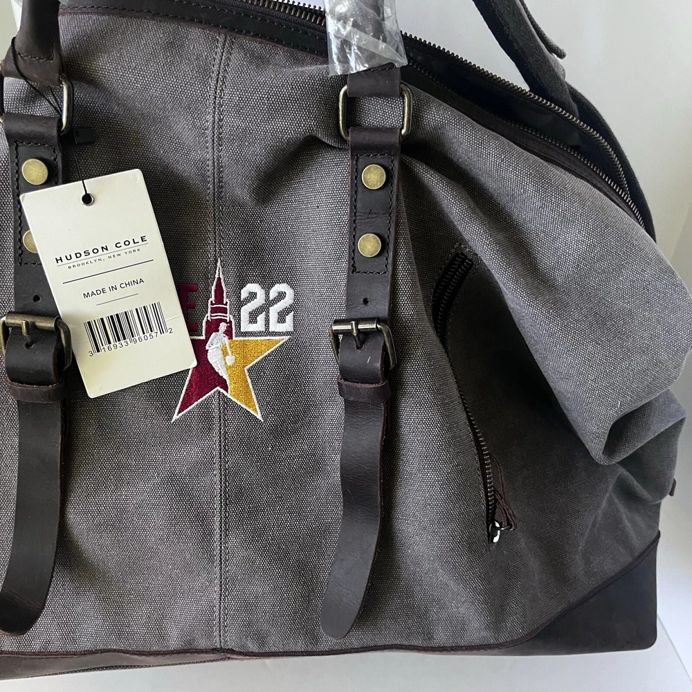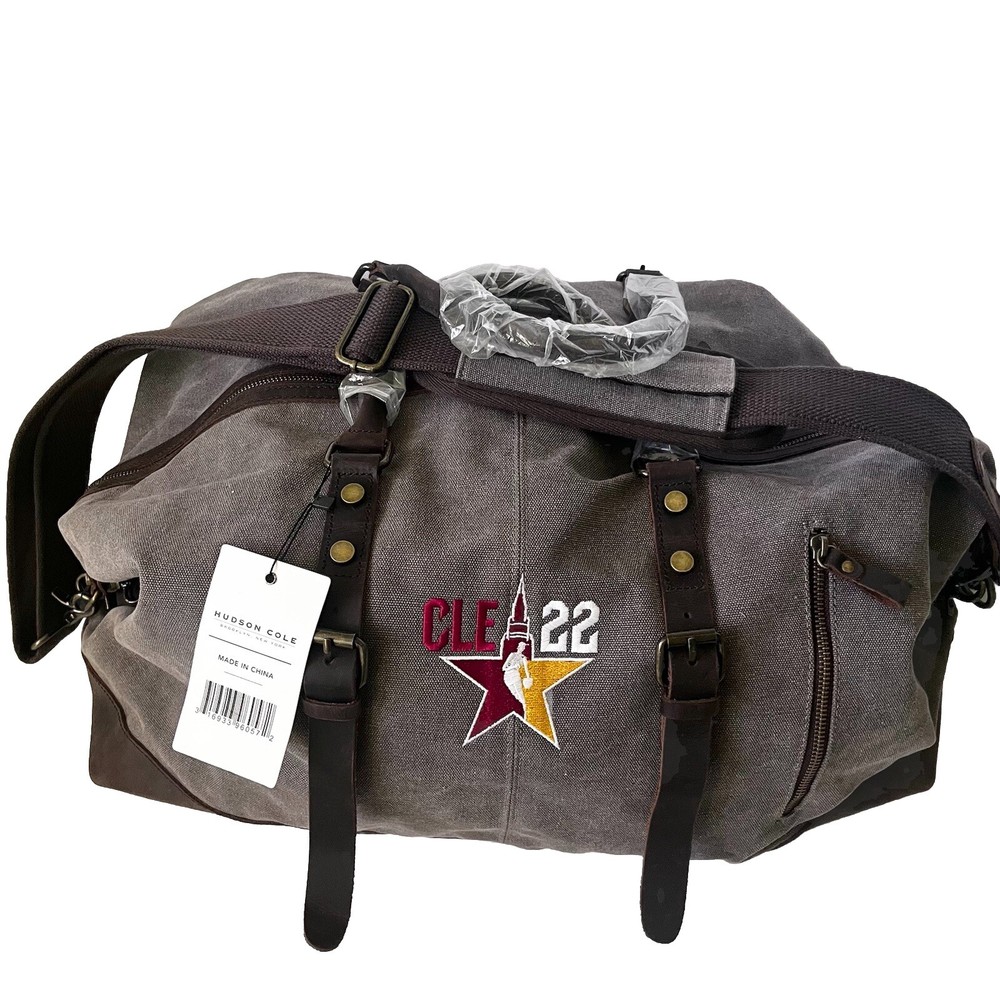 New oversized duffel bag by Hudson Cole Canvas with leather trim and handles Cle 22 basketball embroidery Zipper pockets Long arm strap