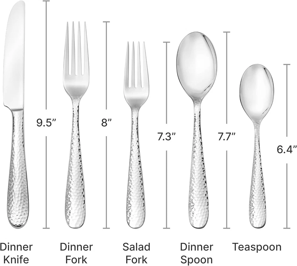 The handles are smooth, round, and comfortable, each utensil is a pleasure to hold. Featuring graceful curves, heavy-weight heft, and exceptional balance. Beautifully hammered on both sides to a bright mirror finish which shimmers when it catches the light. Creating an elegant and striking appearance, perfect for any occasion. Bergamo Hammered 60-piece cutlery set, service for 12: includes 12 dinner knives, 12 dinner forks, 12 salad forks, 12 dinner spoons, and 12 teaspoons On Dec 17, 2024 at 17:56:14 PST, seller added the following information: