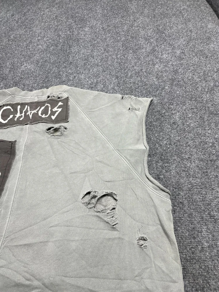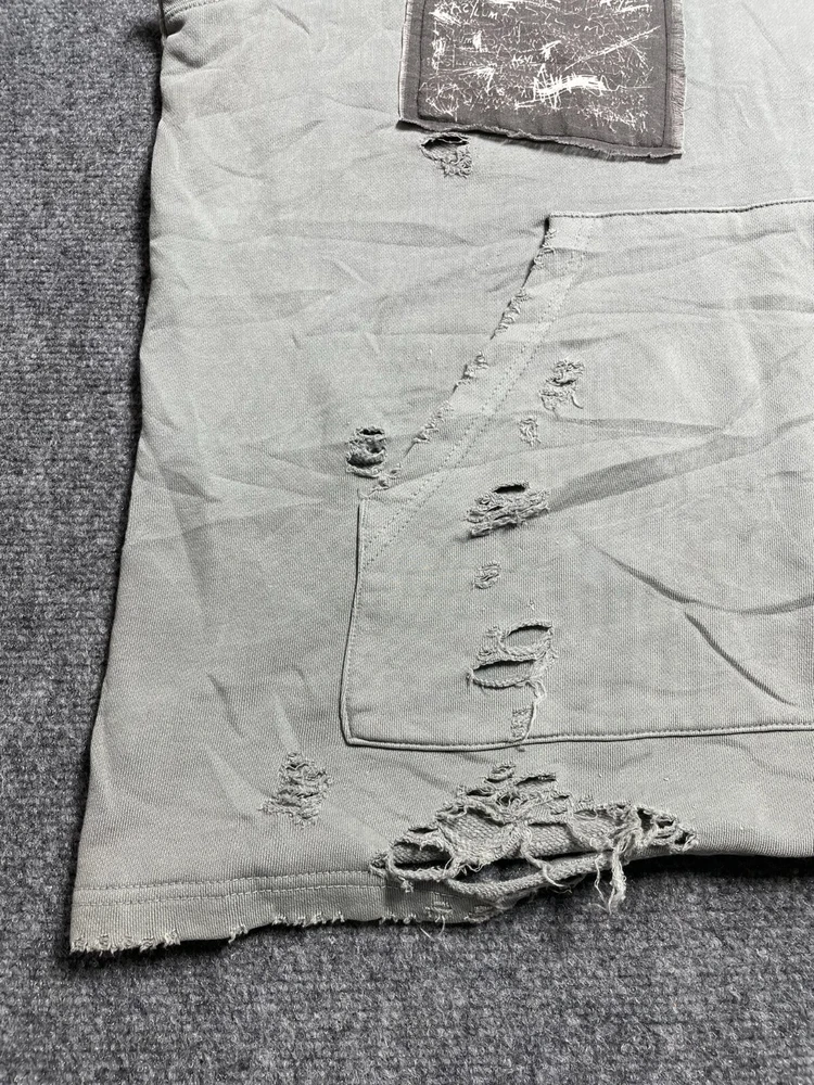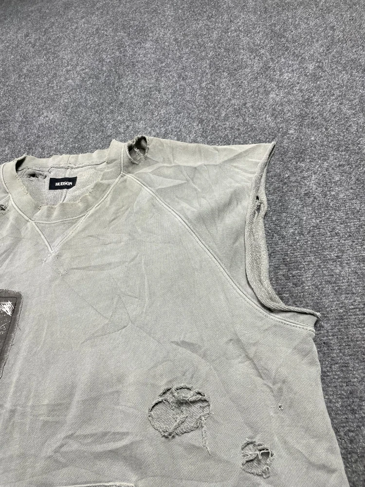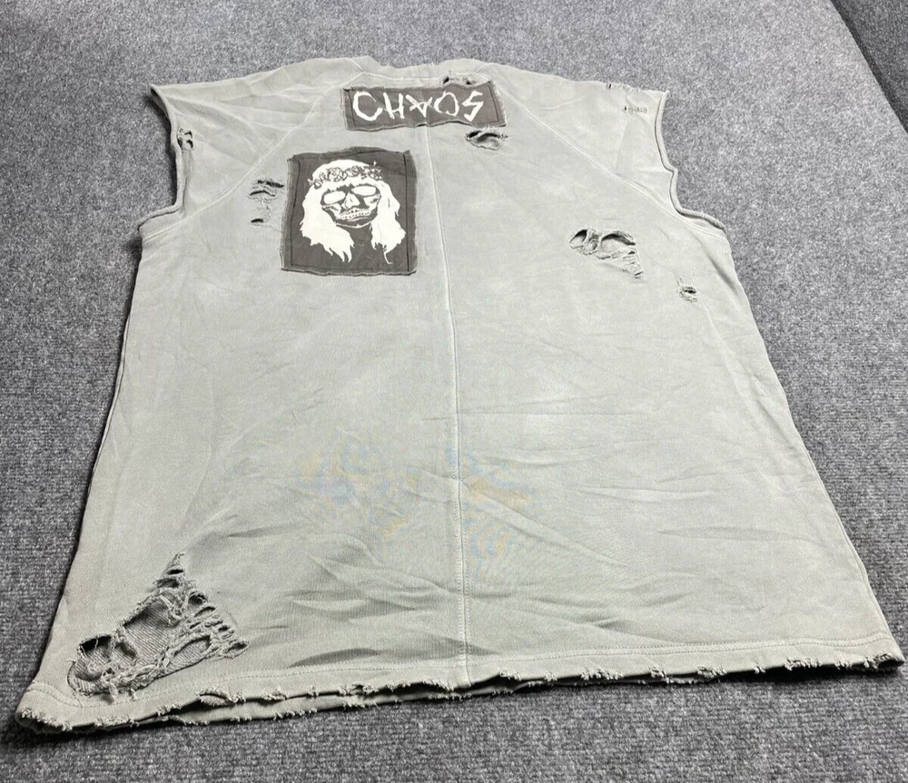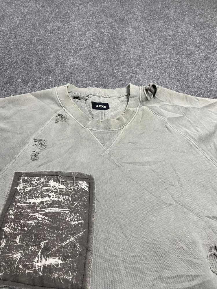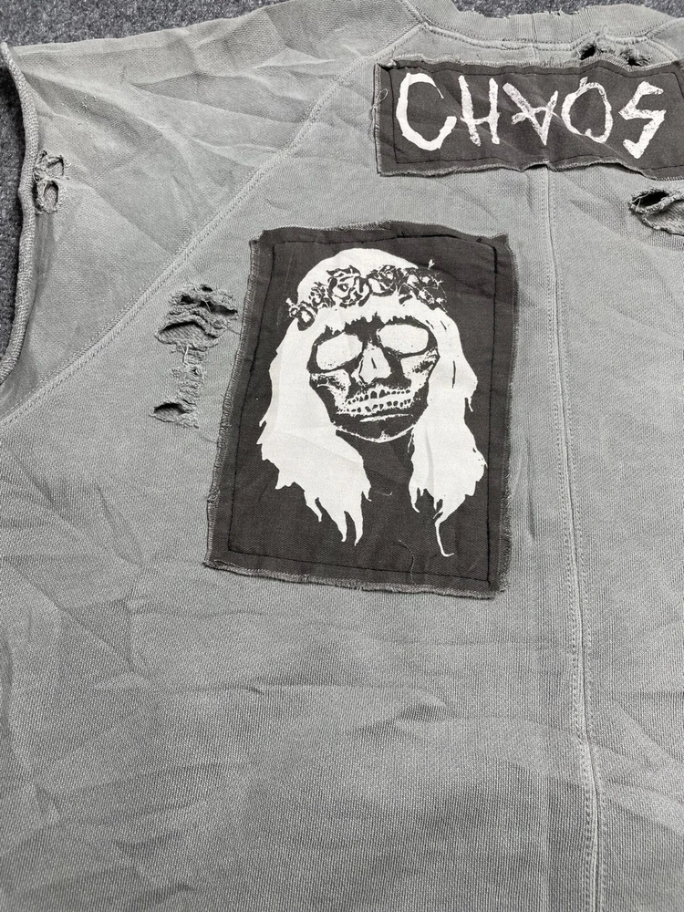 This Hudson Rex Cut-Off Chaos Unisex Shirt in Gray is a must-have for any fashion-forward individual. Made from 100% Cotton Jersey fabric, this short-sleeved sweater boasts a solid pattern and tight-knit construction. The crew neck and collarless design, along with the pockets and patches, make it perfect for travel, parties, or casual wear. The shirt is machine washable and comes in size XL with a regular fit. Its 80s and 90s theme adds a touch of nostalgia to your outfit. Whether you're going outdoors or just hanging out, this Hudson Rex sweater is the perfect addition to your wardrobe.