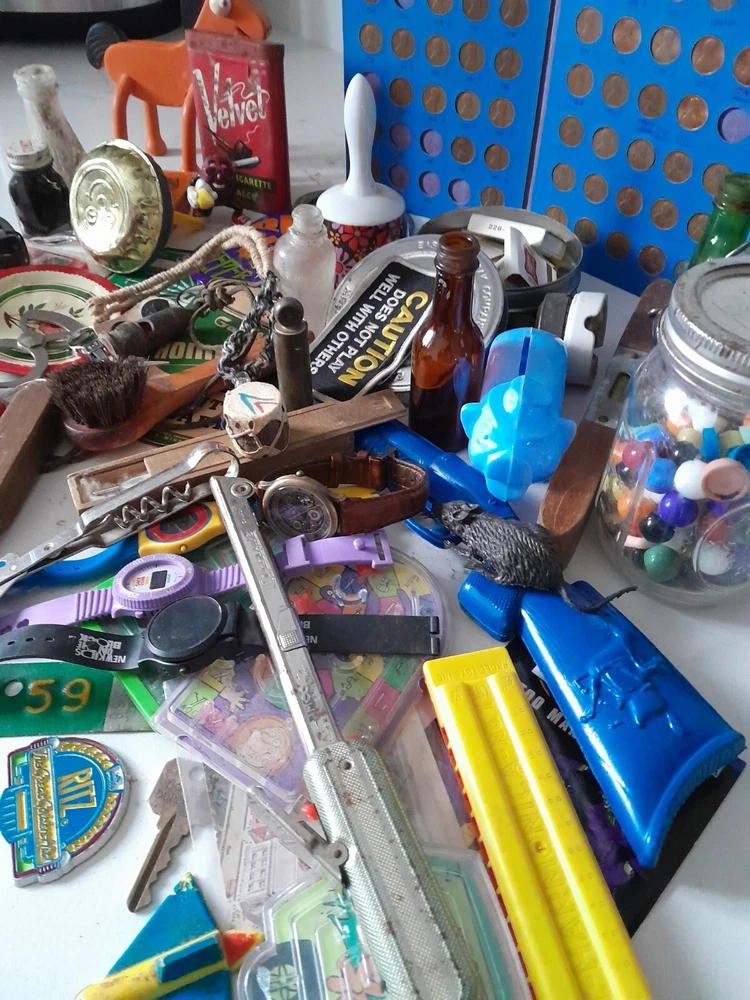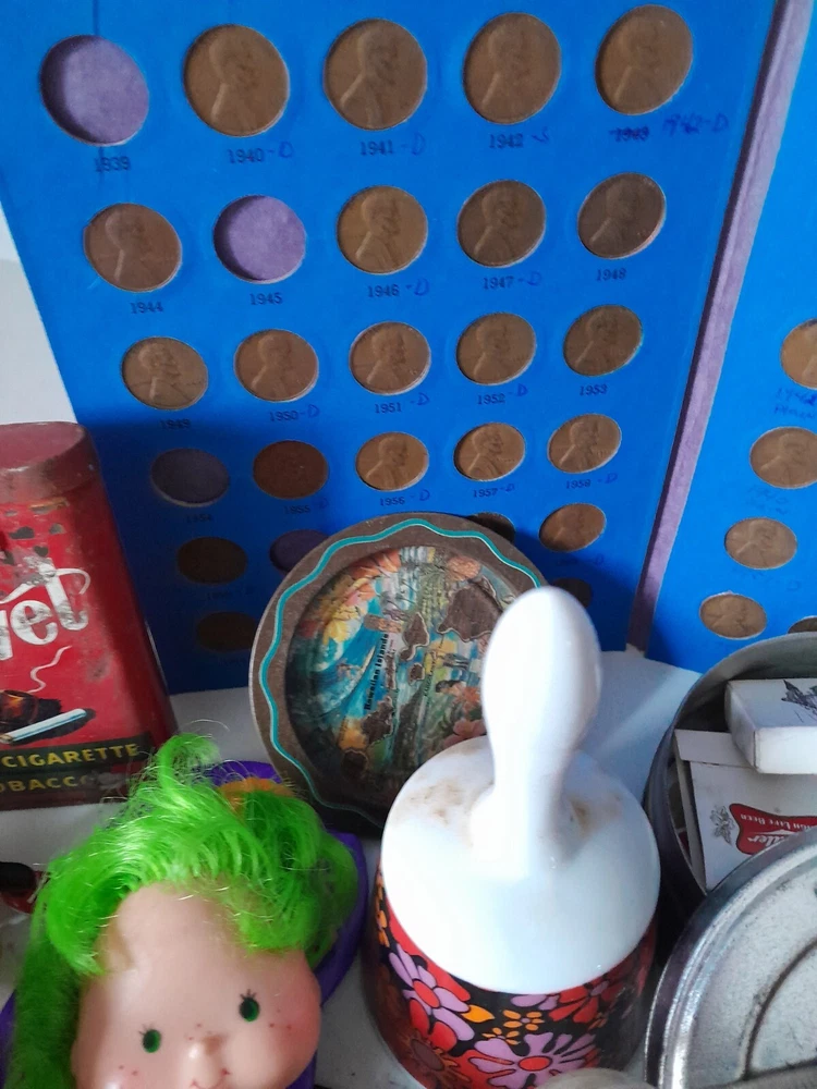 This huge vintage estate junk drawer mixed lot is a collector's dream come true. With more than 100 pieces, this lot includes a 1943 steel penny, jewelry, tins, watches, keys, marbles, toys, and more. The vintage pieces are perfect for adding to a collection or for decorating your home. The lot comes from an Estate and the type is mixed lot, with a focus on vintage pieces. Don't miss out on this unique opportunity to add a large selection of vintage items to your collection. See Pics for what's included. Too many cool items to list!!!