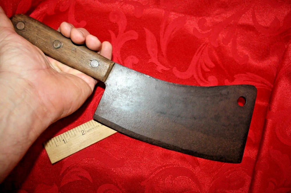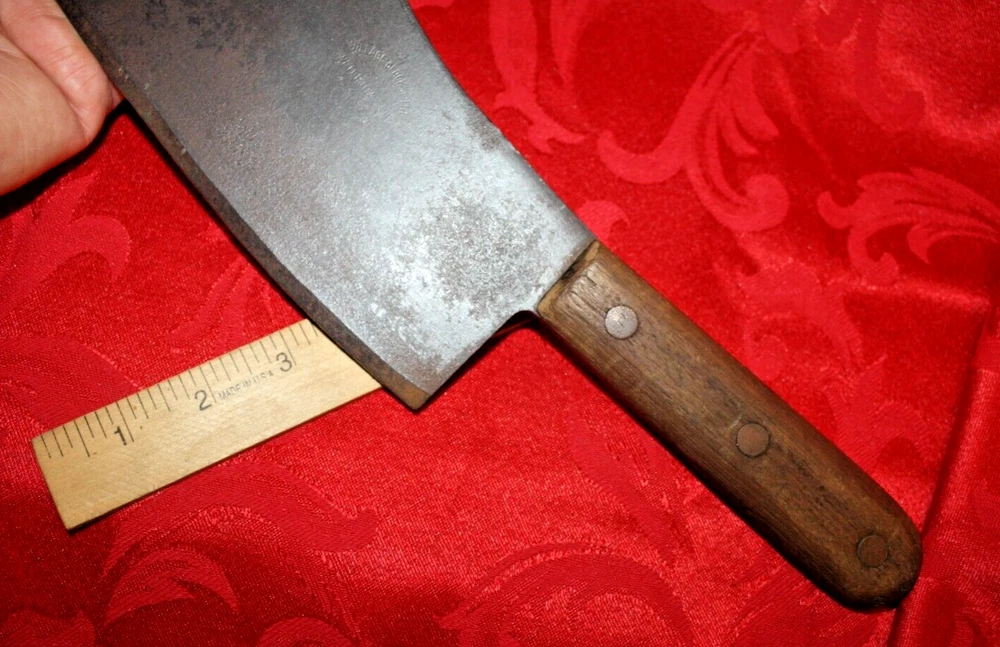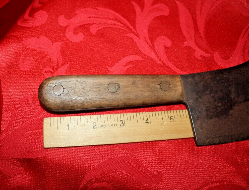 Nice old big heavy meat cleaver that is marked in center of blade VILLAGE BLACKSMITH WATERTOWN WIS in all capital letters. Its hard to read because the surface is a little rough and probably needs restoration to see clearly. No big issues. Handle is in good shape too. It measures a bit under 14" overall and the blade is apx 8" in length. See all pictures and my other listings. The last photo shows a couple of tiny dings along the very top edge. No big deal but they will be there when it arrives at your house should you buy it now for 65$ with 6$ well packaged shipping. Thank you and Good Luck! Rick