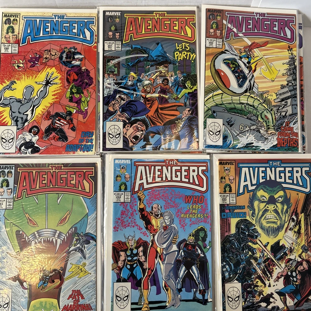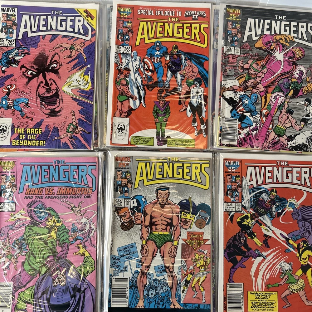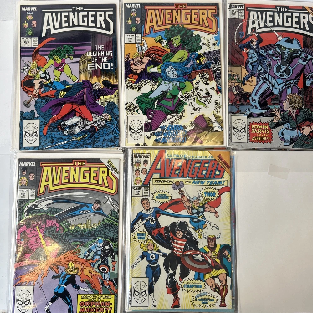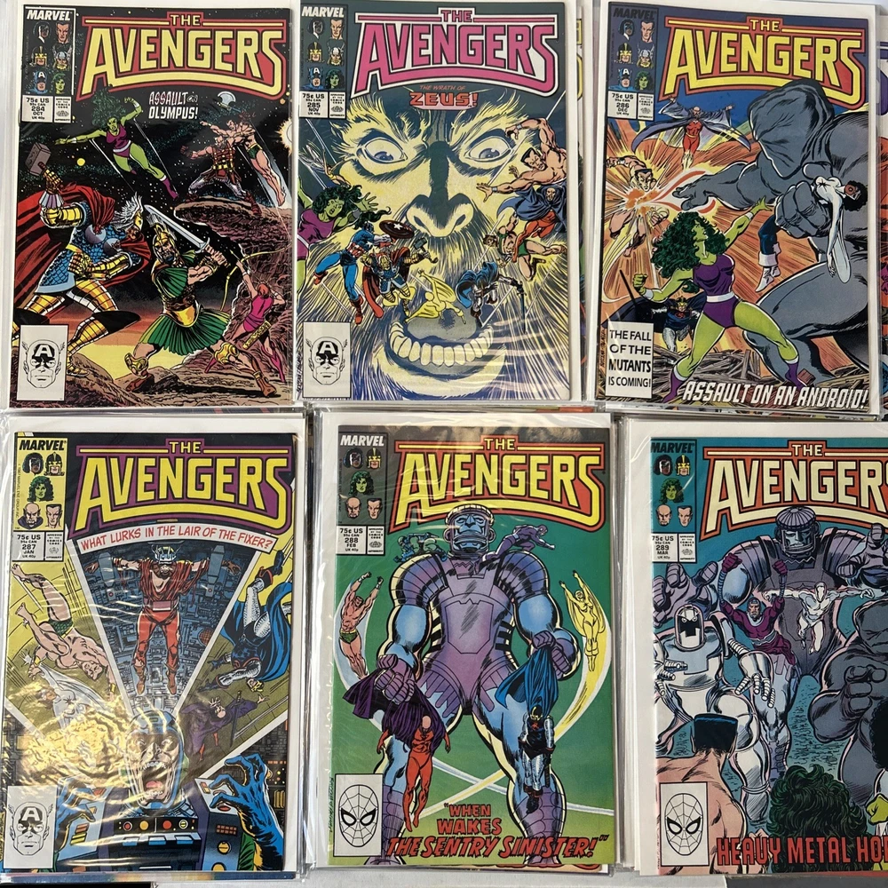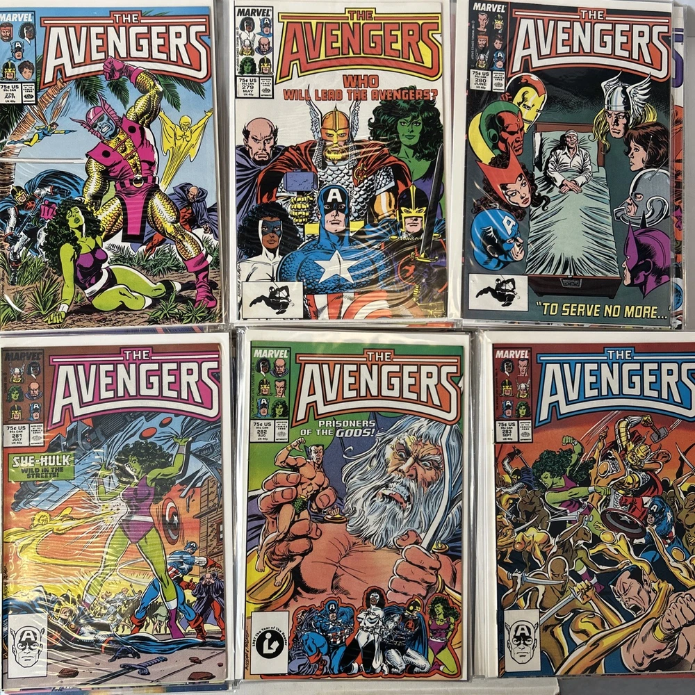 Complete Run of Avengers From #197-300 Including the Keys Mostly FN/VF-NM A few are closer to FN Bagged and mostly boarded The product is a complete run of Avengers comic books from issue #197 to #300, published by Marvel Comics in 1989. This collection includes key issues featuring the Avengers superhero team, making it a valuable addition to any Marvel comic book collection. With a mix of FN/VF-NM condition, these comics offer fans of the Avengers series a chance to own a substantial portion of their favorite superhero team's adventures.