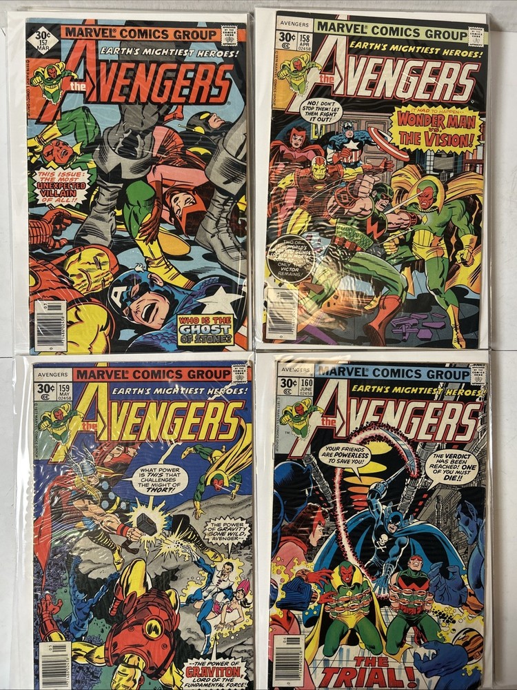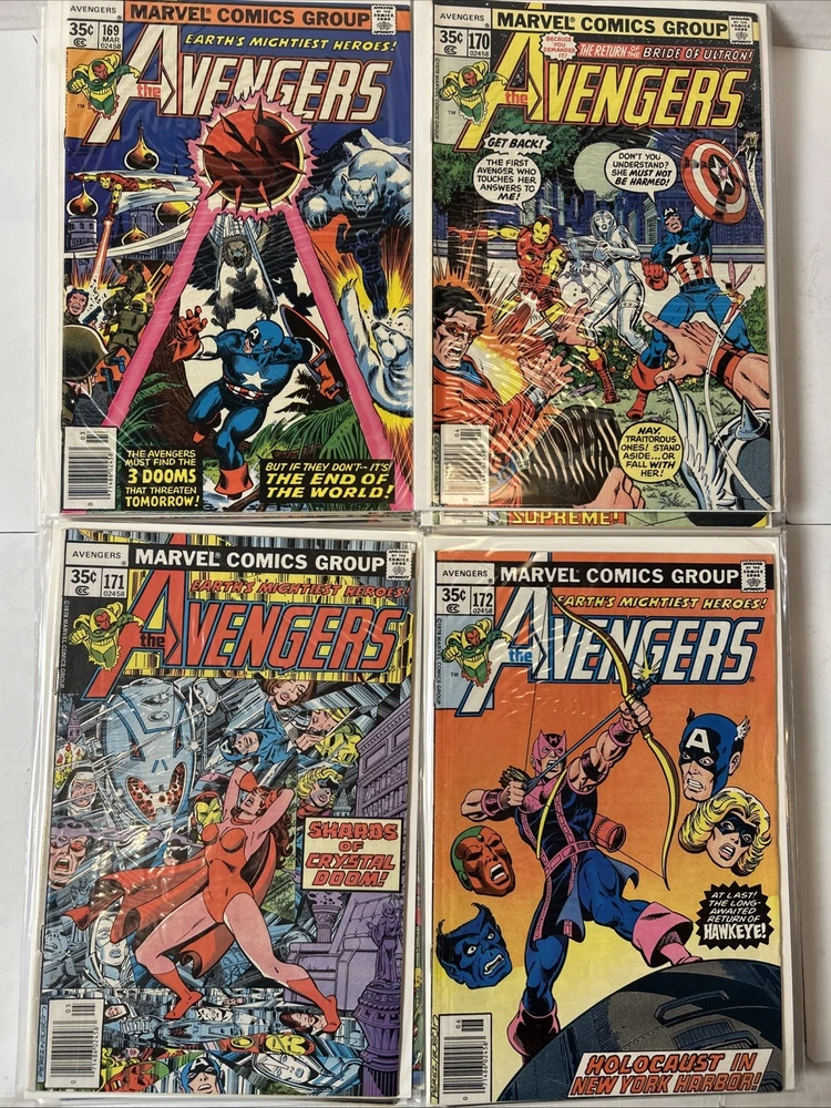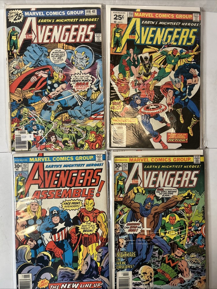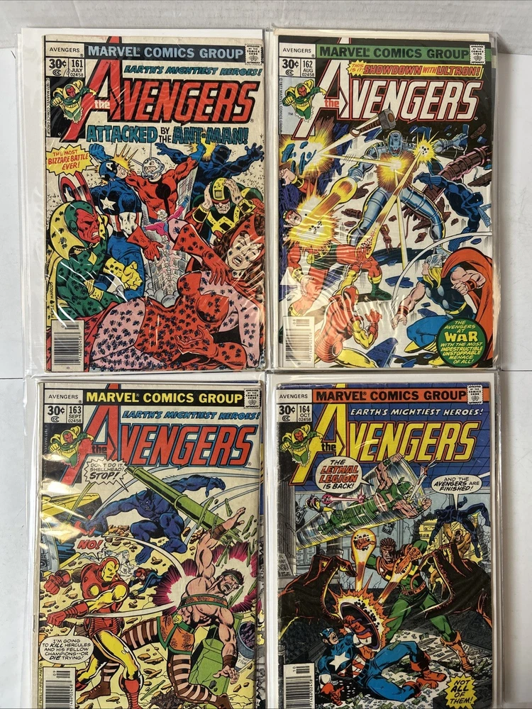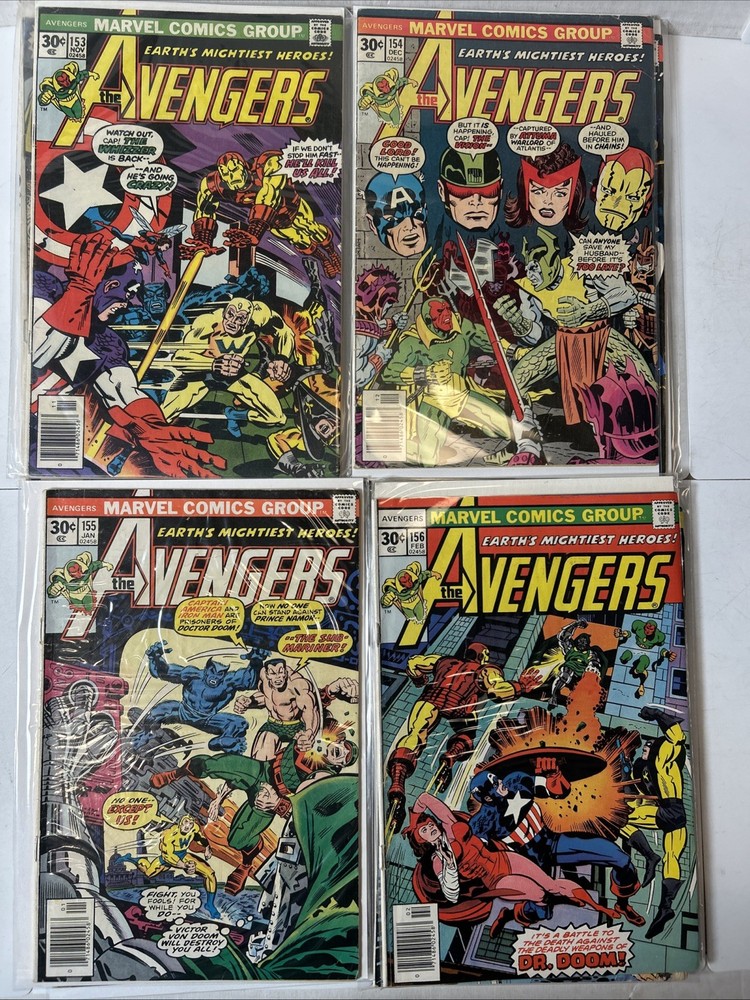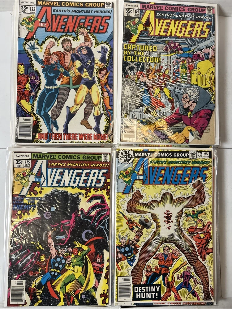 51 Issue Run of Bronze Age Avengers Keys Included Many Newsstand Variants 145, 146, 147, 148, 149, 150, 151, 152, 153, 154, 155, 156, 157, 158, 159, 160, 161, 162, 163, 164, 165, 166, 167, 168, 169, 170, 171, 172, 173, 174, 175, 176, 177, 178, 179, 180, 181, 182, 183, 184, 185, 186, 187, 188, 189, 190, 191, 192, 193, 194, 195 Mostly FN-VF+ A few are closer to VG Bagged and boarded The product is a huge run of Bronze Age Avengers comics from issues #145 to #195, published by Marvel Comics between 1976 and 1980. This collection features appearances by iconic characters like Ultron and Dr. Doom, set in the era of the Avengers superhero team during the Bronze Age of US Comics. These comics are highly sought after by collectors for their nostalgic value and historical significance in the Marvel Universe.
