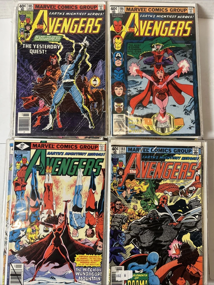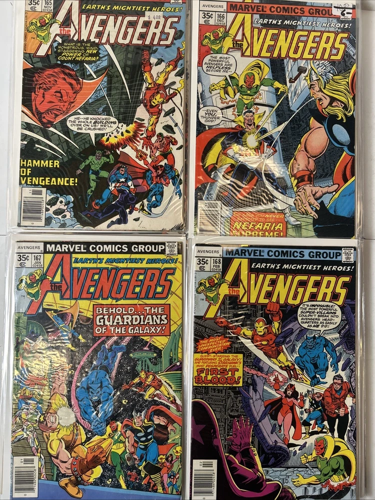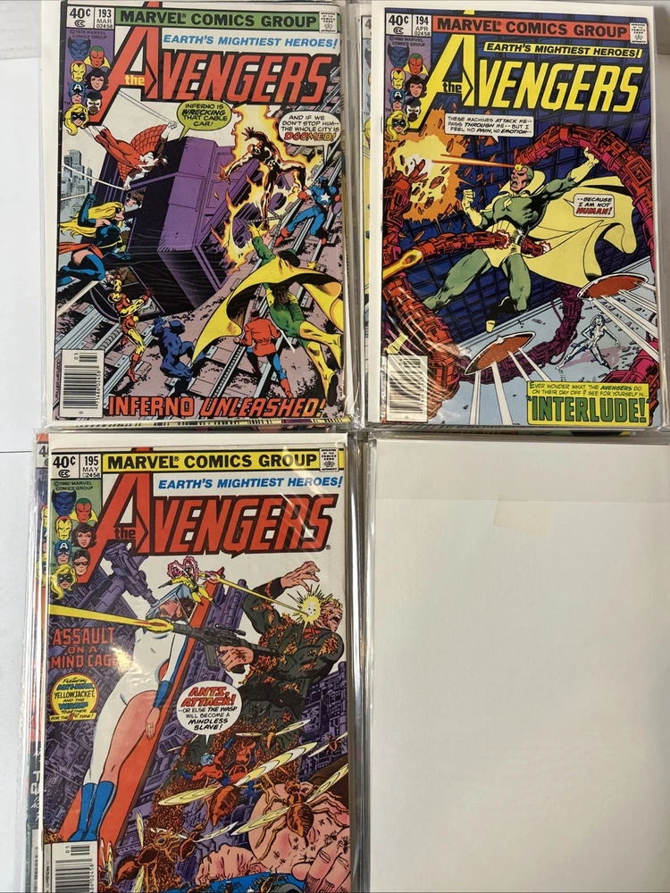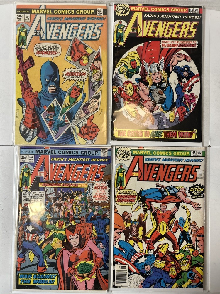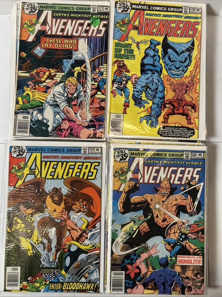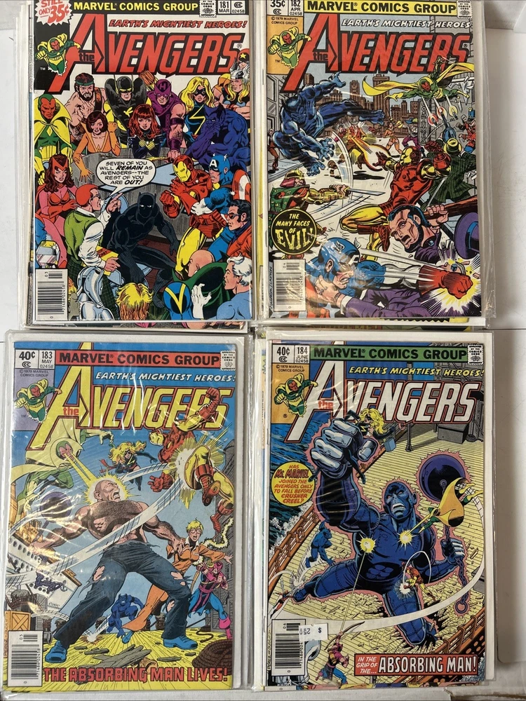 51 Issue Run of Bronze Age Avengers Keys Included Many Newsstand Variants 145, 146, 147, 148, 149, 150, 151, 152, 153, 154, 155, 156, 157, 158, 159, 160, 161, 162, 163, 164, 165, 166, 167, 168, 169, 170, 171, 172, 173, 174, 175, 176, 177, 178, 179, 180, 181, 182, 183, 184, 185, 186, 187, 188, 189, 190, 191, 192, 193, 194, 195 Mostly FN-VF+ A few are closer to VG Bagged and boarded The product is a huge run of Bronze Age Avengers comics from issues #145 to #195, published by Marvel Comics between 1976 and 1980. This collection features appearances by iconic characters like Ultron and Dr. Doom, set in the era of the Avengers superhero team during the Bronze Age of US Comics. These comics are highly sought after by collectors for their nostalgic value and historical significance in the Marvel Universe.