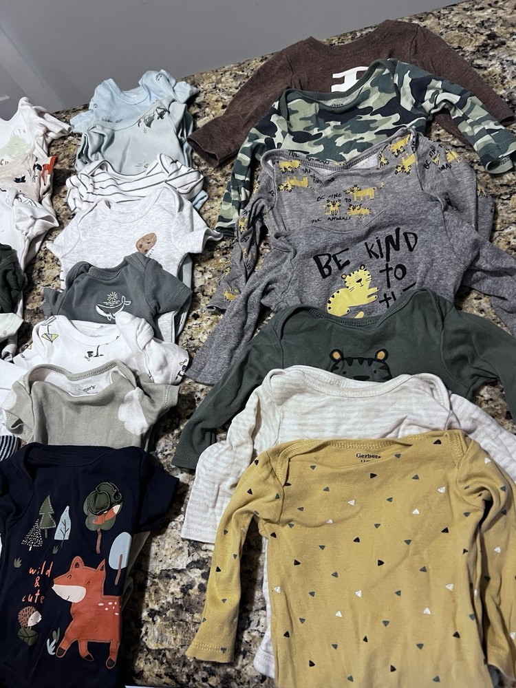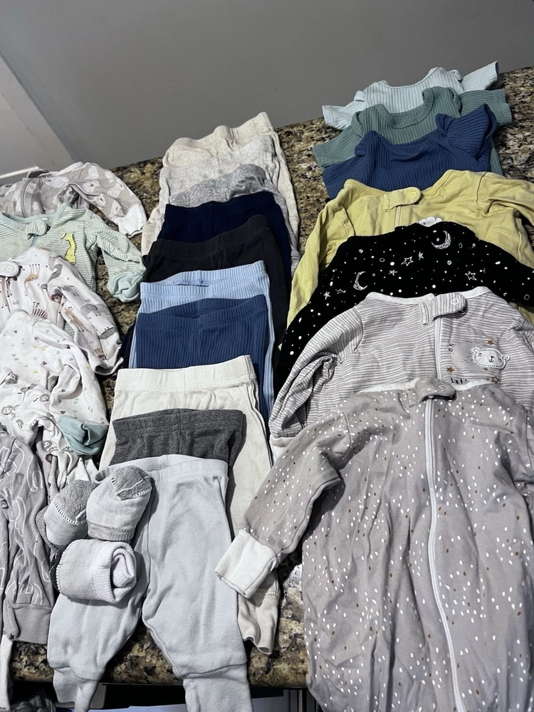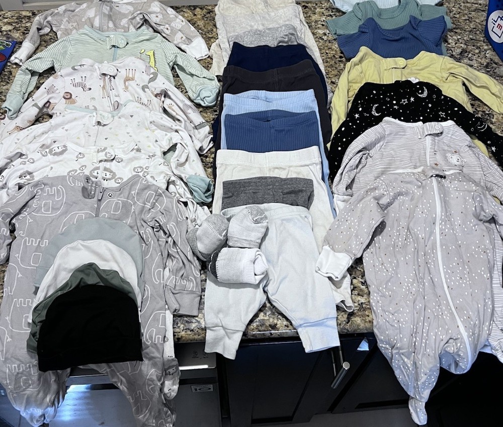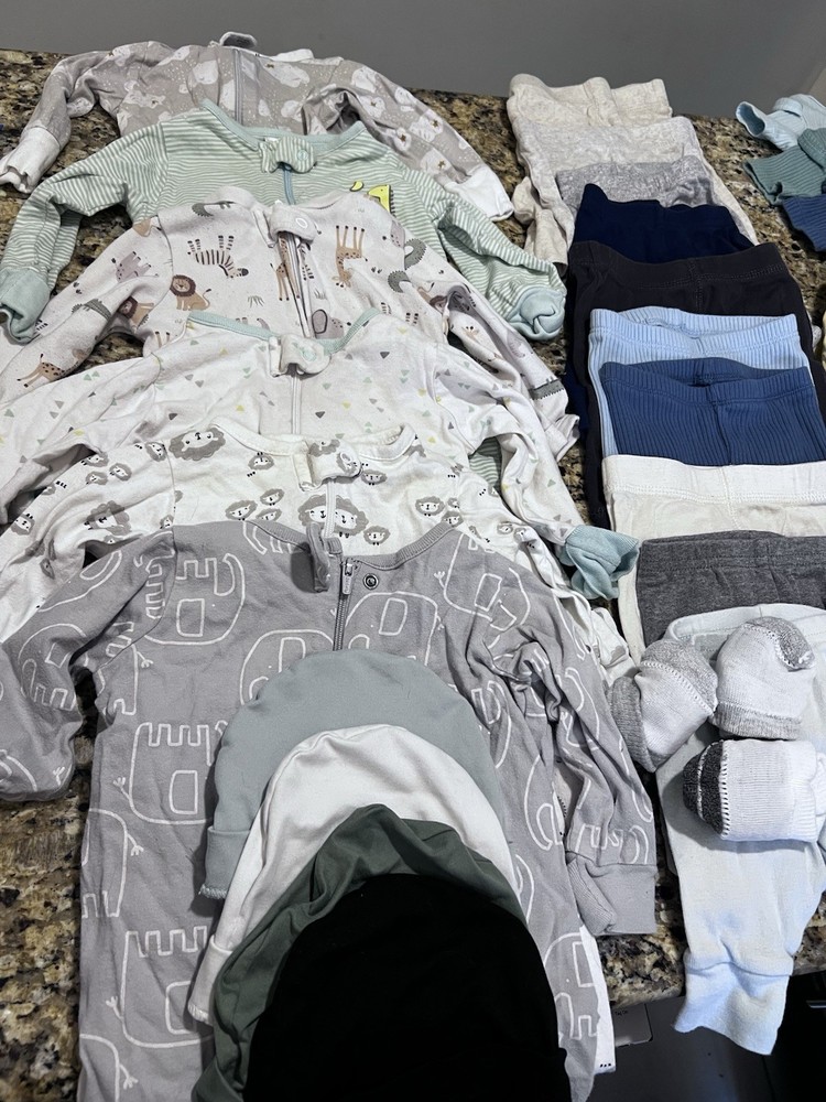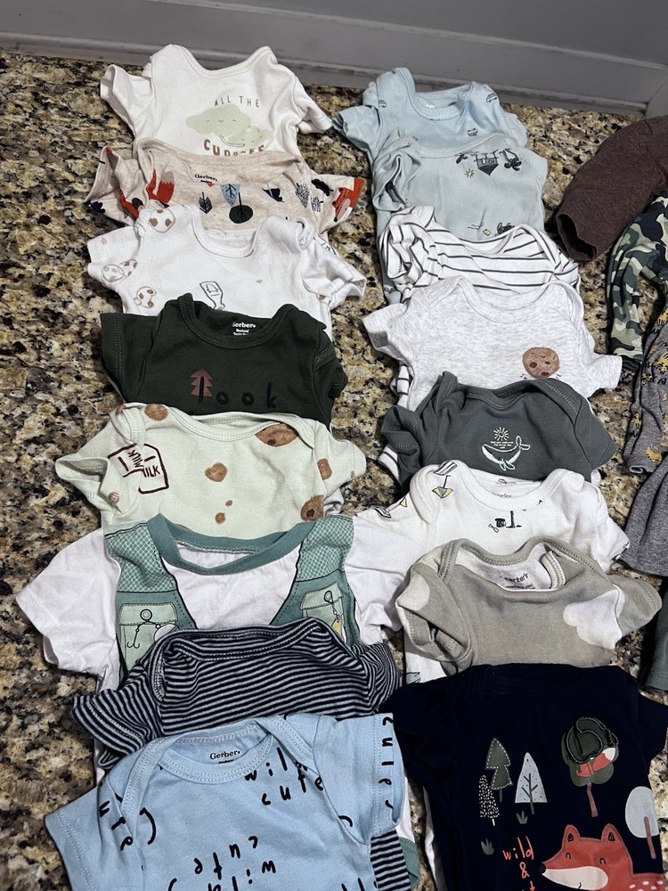 Lot of roughly 50 items. This product is a huge lot of newborn boy clothes, including short and long sleeve onesies, pants, sleepers, hats, and socks. The outfits are in the size newborn and are multicolored, made from blended fabric. They are machine washable and suitable for casual occasions, with a style of bodysuit. The brand is Gerber and the outfits are perfect for summer, fall, and spring seasons, and for activities like walking. Mostly Gerber. Newborn & 0-3 months. Most clothes are in excellent condition - no stains or holes. A few pieces are in good condition with a little more wear.