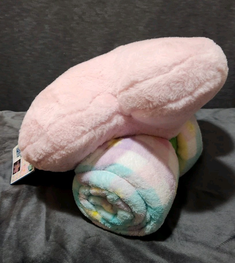 This is a huggable plush throw set with a pillow and fleece blanket, measuring 50x60 inches. The blanket is warm and machine washable, made of polyester and fleece in a multicolor design. It is a modern style item from the brand your zone, suitable for kids' bedrooms. The set includes a rectangular blanket with no closure and is machine washable. It is designed in China.