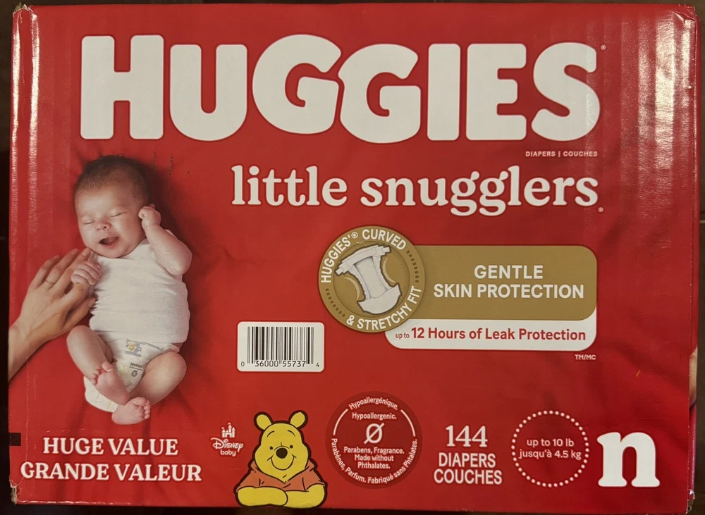 BRAND NEW - Huggies Little Snugglers Newborn Diapers – Size Newborn (Up to 10 lbs), 144 Count Key Features: Leak-Free Protection – Huggies Leak Lock System provides up to 12 hours of leak protection. Gentle Skin Care – Curved, stretchy fit for comfort with a gentle tummy fit. Blowout Blocker – Soft, pocketed back waistband helps prevent leaks and blowouts. Fragrance-Free & Hypoallergenic – Safe for sensitive skin, free of fragrances, and hypoallergenic. GentleAbsorb Liner – Quickly absorbs wetness to keep your baby’s skin clean and healthy. Wetness Indicator – Color-changing indicator signals when it’s time for a diaper change. Designed for comfort, protection, and sensitive skin.