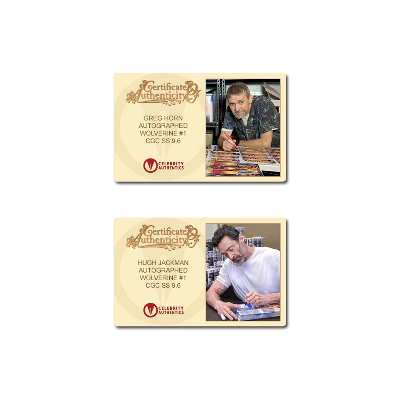 Powered by Frooition Contact Us Add To Favorites Receive Store Newsletter Hugh Jackman, Greg Horn Autographed 2020 Wolverine #1 Virgin Variant CGC SS 9.6 Hugh Jackman, Greg Horn Autographed 2020 Wolverine #1 Virgin Variant CGC SS 9.6 © Celebrity Authentics. All Rights Reserved. Item Description SPECIAL AUCTION NIGHT! eBay's shipping quotes are high and we do not profit on shipping. To save on shipping, we will combine winnings bids (if the items can ship together). We will refund any difference over $2. Good luck and happy bidding! Celebrity Authentics is the exclusive autograph partner of Hugh Jackman. Please be aware most other online autographs purported to be Mr. Jackman's are forgeries. Mr. Jackman has only signed with Celebrity Authentics so be sure the item you choose is affixed with the Celebrity Authentics Authentication Hologram for his genuine signature. This 2020 Wolverine #1 with Greg Horn Virgin Variant Cover is graded CGC SS 9.6 and has been personally autographed by Wolverine himself, legendary actor Hugh Jackman and artist Greg Horn during their signings with Celebrity Authentics! Ultimate Comics exclusive virgin cover by Greg horn. Written by Ben Percy. Art by Adam Kubert and Viktor Bogdanovic. The Best is Back! Wolverine been through a lot. He's been a loner. He's been a killer. He's been a hero. He's been an Avenger. He's been to hell and back. Now, as the nation of Krakoa brings together all Mutantkind, he can finally be… happy? With his family all together and safe, Wolverine has everything he ever wanted… and everything to lose. Writer Benjamin Percy (X-Force, Wolverine: The Long Night) and legendary artist Adam Kubert (X-Men, Avengers) bring the best there is to his new home! Plus: The return of Omega Red! 72 pages, full color. Ships in protective case affixed with Celebrity Authentics serial-numbered Authentication hologram and includes Celebrity Authentics Certificates of Authenticity featuring pictures of Hugh and Greg signing. Please note: exact item pictured is what you will receive. Authenticity Authenticity Our Story Shipping Customer Service Authenticity At the core of every autographed item we release lies our customers peace of mind in knowing that their autograph is 100% authentic. At Celebrity Authentics we ensure this by only authenticating products that we personally witness being autographed by the talent. We do not use third party suppliers, authenticators or opinion companies to acquire or authenticate our product. Every item we offer is obtained through autograph signings we conduct and witness. This strict and unwavering dedication to authentication has made Celebrity Authentics the most trusted name in authentication worldwide. Over the past decade we have developed innovative systems to terminate forgeries and guarantee our customers ironclad authenticity. The Hologram The Hologram is the cornerstone of our authenticity and is much more than just a series of numbers. Each tamper-proof Hologram provides an identification number that is unique to the specific item it's affixed to. This number can then be validated through our online Authentication Database to verify the authenticity of your item, presenting full signing details for your collectible including the date and location it was signed along with photo/s of the Talent singing. This form of Authentication used by Celebrity Authentics is the FBI's recommended means for authenticity. Certificate of Authenticity Additionally, every Celebrity Authentics item is accompanied by our industry defining Certificate of Authenticity (COA). Making a perfect display piece itself, our COA denotes the product title and features a photographic image of the Talent signing. This photographic proof is just one more reason why Celebrity Authentics products have seen a remarkable increase in value and demand. Our Story Our Story One fake autograph sparked the beginning of a revolutionary company. A course was then set to provide fans and collectors worldwide with access to hand-signed, genuine autographed editions by their favorite celebrities. When it comes to autograph authenticity, we do not sell opinions - nor do we guess. At Celebrity Authentics, we witness every autograph we authenticate. If we did not witness it being signed by the talent, then we will not offer it - no exceptions. Our autograph signing sessions are arranged and scheduled with the talent through their agent, manager or representative. We do not use autograph chasers that approach talent on the street, airport or similar. Our signings are conducted in a professional setting that can accommodate our large inventory of extraordinary collectibles and provide quality signatures. We are passionate about authenticity and the safeguarding of our product against fraud to maintain the integrity of each autograph. View our Authenticity section and discover how we have pioneered new systems to fight forgeries and ensure every item you receive from Celebrity Authentics is 100% genuine. Not all autographs are created equal. The FBI reported that over 90% of all A-List Actors autographs sold in the marketplace are forgeries. To maintain the integrity of each autograph, we developed and implemented a serial-numbered authentication system and Certificate of Authenticity that includes an industry first - a picture of the talent signing. According to the FBI's research, this is the most effective way to ensure authenticity while effectively eliminating forgeries in the marketplace. Shipping Shipping United States We offer free standard shipping to all addresses located within the Continental USA 48 States. We aim to get your item(s) to you as quickly as possible. Orders typically ship within 1-2 business days from receipt of payment (excluding holidays). You will be able to track your order on the courier's website and a tracking number will be provided upon shipment of your item(s). Please note, you may need to sign for your delivery. Your order may
