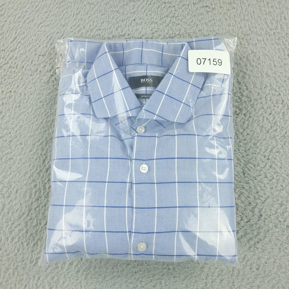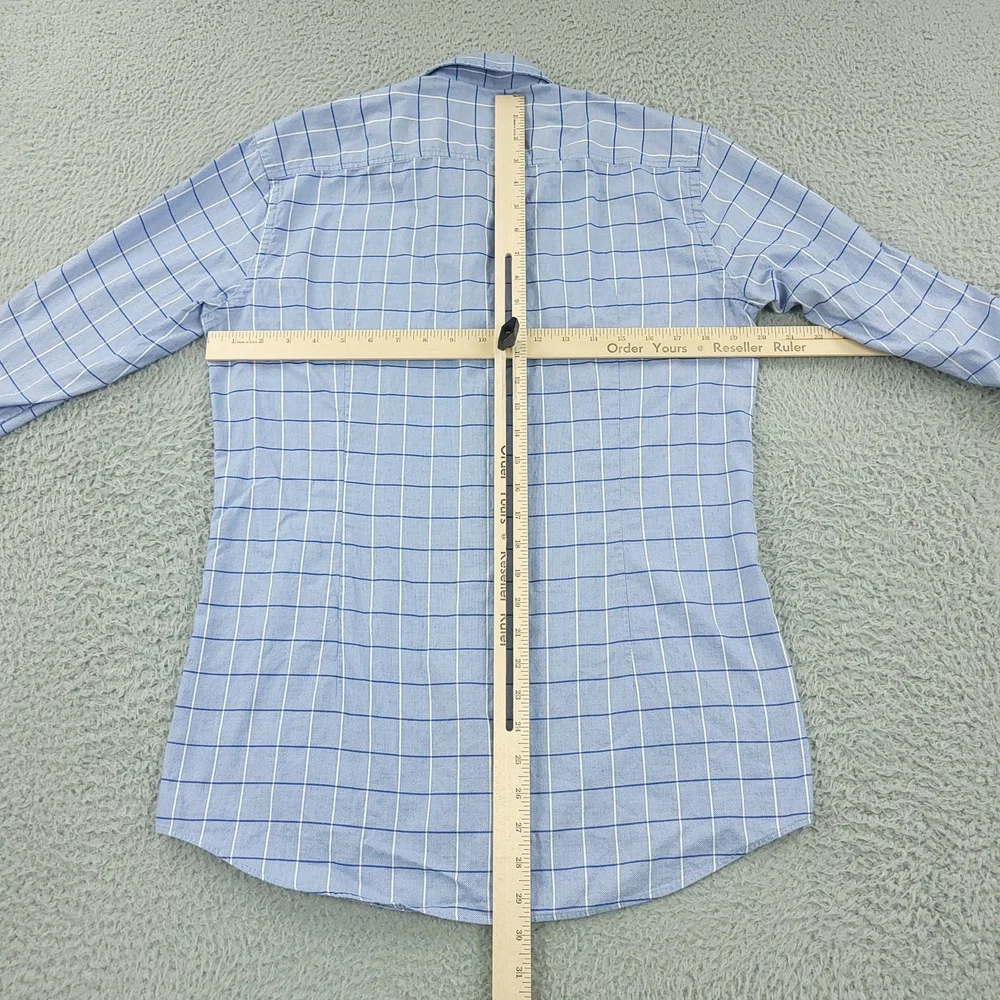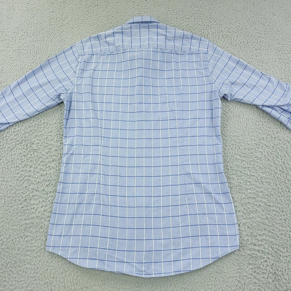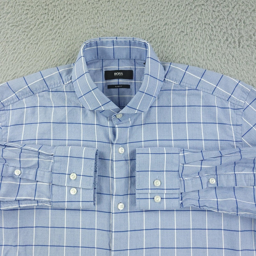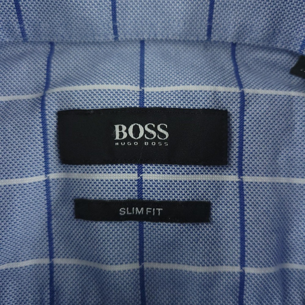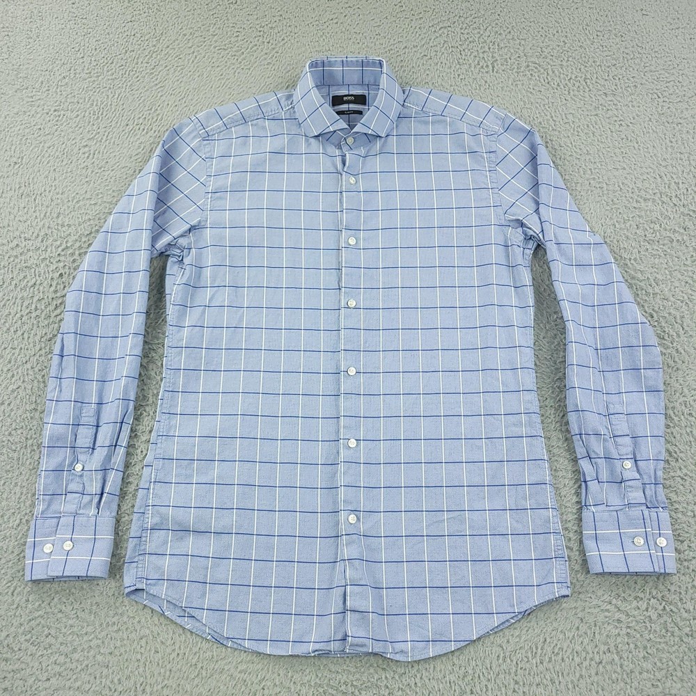 Hugo Boss Dress Shirt Mens 15.5 34/35 Blue Check Slim Fit Long Sleeve Button Brand: Hugo Boss Style: Mens slim fit long sleeve dress shirt with a blue check windowpane pattern. Color: Light blue with white and darker blue check lines. Size on tag: 39 / 15.5 neck with 34/35 sleeve length. Details: Point collar, full button front, barrel cuffs with adjustable buttons, curved hem, no chest pocket. Made in China. Measurements are included in the photos, compare measurements with your item to ensure proper fit. Items are added daily click here to Visit My Store Combined shipping for US customers is 1.99 for each additional item Items are cleaned per eBay standards & policies