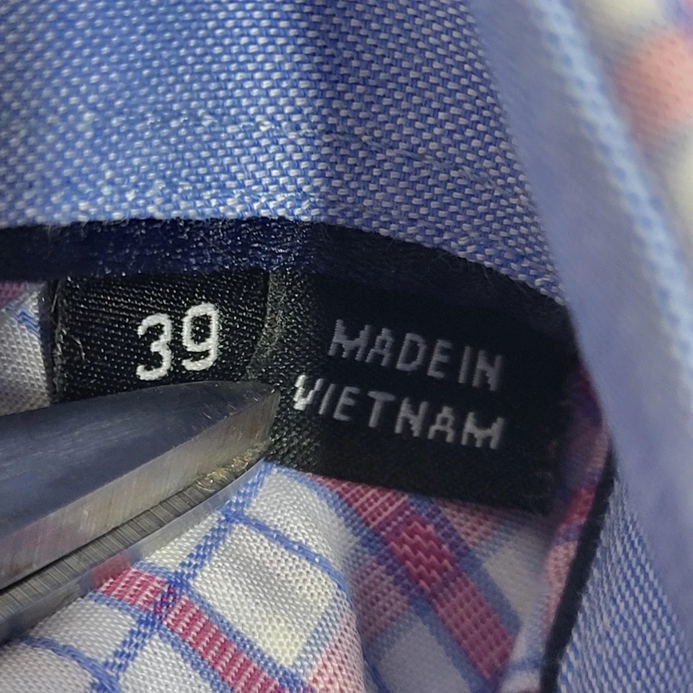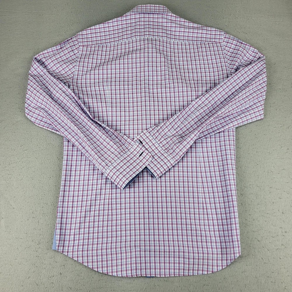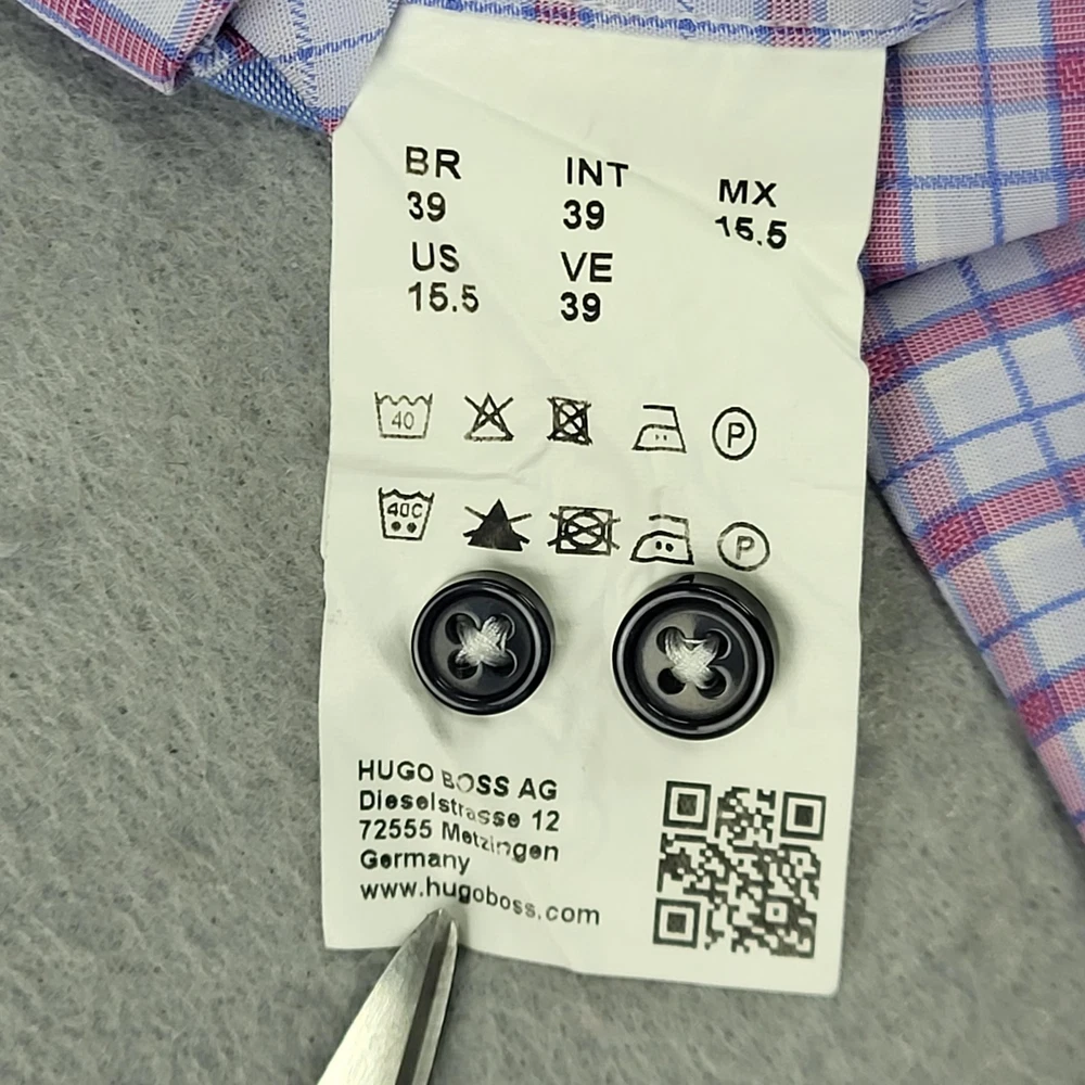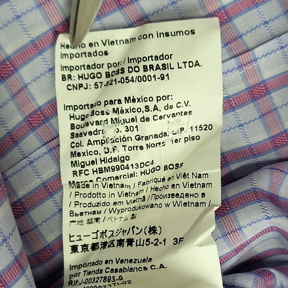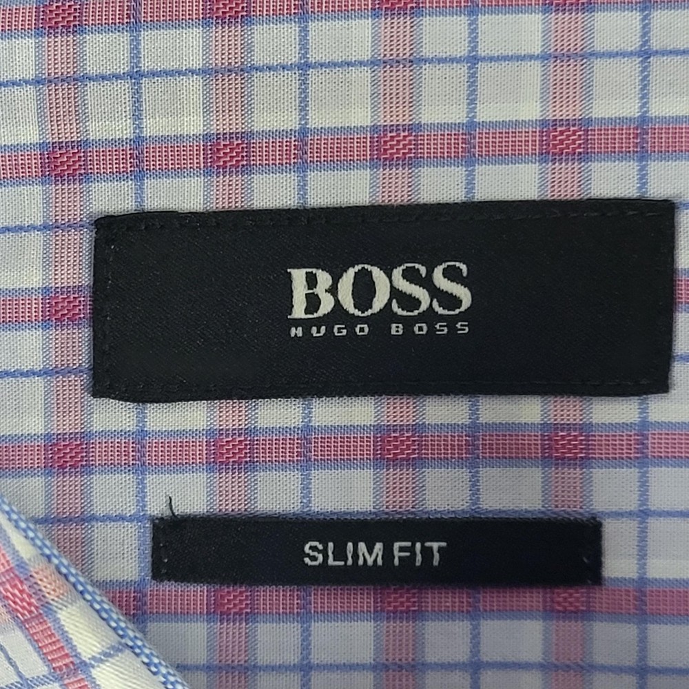 Brand: Hugo Boss (BOSS) Style: Juri long-sleeve button front woven dress shirt in a pink and blue check pattern with contrast light blue inner collar and cuffs. Fit: Slim Fit Gender: Mens Size on tag: 39 / US 15.5 neck Material: 100% cotton including trim (per tag). Color: White base with pink and blue check pattern, light blue contrast details. Made in Vietnam. Details: Spread collar, button front closure, adjustable barrel cuffs with contrast lining, curved hem, includes two spare buttons on original care tag. UPC: 742228189425 Additional codes on tag: 6039244, Z007186750, 50296081, 1017214 01 673, 20074900550909 00010 00000, RN 73616, CA 23115. Disclaimer: Different sources of lighting can change your perspective on the color of the clothing Disclaimer: All clothing is measured in a resting position lying flat. All items have been cleaned per eBay standards & policies. We ship items daily via USPS Ground Advantage or Priority Mail with a tracking number for confirmation, so expect a quick delivery. We also offer free 30-day returns!! Please feel free to reach out anytime with any questions you may have. Thank you for shopping at Curiosity Corner RVA!!! Follow my store for greater discounts seller:kevredfor_0