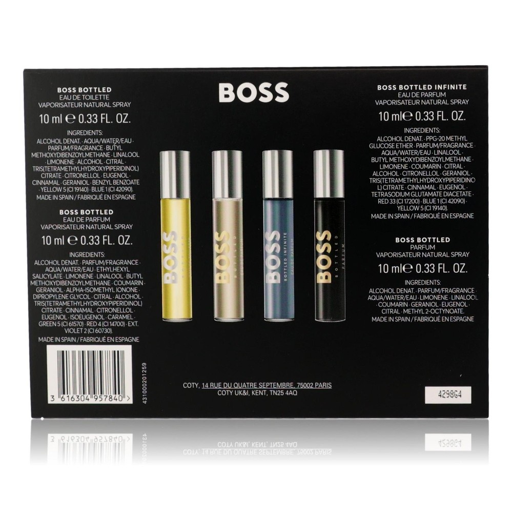 View all our products View our store Contact Us Add to Favorite Sellers Hugo Boss by Hugo Boss, 4 Piece Gift Set for Men This set includes Boss Bottled EDT, Boss Bottle Infinite EDP, Boss Bottled EDP, and Boss Bottled Parfum. All are 0.33 Sprays. Attributes: 100% Authentic Brand: Hugo Boss Name: Hugo Boss Size: 1 Category: Men's Fragrances Condition: New Fast Shipping