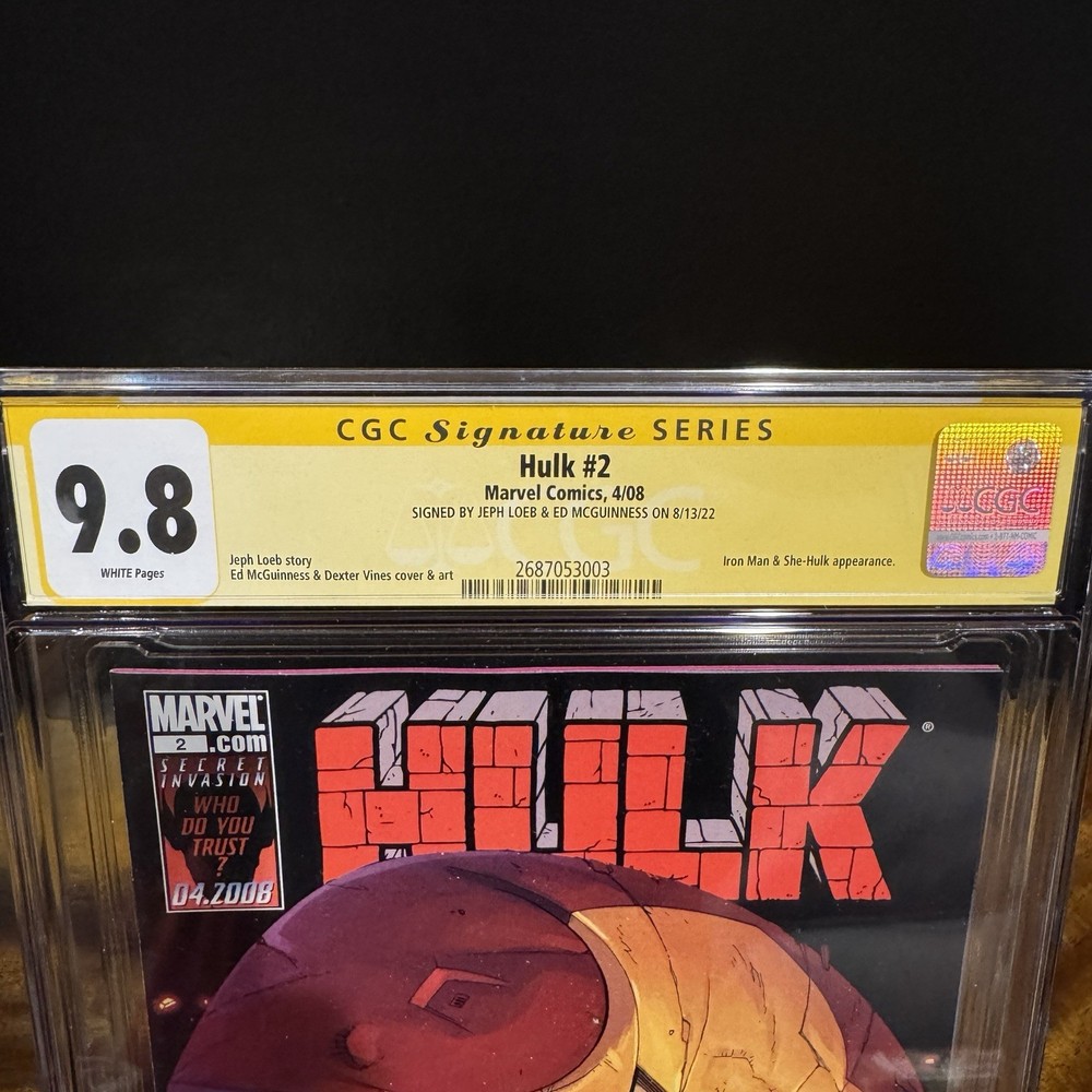 The product is a Hulk #2 CGC 9.8 comic book featuring the first full appearance of the Red Hulk, signed by artists Jeph Loeb and Ed McGuinness. This single issue from Marvel Comics, published in 2008 during the Modern Age era, is a highly collectible item in the world of US Comics. With a near mint/mint grade from Certified Guaranty Company (CGC), this comic book is a must-have for fans of the Hulk character and superheroes in general. The cover art by Ed McGuinness adds to the appeal of this sought-after piece.