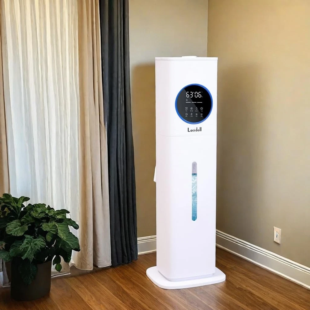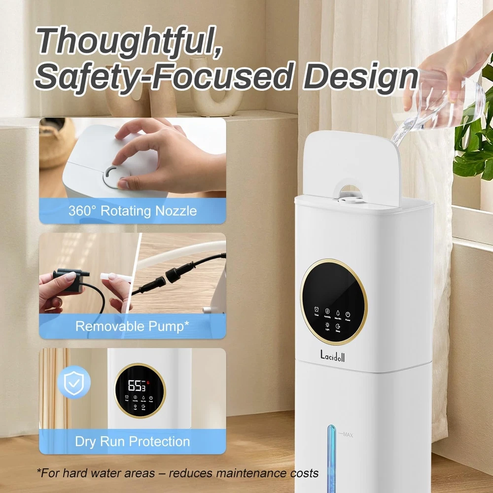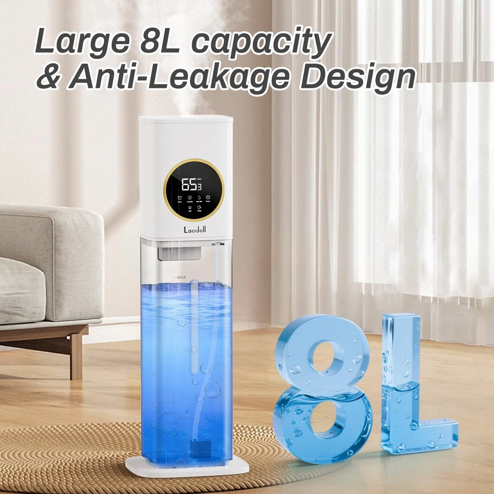 Product description Previous page Next page What room size is this humidifier suitable for? The medium units are ideal for around 500-800 sq. ft. Is there a risk of leakage with this humidifier? High-quality, well-sealed humidifiers are designed to reduce leakage risks. Top-fill models are often more effective at preventing leaks. Should I use distilled or tap water in the humidifier? To reduce white dust, we recommend using filtered water; our product features a replaceable water pump design, specifically for users in areas with hard/tap water. The humidifier shows a "water shortage" alert when there is water in the tank? If the humidifier displays "low water" despite having water, the pump may be clogged. Please reach out to us promptly for a pump replacement or purchase a new pump by searching ASIN: B0FW5233VB. How can I purchase a replacement pump? Please search for the ASIN: B0FW5233VB to make the purchase. LACIDOLL HUMIDIFER LARGE ROOM 8L humidifier for bedroom Add to Cart 8L humidifier for bedroom Add to Cart 8L easy clean humidifier Add to Cart 16L humidifier large room Buying Options 21L humidifier whole home Buying Options Customer Reviews 4.2 out of 5 stars 620 4.3 out of 5 stars 690 — 4.4 out of 5 stars 635 4.1 out of 5 stars 1,325 Price $79.99 $ 79 . 99 $79.99 $ 79 . 99 $75.99 $ 75 . 99 $139.99 $ 139 . 99 $189.99 $ 189 . 99 Capacity 2.1gal 2.1gal 2.1gal 4.2gal 5.5gal Area cover 800 sq ft 800 sq ft 500 sq ft 1500 sq ft 2000 sq ft Max mist output 300ml/H 300ml/H 300ml/H 800ml/H 1500ml/H Night light ✔ ✔ ✔ ✔ ✘ Timer ✔ ✔ ✔ ✔ ✔ Target humidity ✔ ✔ ✔ ✔ ✔ Sleep mode ✔ ✔ ✔ ✔ ✔ No water auto off ✔ ✔ ✔ ✔ ✔ remote ✔ ✔ ✔ ✔ ✔ extention tube ✘ ✘ ✘ ✔ ✔ On Jan 11, 2026 at 22:33:09 PST, seller added the following information:
