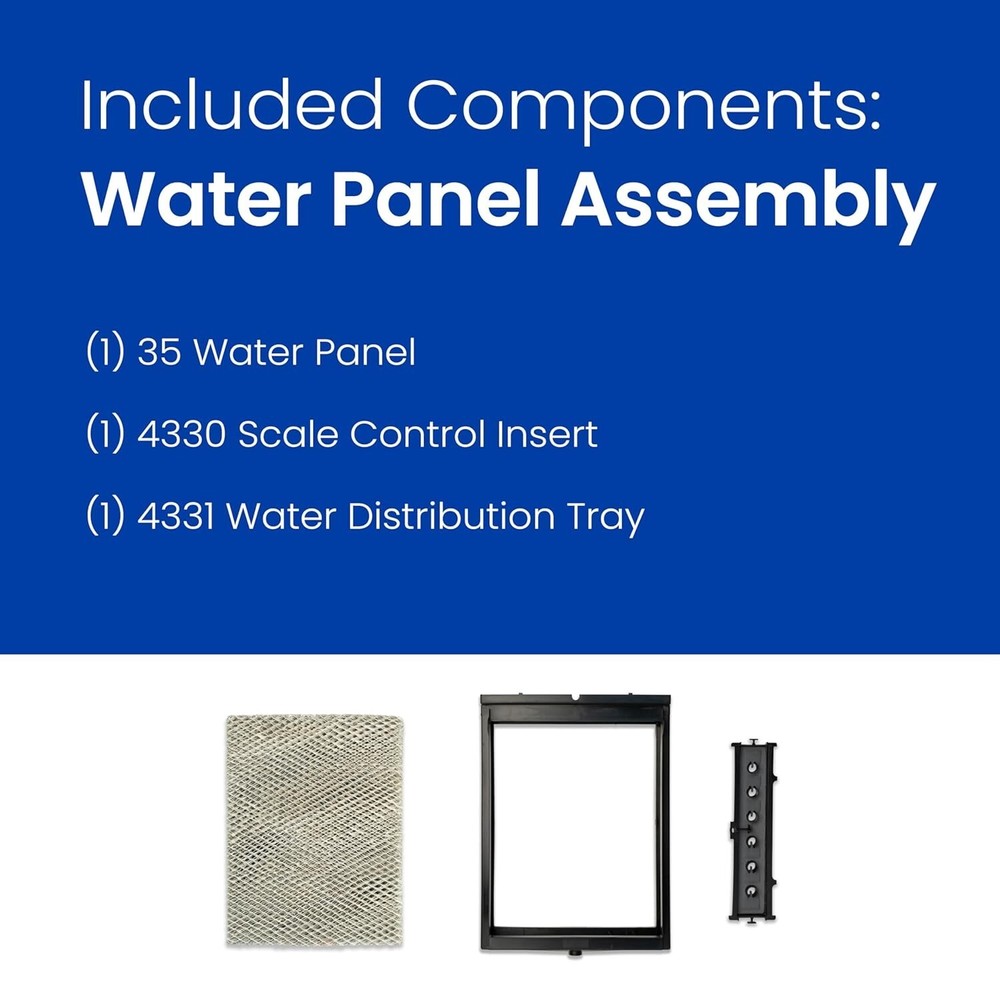 Humidifier Maintenance Kit with Water Panel Model No. 35 Humidifier Filter for Whole-House Humidifier Models: 600, 600A, 600M BUY WITH CONFIDENCE: This genuine Humidifier Maintenance Kit was designed and manufactured in the USA by – the inventor of the Whole Home Evaporative Humidifier and the leader in indoor air quality solutions, to optimize the performance of your Whole Home Humidifier and make it like new COMPLETE MAINTENANCE KIT: No need to find the parts yourself! This kit contains all components required to maintain peak performance of your Whole Home Humidifier, models 600, 600A, 600M. Reference Owner's Manual included with all Humidifier Maintenance Kits before performing humidifier maintenance. MAINTENANCE KIT INCLUDES: Water Panel (35), Scale Control Insert (4330), Water Distribution Tray (4331), Feed Tube with Compression Sleeve and Nut (4335), Yellow Orifice (4231), In-line Strainer (4004), Drain Spud (4223), Owner's Manual PERFECT FIT: Water Panel actual dimensions - 13" H x 10" W x " W - for optimal performance replace water panel annually HUMIDITY FOR HEALTH Humidifiers can help you maintain optimal humidity in your home of 40% – 60% which has been shown to reduce the incidence of respiratory infections and symptoms related to allergies and asthma by minimizing the formation of bacteria and viruses, fungi, and dust mites. In addition, you’ll feel more comfortable while also preserving items in your home susceptible to damage from changing humidity or dry conditions introduced the first evaporative humidifier for forced air furnace systems back in 1954. Since that time, continues to lead the industry in whole home humidification systems. Our evaporative humidifiers work by piping water into the distribution tray located at the top of the humidifier. The water is uniformly distributed across the width of the tray and through a scientifically designed system of outlets. It flows by gravity over the Water Panel evaporator. Dry, hot air from the forced air furnace moves through the moisture-laden Water Panel evaporator. Natural evaporation takes place, meaning the water is turned to vapor, and the humidified air is circulated throughout your home. This Humidifier Maintenance Kit contains all components for step-by-step maintenance of your Whole Home Humidifier, models 600, 600A, 600M.
