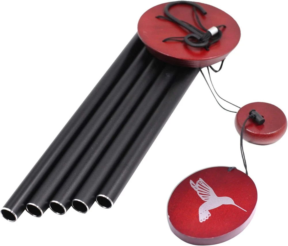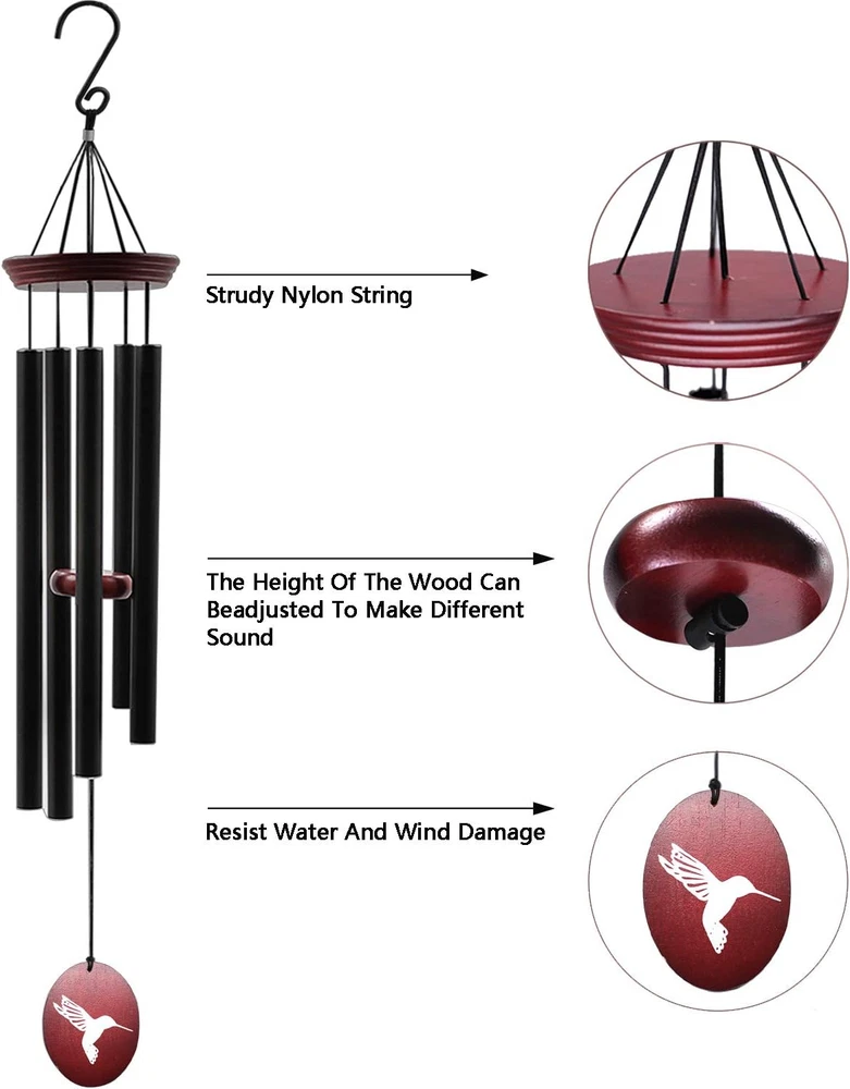 Unique Hummingbird Design: Our outdoor wind chimes feature a 33-inch height from hanging hook to bottom wind catcher, with a 5-inch wide suspension platform. The hard aluminum tubes are coated in black matte color, and the longest tube measures 14.5 inches. The catcher is printed with a hummingbird design, adding a touch of elegance to your garden, yard, or patio. Premium Quality: Our wind chimes are crafted with high-quality materials, including waterproof coating, corrosion-resistant nylon strings, and sturdy aluminum pipes. This ensures that your wind chime stays beautiful and functional for a long time. Soothing Sound: Each tube is precision-tuned to a pentatonic scale, producing peaceful melodies that relax and soothe your mind and body. Simply hang the chime in the breeze, and enjoy the beautiful sounds it creates. Memorial Gifts: Perfect for Mother's Day, Christmas, or any special occasion, these wind chimes make a thoughtful gift for loved ones. Customize yours to show how much you care, and give the gift of serenity and beauty. Versatile Decoration: At 33 inches, these wind chimes are the perfect size for outdoor or indoor decoration. They add a touch of elegance to your patio, garden, yard, or home. The included S hook makes it easy to hang anywhere. Earth-Friendly & Sustainable: We care about the environment and use eco-friendly materials and packaging to minimize our carbon footprint. Product Description Musical wind chimes- Each tube is precision tuned to pentatonic scale. Enjoy peaceful melodies that play as a whisper in the wind - deep, rich and full of beauty. They sound lovely and will relax your mind and body. Unique design perfect for the patio, garden, and anywhere you wish to add beautiful melodies to your environment, NOW Bring This Classic Wind Chimes Home Today Premium Wind Chimes Nice Sound wind chime strings are more corrosion-resistant nylon material Different Design for you choose Unique Outdoor Wind Chimes Design- 33-inch height from hanging hook to bottom wind catcher. The suspension platform is 5 inches wide .5 hard aluminum tubes covered with black matte color, and the longest tube’s size is 14.5 inch. it fits your garden, yard, also to your friend’s. Perfect Gifts This wind chimes are beautiful enough and gifts for people who loss of loved ones Quality Materials 5 hard aluminum tubes covered with black matte color, and the longest tube’s size is 14.5 inch Quality Materials Unique Dragonfly Outdoor Wind Chimes Design Adjustable The Height of The Wood Can Be adjusted to Make DifferentSound Wind chimes outdoor sympathy gifts-This memorial wind chime is not only suitable for patio, garden, yard décor, but also perfect gifts choice for Mother’s Day, Christmas. You can order this chime as gifts for your family, friends, neighbors. Everybody want to enjoy a Beautiful and lasting gift, you will not let them down.
