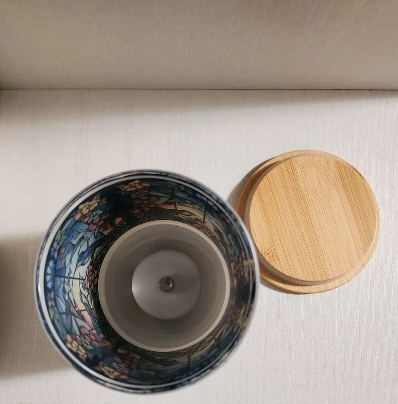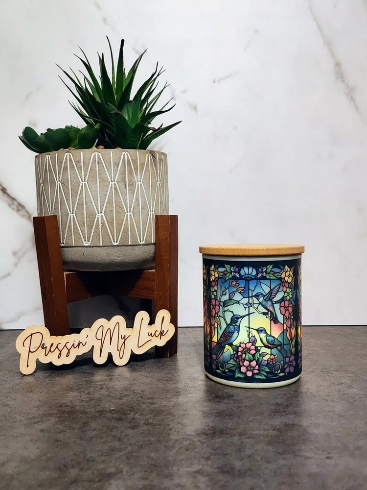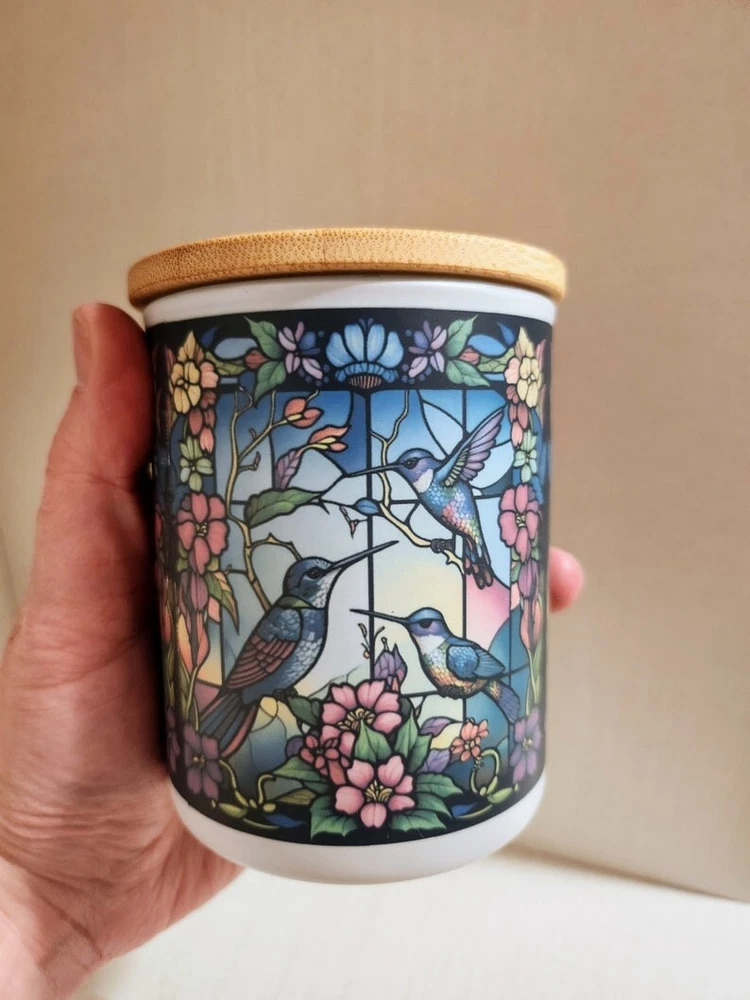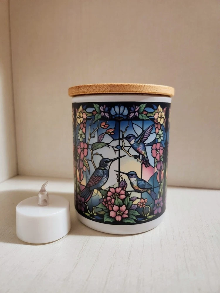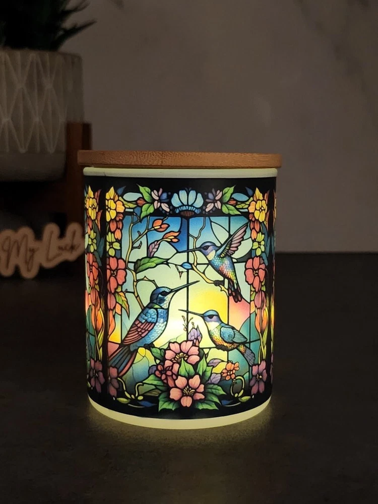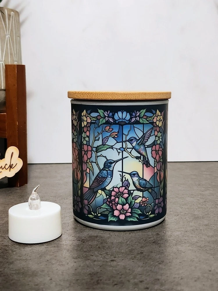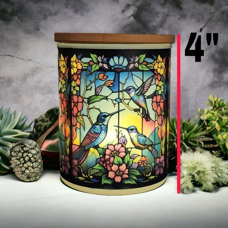This beautiful hummingbird designed glass jar is beautiful when the battery operated tea flickering tea light is on. Comes with a simple to use battery tea light that sits inside. This jar also comes with a bamboo lid. Design is hand pressed with sublimation ink. Approximately 4 Inches Tall with bamboo lid on 3.25 inches in diameter Rotating display not included