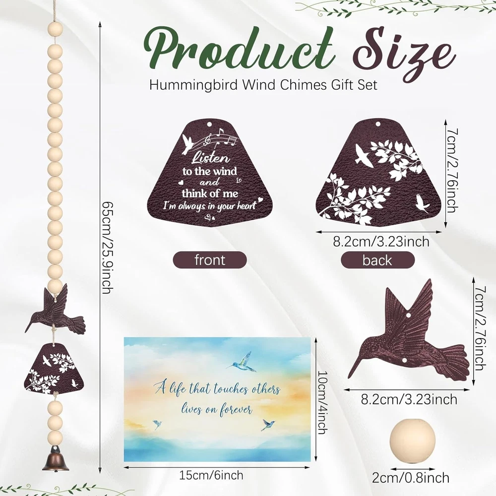 Hummingbird Wind Chimes for Loss of Loved One Sympathy Memorial Gift Bereavement Condolence Remembrance Windchimes for Mother Father Garden Patio Porch Window Funeral Hanging Ornament Decor Please note- This listing is not applicable for additional personalization on the wind sail. Complete Memorial Gift with Additional Items: each package includes a hummingbird wind chime, a pack of raffia, and a sympathy card; These items not only offer quality but also considerately takes care of all the necessary details, making it a thorough and meaningful memorial wind chimes gift, a thoughtful expression of support for a friend or loved one in need Unique Hummingbird and Exquisite Material: the sympathy gift boasts the unique hummingbird design, beautifully symbolizing strength, hope and comfort, featuring the hummingbird charm and pendant with meaningful words; Crafted from durable metal, the hummingbird wind chime is an ideal outdoor decoration that can stand up to the elements; This quality material ensures that the charm of the hummingbird windchimes does not wither, making it a lasting bereavement gift to remember the dear departed by Exquisite Sympathy Card for Personalization: our bereavement gifts include a card made of 300g coated paper, about 5.91 x 3.94 inches in size; It comes with moving words, calming patterns, and a blank back for you to add a personalized message; Coupled with the hummingbird windchimes, they create a heartfelt packaged gift to pass on sympathetic messages Relaxing Melody and Classic Colors: the hummingbird wind chimes for loss of loved one produce soothing and relaxing melodies, which offer solace and tranquility; In a classic color that complements any decoration style, these memorial wind chimes are not only a beautiful keepsake but also a captivating decor piece that can be placed anywhere, such as garden, patio, porch, window and more Versatile Usage and Meaningful Gift: our sympathy gifts can be applied in various ways; They can serve as a beautiful decor element, as a soothing, musical windchime under the soft breeze, or as a meaningful gift for your close people, sympathetically communicating your condolences, heartfelt expression of support and kindness Features:The memorial windchimes for loss of loved one serve as a beautiful boho decoration, fitting seamlessly with any aesthetics. With its unique design and classic color, it creates an atmosphere of charm and elegance, enhancing the beauty of any living space.Our bereavement gifts go beyond being just keepsakes. Measuring about 30.3 inches, with the hummingbird of about 2.68 inches, the pendant of about 2.76 inches, this hummingbird wind chime for loss of a loved one is designed to comfort those who are grieving.Specifications:Material:Hummingbird wind chimes: metalSympathy card: 300g coated paperColor: classic colorSize:Hummingbird wind chimes: about 30.3 inches/ 77 cmPendant: about 2.76 inches/ 7 cmHummingbird: about 2.68 inches/ 6.8 cmSympathy card: about 5.91 x 3.94 inches/ 15 x 10 cmPackage includes:1 x Hummingbird wind chimes1 x Raffia1 x Sympathy card Hummingbird Wind Chimes for Loss of Loved One Sympathy Memorial Gift Bereavement Condolence Remembrance Windchimes for Mother Father Garden Patio Porch Window Funeral Hanging Ornament Decor Please note- This listing is not applicable for additional personalization on the wind sail. Complete Memorial Gift with Additional Items: each package includes a hummingbird wind chime, a pack of raffia, and a sympathy card; These items not only offer quality but also considerately takes care of all the necessary details, making it a thorough and meaningful memorial wind chimes gift, a thoughtful expression of support for a friend or loved one in need Unique Hummingbird and Exquisite Material: the sympathy gift boasts the unique hummingbird design, beautifully symbolizing strength, hope and comfort, featuring the hummingbird charm and pendant with meaningful words; Crafted from durable metal, the hummingbird wind chime is an ideal outdoor decoration that can stand up to the elements; This quality material ensures that the charm of the hummingbird windchimes does not wither, making it a lasting bereavement gift to remember the dear departed by Exquisite Sympathy Card for Personalization: our bereavement gifts include a card made of 300g coated paper, about 5.91 x 3.94 inches in size; It comes with moving words, calming patterns, and a blank back for you to add a personalized message; Coupled with the hummingbird windchimes, they create a heartfelt packaged gift to pass on sympathetic messages Relaxing Melody and Classic Colors: the hummingbird wind chimes for loss of loved one produce soothing and relaxing melodies, which offer solace and tranquility; In a classic color that complements any decoration style, these memorial wind chimes are not only a beautiful keepsake but also a captivating decor piece that can be placed anywhere, such as garden, patio, porch, window and more Versatile Usage and Meaningful Gift: our sympathy gifts can be applied in various ways; They can serve as a beautiful decor element, as a soothing, musical windchime under the soft breeze, or as a meaningful gift for your close people, sympathetically communicating your condolences, heartfelt expression of support and kindness Features: The memorial windchimes for loss of loved one serve as a beautiful boho decoration, fitting seamlessly with any aesthetics. With its unique design and classic color, it creates an atmosphere of charm and elegance, enhancing the beauty of any living space. Our bereavement gifts go beyond being just keepsakes. Measuring about 30.3 inches, with the hummingbird of about 2.68 inches, the pendant of about 2.76 inches, this hummingbird wind chime for loss of a loved one is designed to comfort those who are grieving. Specifications: Material: Hummingbird wind chimes: metal Sympathy card: 300g coated paper Color: classic color Size: Hummingbird wind chimes: about 30.3