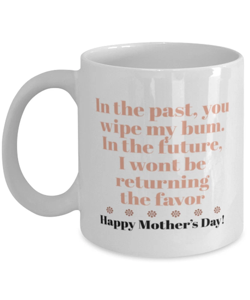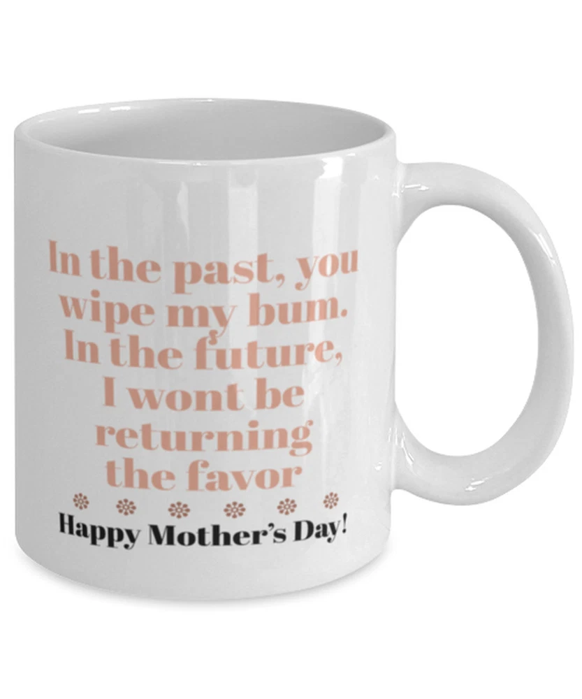 Humor Mom Coffee Mug In The Past You Wiped My Bum In The Future I Won't Be Mug Product Details.. This high quality 11oz. ceramic white mug has a premium hard coat that provides crisp and vibrant color reproduction sure to last for years. Perfect for all hot & cold beverages. The highest quality printing possible is used. It will never fade no matter how many times you wash it. Material: 100% Ceramic. Print both sides. Dishwasher and Microwave Safe. High Gloss + Premium White Finish. Printed in the U.S.A. Personalized & Custom. We support personalized and custom mug to add custom, when placing an order, you can add notes to the "order note" in shipping address section. Also you can contact us directly via message. Shipping Info. Ready to ship in 1 to 2 business days, All products are made-to-order and proudly printed in the United States. Shipped by USPS and DHL, You will receive your order in 5-7 days. Replace & Refund. All products are defective during shipping broken, chipped will be replaced free of charge. You are not satisfied with the product, we will refund 100% money to you. If any other issues arise, please do not hesitate to message, we would be more than happy to assist you.