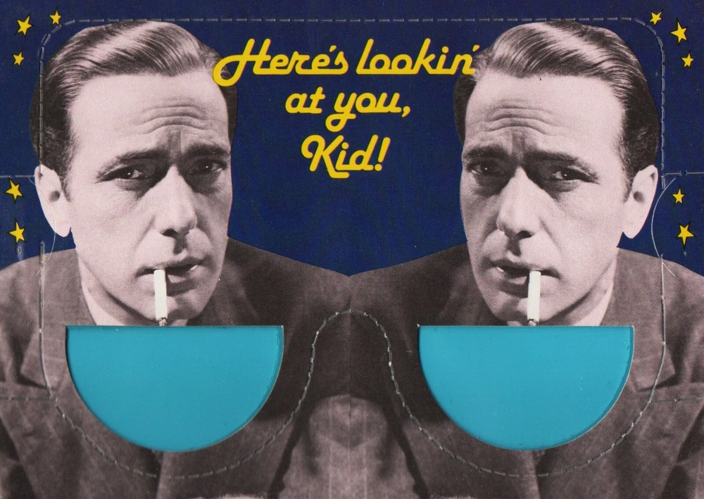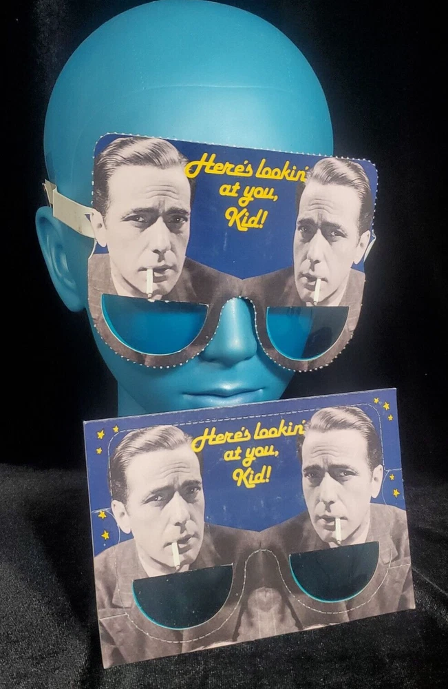 Humphry Bogart, Smoking "Here's Lookin at you Kid"! Transforming Suncard Postcard. ©1985 The American Postcard Company. "4.5"x6.25". Slightly larger than standard Continental cards. This card folds out into non-eye protective novelty sunglasses with blue tint windows. Listing is for 1 card. I have shown two in my picture's to show an example of card after assembly. Your card will be NOS and un-assembled. Please see all our retro-vintage cards and postcards from the now defunct American Postcard Company. I believe we have the largest selection on NOS American Postcard company cards available anywhere. Please contact us for custom bundles if you are interested. Volume price set to on. Vintage postcards may have small differences ie; yellowing of paper, slightly worn edges or corner blunts. Basic wear from storage of vintage paper and cardboard items. items. I will always send the best quality card I have. The picture is of a postcard like the one you will receive not necessarily the one you will receive. I will never send a bent, ripped or damaged card unless specifically mentioned. I always inspect every item I send out for quality and ship with care, how I would like to receive an item. Please message me with any questions or concerns. Thank you.