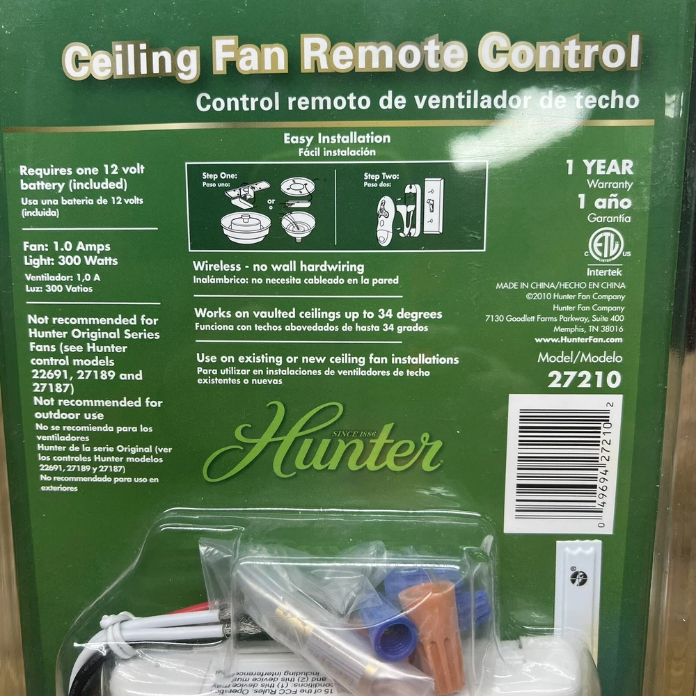 The Hunter Ceiling Fan Remote Control Model 27210 is a versatile and convenient device that works with all brands of ceiling fans. It features 3-speed settings and is wall-mounted for easy access. The remote control is powered by batteries and has a clean, white plastic design that seamlessly blends into any indoor installation area. With a universal compatibility, this remote control by Hunter is a reliable and efficient solution for controlling the speed of ceiling fans with ease.