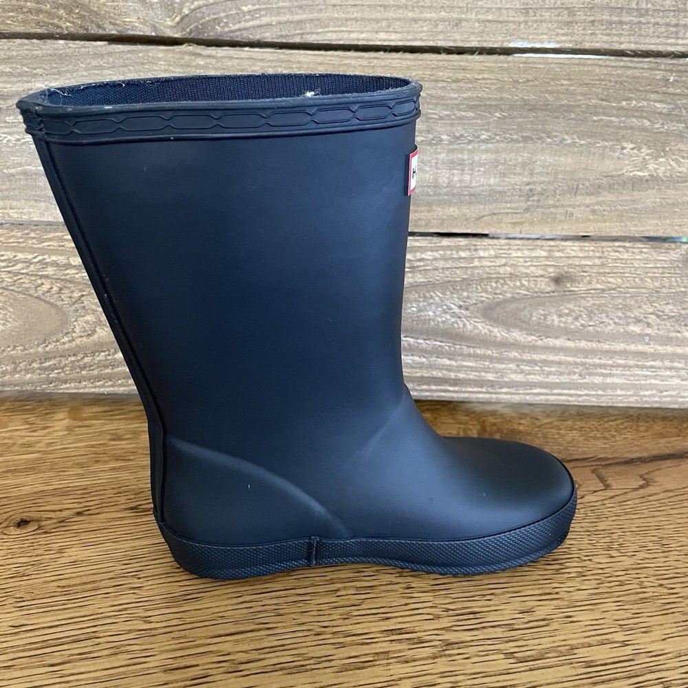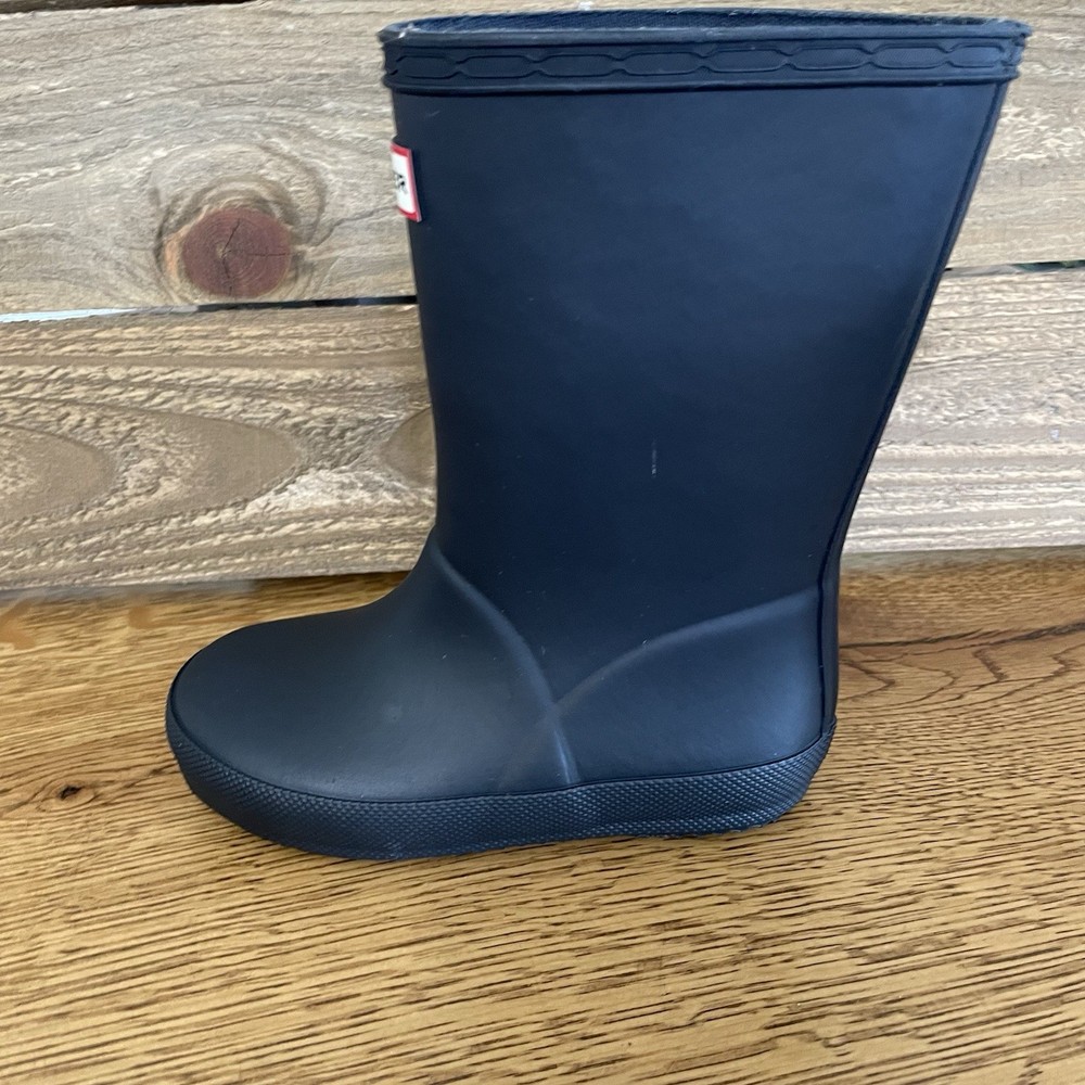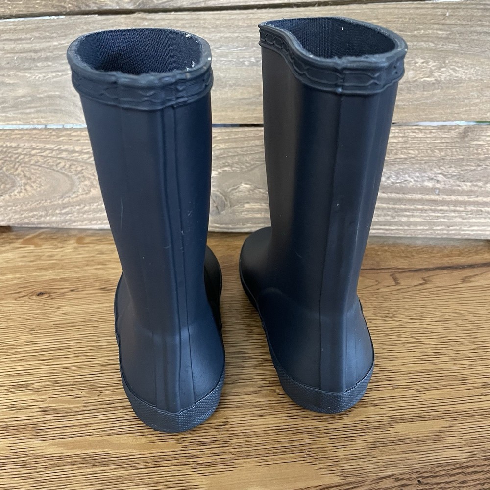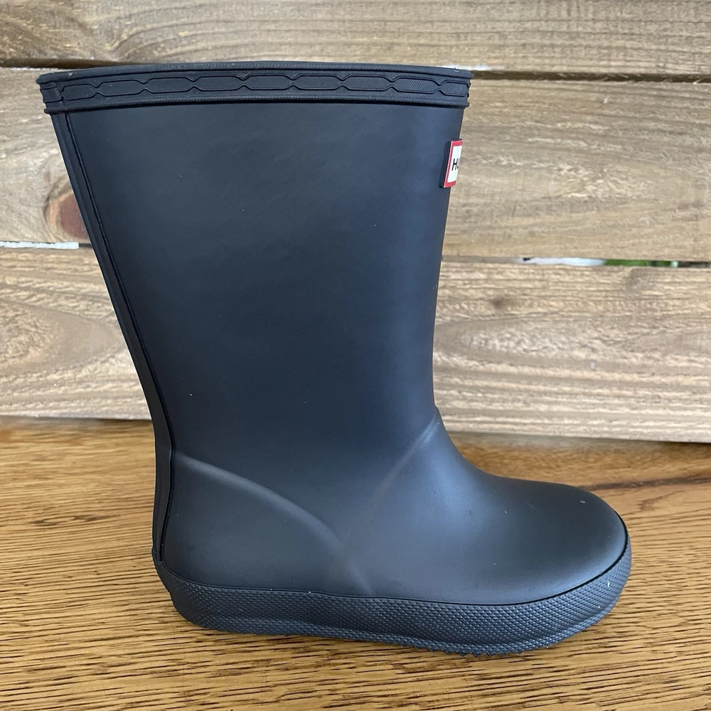 The Hunter First Classic Rain Boots in black are durable and waterproof, perfect for all seasons. With a round toe shape and pull-on closure, these boots are easy to put on and take off. The classic rain boot style, along with the Hunter logo accents, make them both stylish and practical for any weather. Designed for kids in US size 10B/11A or UK size 9, these boots are sure to keep your little ones dry and comfortable in all types of rain.