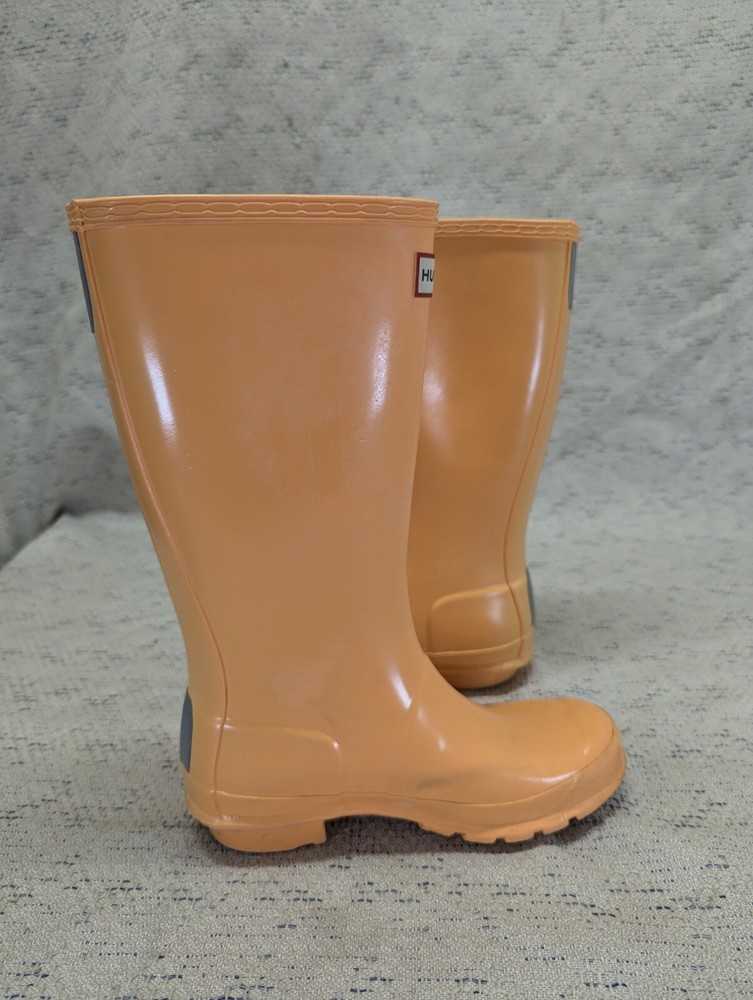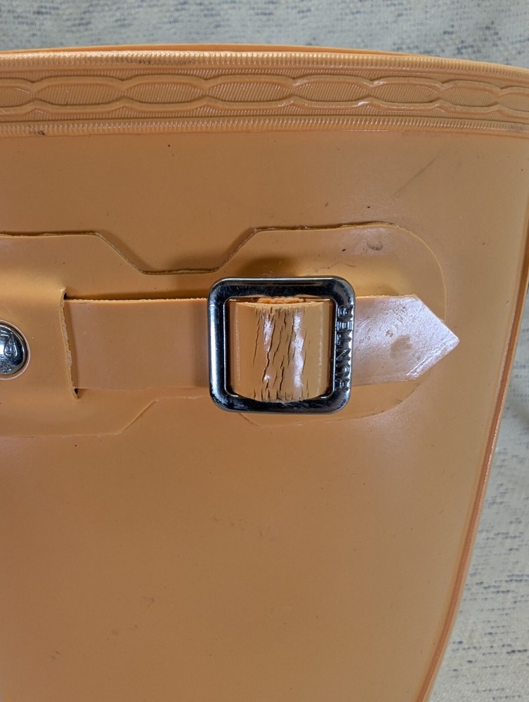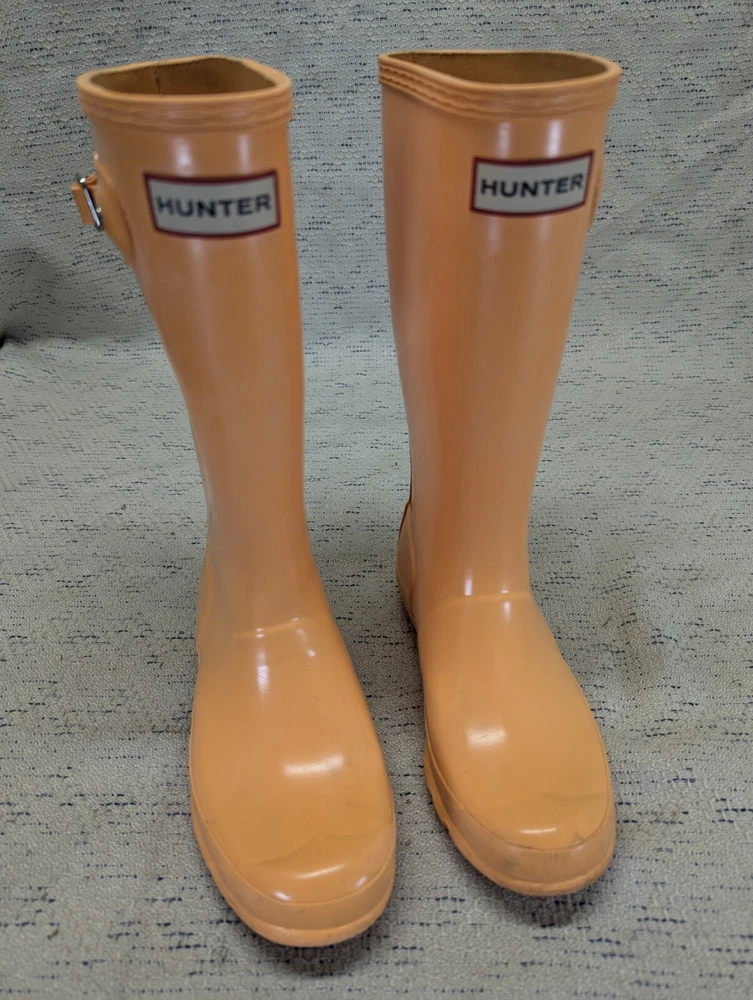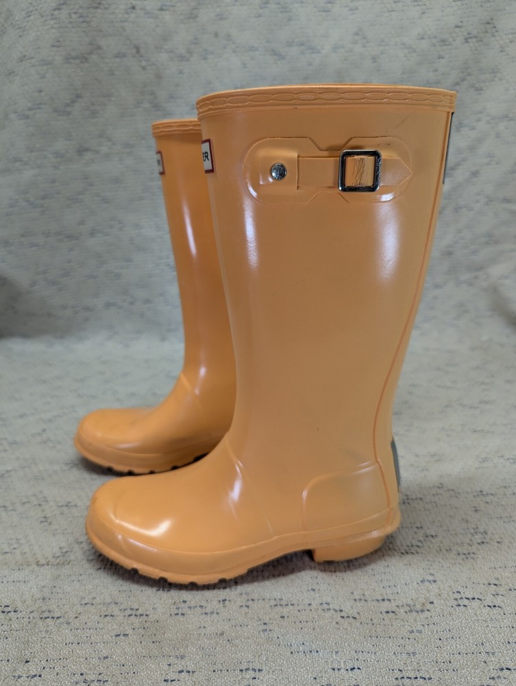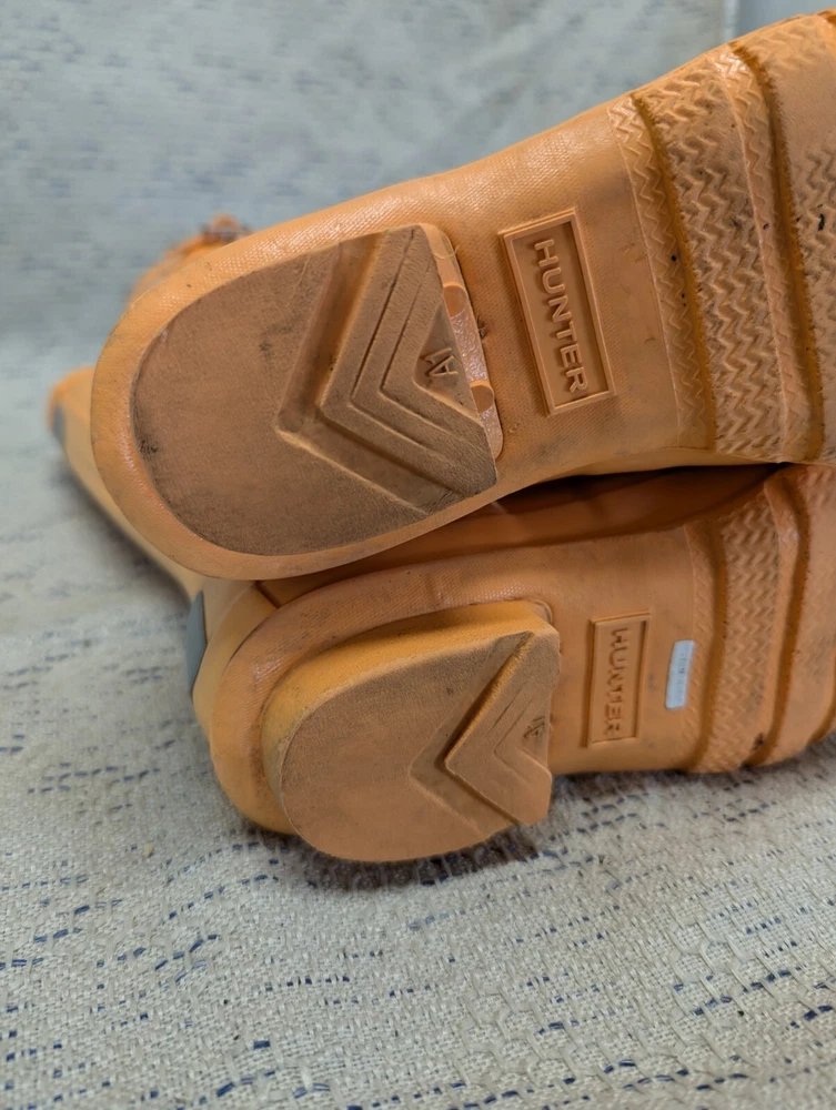 These Hunter Wellies are still in great shape—perfect for muddy adventures! The orange color is bright and fun, and the buckles add a cool touch. There’s some wear on the tread and a cracked strap, but they’re totally sturdy for playtime. My kid loves them!