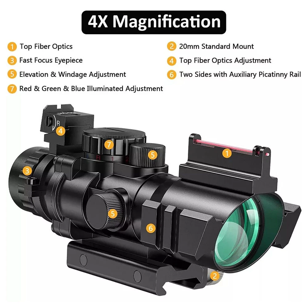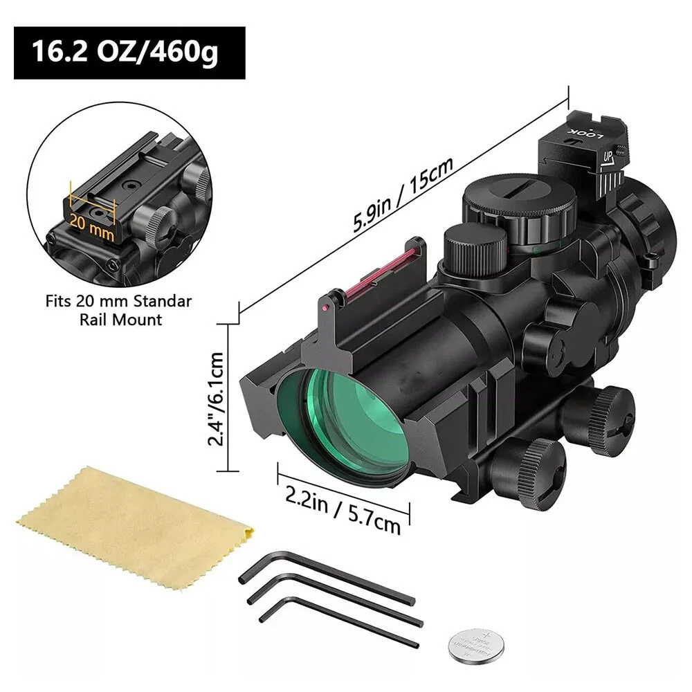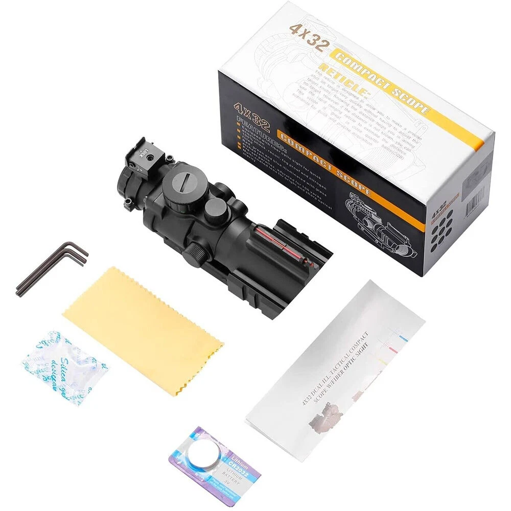 45 Degree Offset 1 inch Side Mount Holder Flashlight Laser Weaver Picatinny Rail 11.9 USD Free shipping QD 3 Slots 0.5" Low Profile Compact Riser Rail Mount Rifle Scope Picatinny Rail 12.9 USD Free shipping 3 Slots 1" Scope Riser Mount Fit Picatinny Weaver Rail for Optics Red Dot Sight 12.9 USD Free shipping 2 Pack For Mossberg 500 Remington 870 12GA 1" Tube Picatinny Weaver Laser Mount 17.9 USD Free shipping 1" High Profile Compact Riser Mount 3 Slot Fit Riflescope Picatinny Weaver Rail 13.59 USD Free shipping Rifle Scope Mount 1" 25.4mm / 30mm Picatinny Rail Flap Top Dual Rings Cantilever 21.95 USD Free shipping 3 Slots Compact Riser Mount for Scopes- Low/Medium/High Profile Picatinny Rail 13.49 USD Free shipping 1 INCH/30mm or 34mm Barrel Scope Ring Mount Adapter 20mm Weaver Picatinny Rail 13.59 USD Free shipping Ultralight Flip Up Sight 45 Degree Offset Rapid Transition Front and Backup Rear 21.9 USD Free shipping Scope Barrel Mount 1" - 25mm & 30mm Ring Adapter with 20mm Weaver Picatinny Rail 12.9 USD Free shipping 1" inch See Through Riser Scope Rail Mount Base Large 14 Slots Picatinny Weaver 16.95 USD Free shipping 1Inch/ 30mm Dual Ring Cantilever Rifle Scope Mount Rings for 20mm Picatinny Rail 21.96 USD Free shipping QD 3 Slots 0.83" Medium Profile Compact Riser Mount Scope Weaver Picatinny Rail 13.59 USD Free shipping 2 Pack 1" Offset 45 Degree Ring Side Mount Picatinny Rail for Scopes Laser Sight 17.99 USD Free shipping 1/2 Pcs QD 1" / 30mm High Profile Rifle Scope Ring Mount Picatinny Weaver Rail 15.95 USD Free shipping Front and Rear Flip Up 45 Degree Offset Rapid Transition Backup Polymer Sight 22.59 USD Free shipping For Mossberg 500 Remington 870 12GA 1" Mag Tube Picatinny Laser Mount 2 Pack 17.9 USD Free shipping For Mossberg 500 Remington 870 12GA 1" Tube Picatinny Laser Torch Mount 12.9 USD Free shipping Product Description 4X32 Rifle Scopewith Fiber Optic Sights This compact tactical rifle scope is well suited for mid to long range shooting, with high optical clarity at four times magnification and a 32mm objective diameter. The BDC rapid ranging reticle is illuminated in red, green, or blue, and in multiple brightness intensities, for a suitable sight picture regardless of lighting or environment. Solid construction High grade coated optical glasses Fiber optic front sight and fully adjustable back up sight Fog, weather, and shock proof Two Picatinny accessory rail bases Spare batteries included for your convenience. Specifications Dimensions : 6"(length) x 2"(width)x2.75"(height) Weight : 16.2 oz Magnification : 4x Obj. Diameter : 32mm Brightness Control : Red : 3 levels / Green : 3 levels / Blue : 3 levels Reticle Type : Bullet Drop Compensator Eye Relief : 2 - 3.5" Filed of View : 100 yards of 36.5' Lens Coating : Green Power : 1 x CR2032 (included) Items Included One (1) 4X32 illuminated rifle scope w/ fiber optic sights Three (3) Allen keys One (1) cleaning cloth Two (2) CR2032 batteries