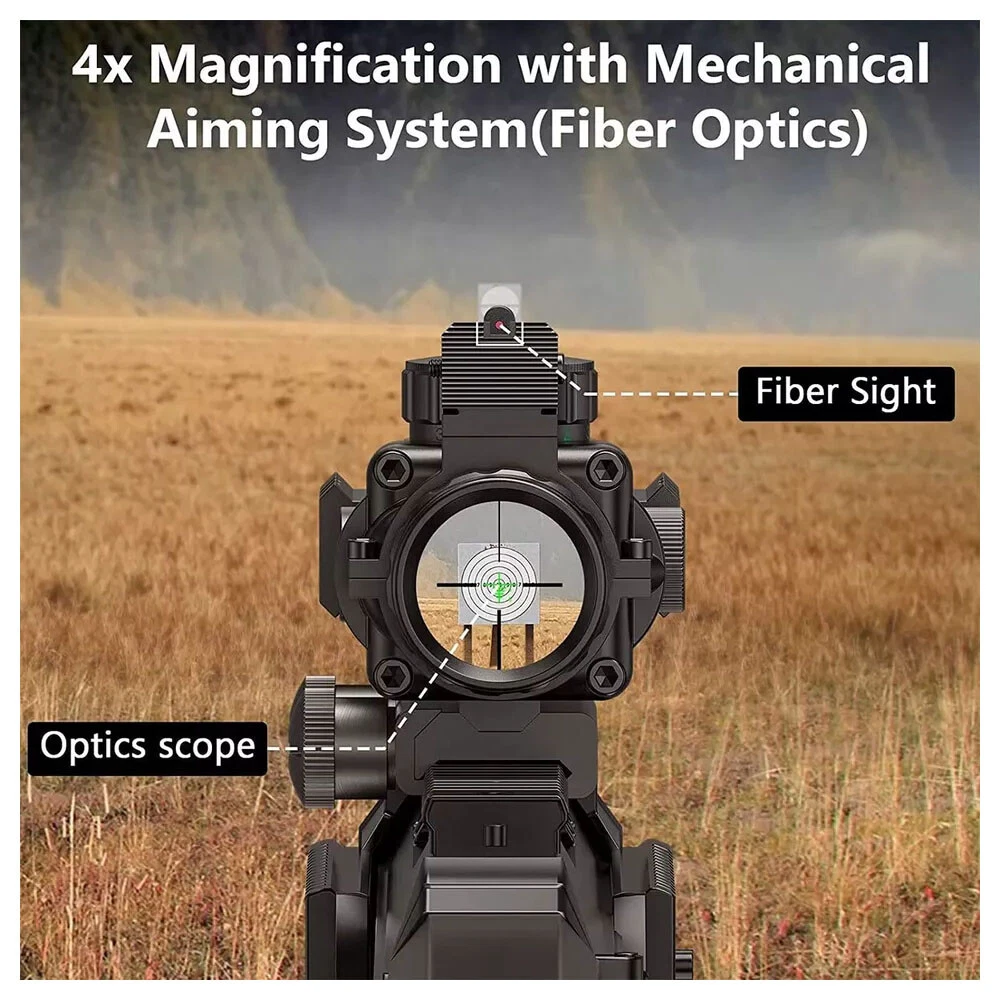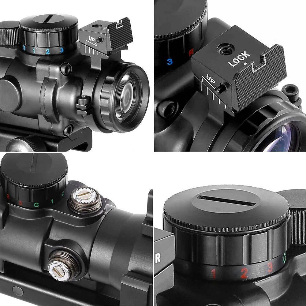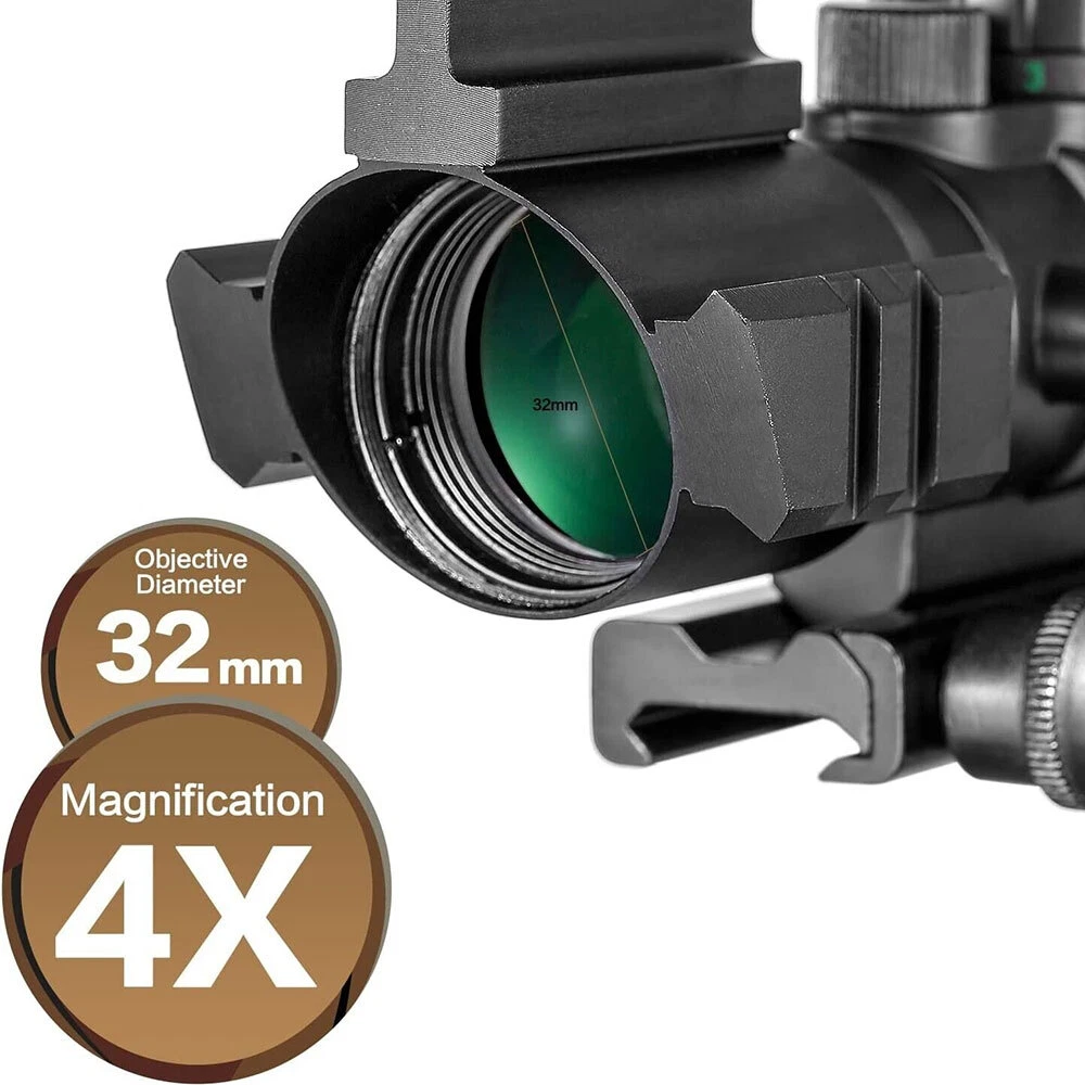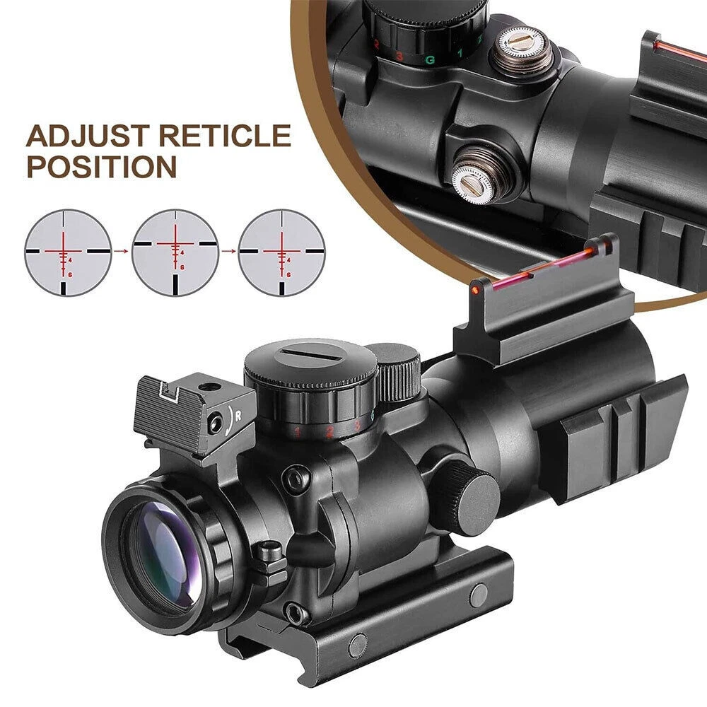 45 Degree Offset 1 inch Side Mount Holder Flashlight Laser Weaver Picatinny Rail 11.9 USD Free shipping QD 3 Slots 0.5" Low Profile Compact Riser Rail Mount Rifle Scope Picatinny Rail 12.9 USD Free shipping 3 Slots 1" Scope Riser Mount Fit Picatinny Weaver Rail for Optics Red Dot Sight 12.9 USD Free shipping 2 Pack For Mossberg 500 Remington 870 12GA 1" Tube Picatinny Weaver Laser Mount 17.9 USD Free shipping 1" High Profile Compact Riser Mount 3 Slot Fit Riflescope Picatinny Weaver Rail 13.59 USD Free shipping Rifle Scope Mount 1" 25.4mm / 30mm Picatinny Rail Flap Top Dual Rings Cantilever 21.95 USD Free shipping 3 Slots Compact Riser Mount for Scopes- Low/Medium/High Profile Picatinny Rail 13.49 USD Free shipping 1 INCH/30mm or 34mm Barrel Scope Ring Mount Adapter 20mm Weaver Picatinny Rail 13.59 USD Free shipping Ultralight Flip Up Sight 45 Degree Offset Rapid Transition Front and Backup Rear 21.9 USD Free shipping Scope Barrel Mount 1" - 25mm & 30mm Ring Adapter with 20mm Weaver Picatinny Rail 12.9 USD Free shipping 1" inch See Through Riser Scope Rail Mount Base Large 14 Slots Picatinny Weaver 16.95 USD Free shipping 1Inch/ 30mm Dual Ring Cantilever Rifle Scope Mount Rings for 20mm Picatinny Rail 21.96 USD Free shipping QD 3 Slots 0.83" Medium Profile Compact Riser Mount Scope Weaver Picatinny Rail 13.59 USD Free shipping 2 Pack 1" Offset 45 Degree Ring Side Mount Picatinny Rail for Scopes Laser Sight 17.99 USD Free shipping 1/2 Pcs QD 1" / 30mm High Profile Rifle Scope Ring Mount Picatinny Weaver Rail 15.95 USD Free shipping Front and Rear Flip Up 45 Degree Offset Rapid Transition Backup Polymer Sight 22.59 USD Free shipping For Mossberg 500 Remington 870 12GA 1" Mag Tube Picatinny Laser Mount 2 Pack 17.9 USD Free shipping For Mossberg 500 Remington 870 12GA 1" Tube Picatinny Laser Torch Mount 12.9 USD Free shipping Product Description 4X32 Rifle Scopewith Fiber Optic Sights This compact tactical rifle scope is well suited for mid to long range shooting, with high optical clarity at four times magnification and a 32mm objective diameter. The BDC rapid ranging reticle is illuminated in red, green, or blue, and in multiple brightness intensities, for a suitable sight picture regardless of lighting or environment. Solid construction High grade coated optical glasses Fiber optic front sight and fully adjustable back up sight Fog, weather, and shock proof Two Picatinny accessory rail bases Spare batteries included for your convenience. Specifications Dimensions : 6"(length) x 2"(width)x2.75"(height) Weight : 16.2 oz Magnification : 4x Obj. Diameter : 32mm Brightness Control : Red : 3 levels / Green : 3 levels / Blue : 3 levels Reticle Type : Bullet Drop Compensator Eye Relief : 2 - 3.5" Filed of View : 100 yards of 36.5' Lens Coating : Green Power : 1 x CR2032 (included) Items Included One (1) 4X32 illuminated rifle scope w/ fiber optic sights Three (3) Allen keys One (1) cleaning cloth Two (2) CR2032 batteries