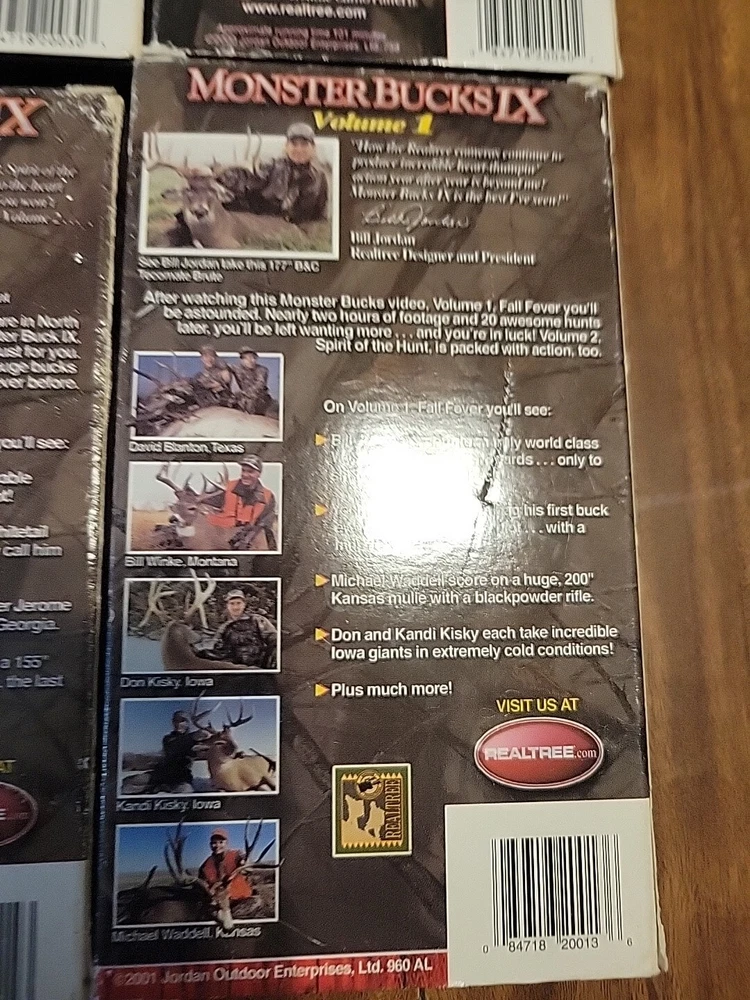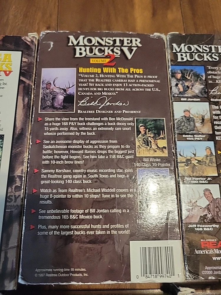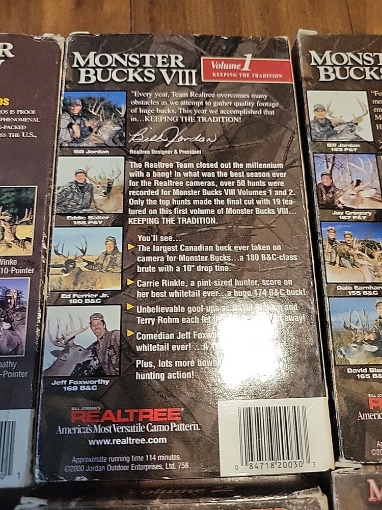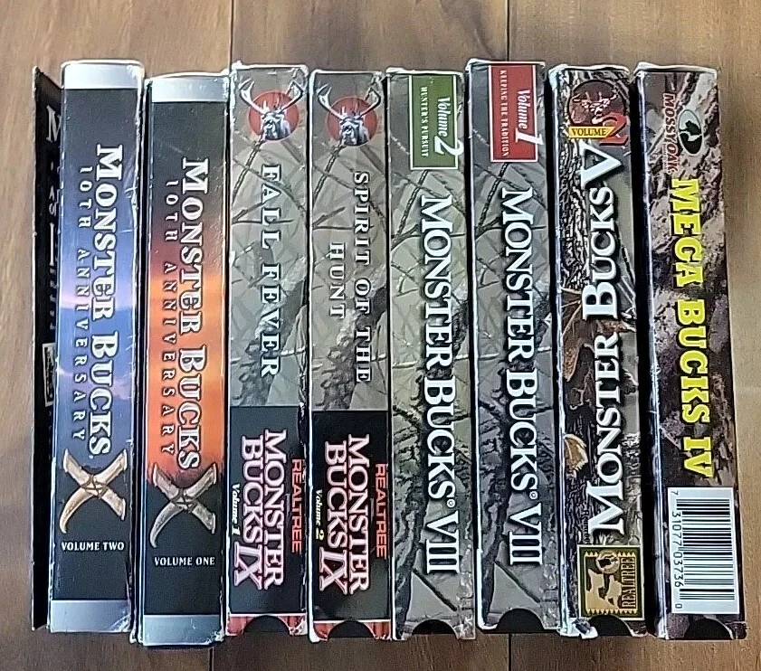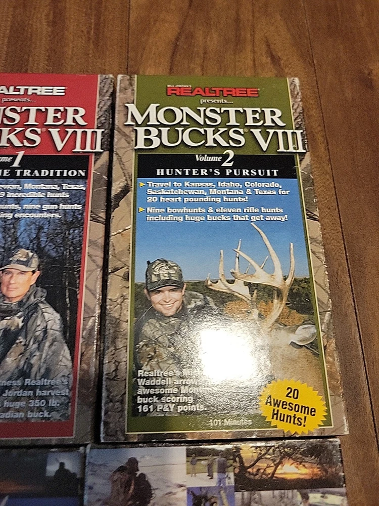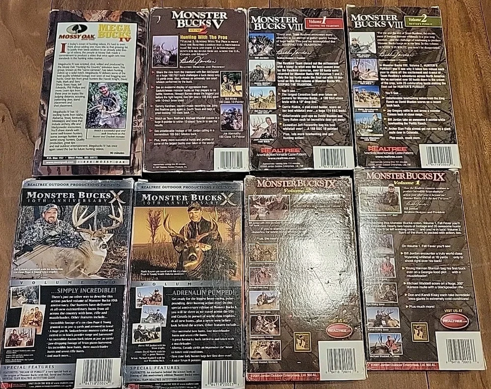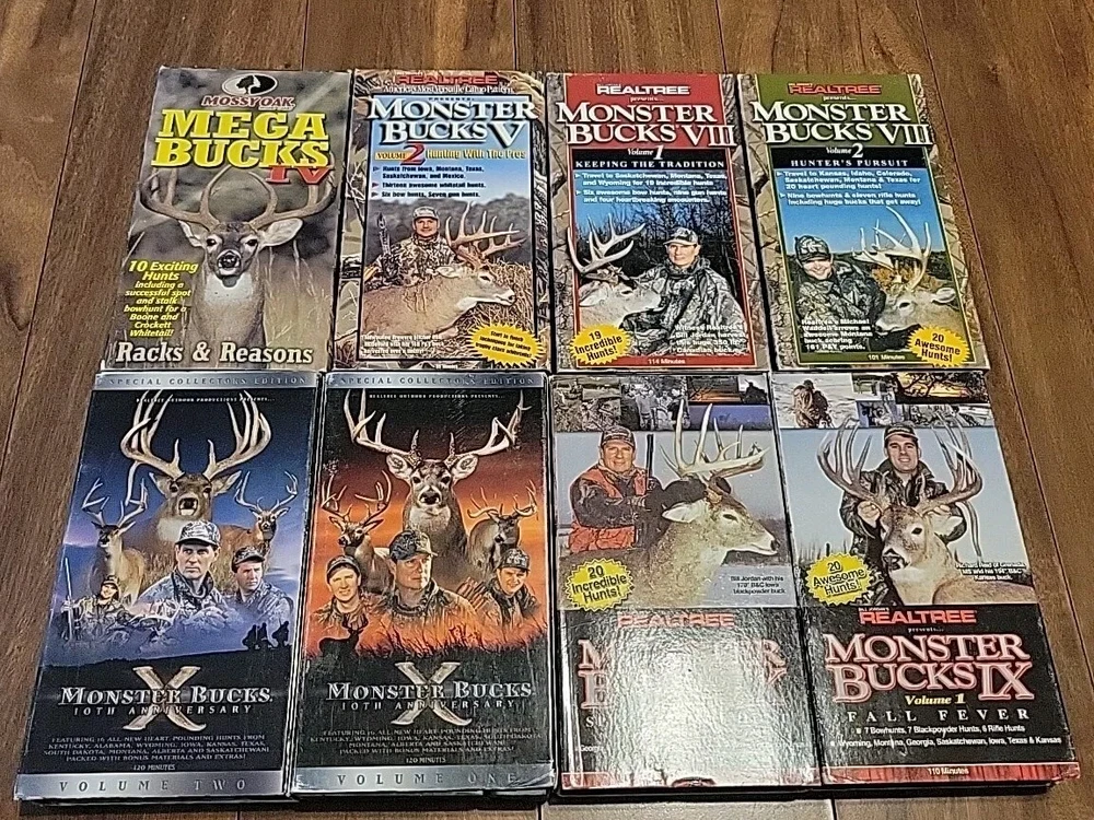 This lot of 8 VHS tapes is a must-have for any hunting enthusiast. Featuring footage of big game deer hunting, these vintage and rare tapes are a great addition to any collection. The Mega Bucks Box TS12 includes exciting footage of hunters in action and is sure to provide hours of entertainment. Whether you're an experienced hunter or just starting out, these tapes are a valuable resource for learning new techniques and strategies. Don't miss out on this opportunity to add some excitement to your hunting library. MONSTER BUCKSV HEALTREE MONSTER BUCKSIX FALL FEVER REALTREE MONSTER BUCKS MONS VOLUME MONSTER BUCKS ERSAR MOSSY OAK MEGA BUCKS MONSTER BUCKS VIII Volume KEEPING THE TRADITION REALTREE MONSTER BUCKS VIII 2 HUNTER'S PURSUIT 20 heart pounding hunts! 20 Incredibi Hunts REALTREE MONSTER BUCKSIX SPIRIT OF THE HUNT 10 Exciting Hunts and stel bowhunt for Bodne and Crockett Whitetaill